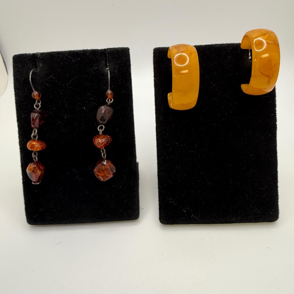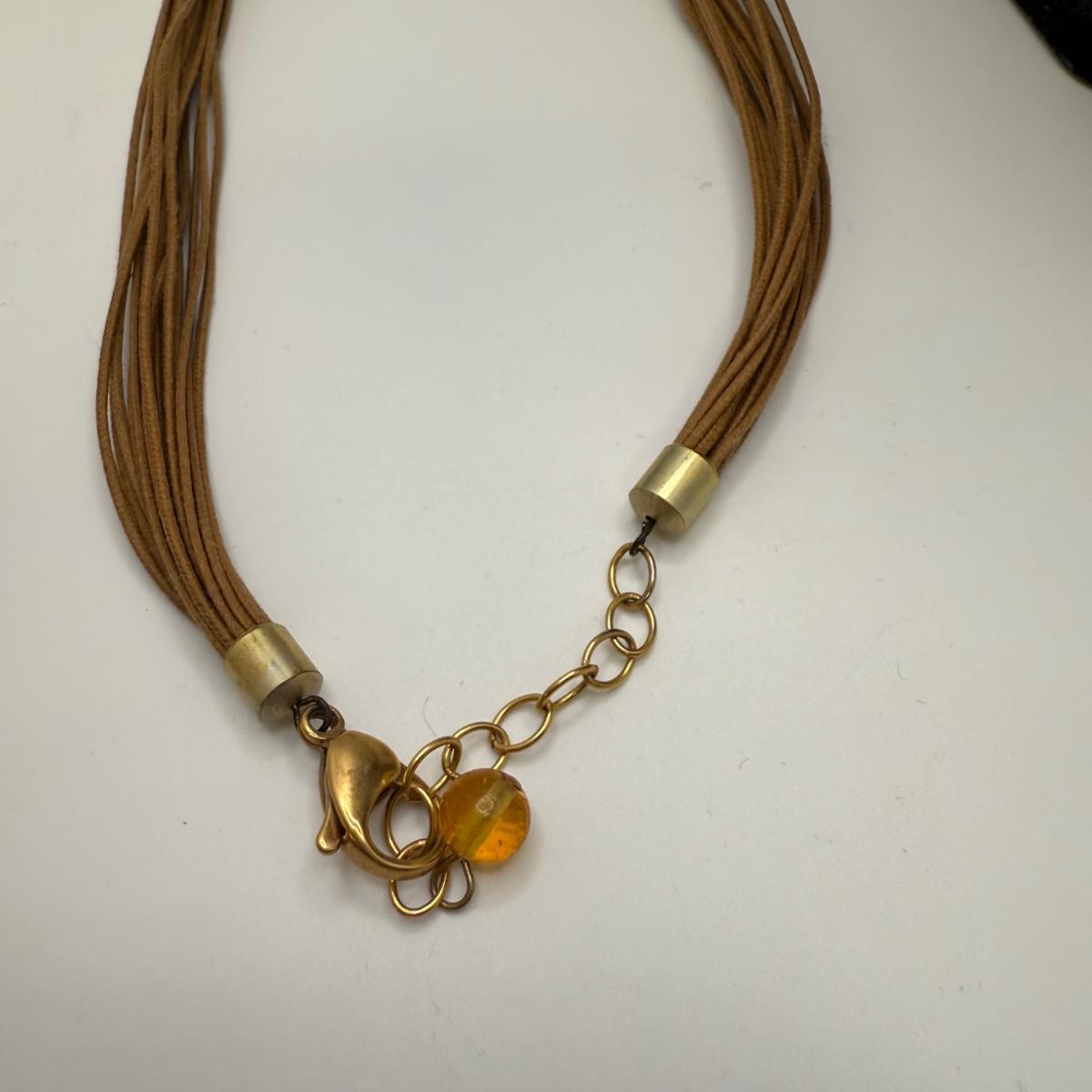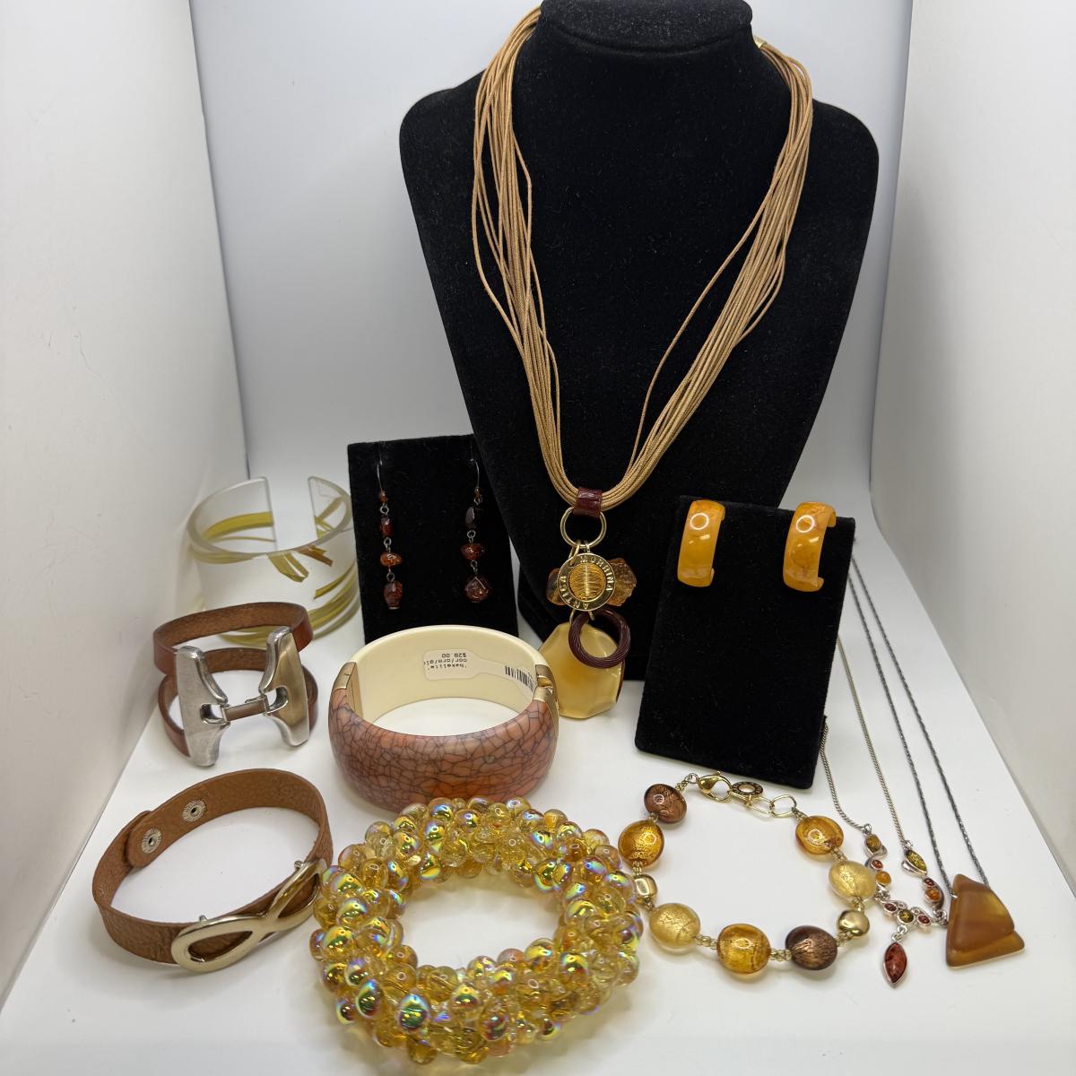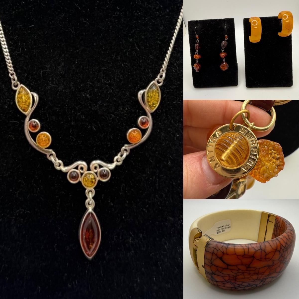 A collection of lovely amber-toned jewelry, including a couple items that appear to have real amber. Three necklaces, two pairs of earrings for pierced ears, and six bracelets. One necklace and one bracelet are stamped ‘Antica Murrina’. The necklace with the multi-color amber stones is stamped 925. And the third with the glass bead is labeled ‘Monet’. Bracelets include Bakelite, leather, iridescent beads, and the translucent cuff appears to have real natural material inside. Please note that one earring back is missing.