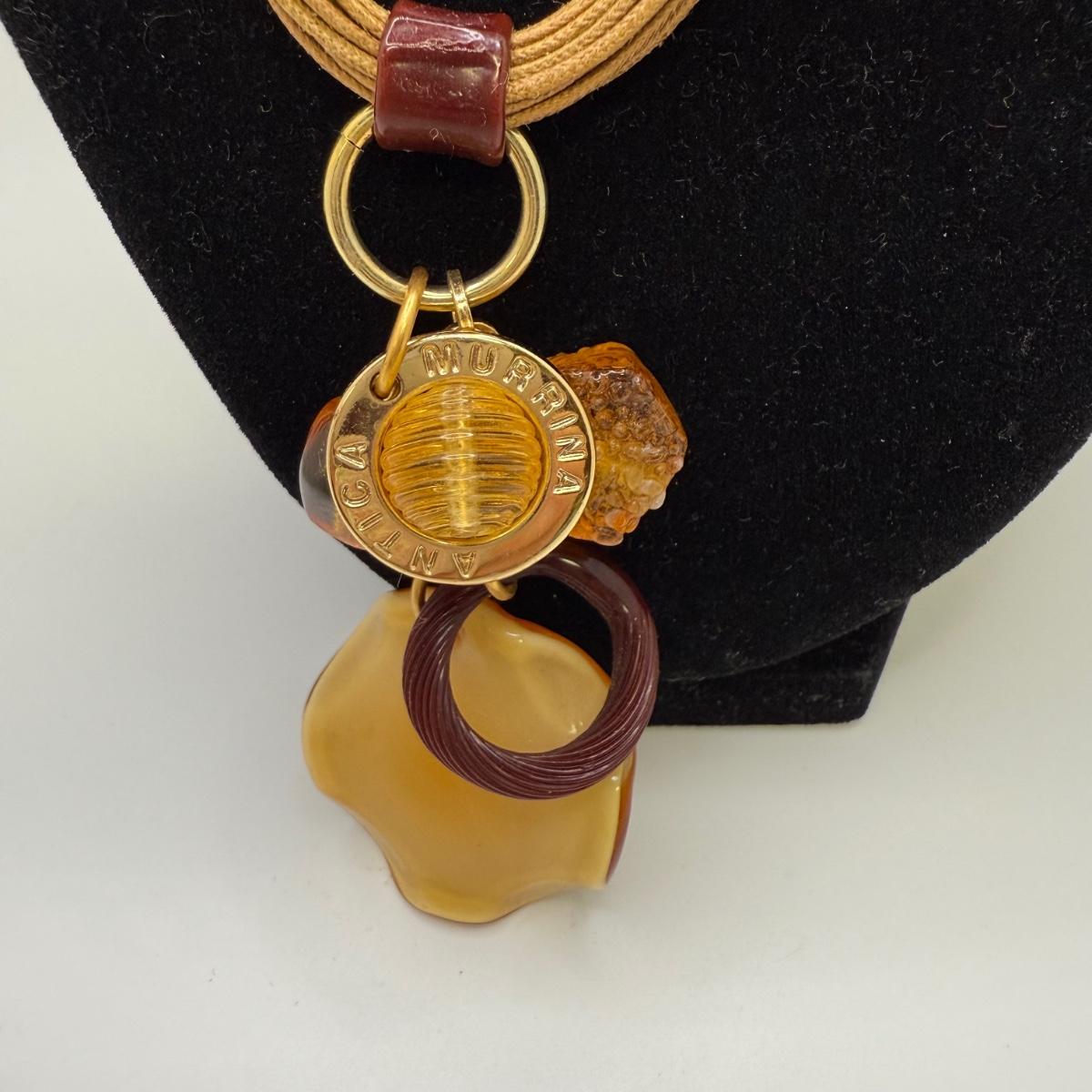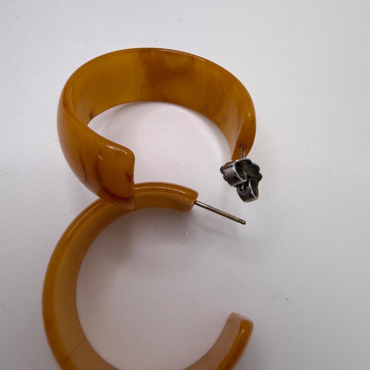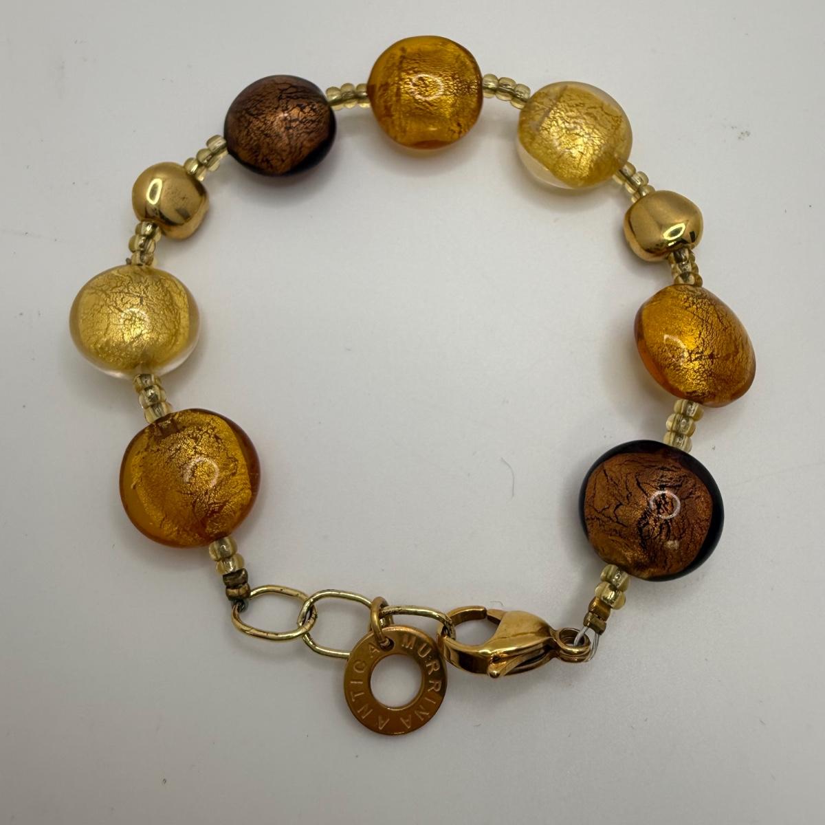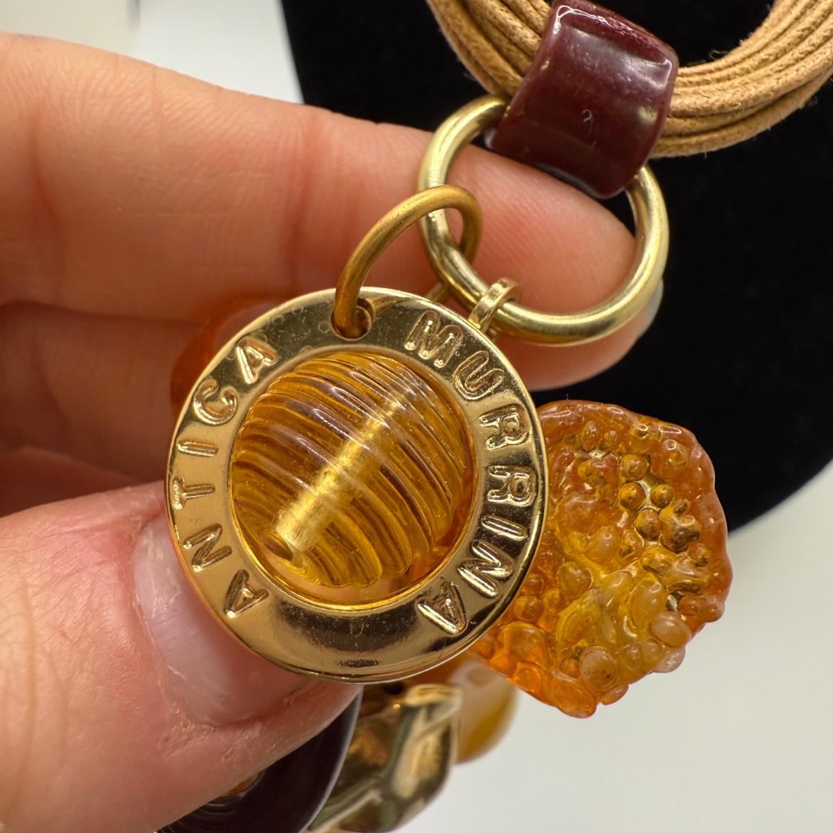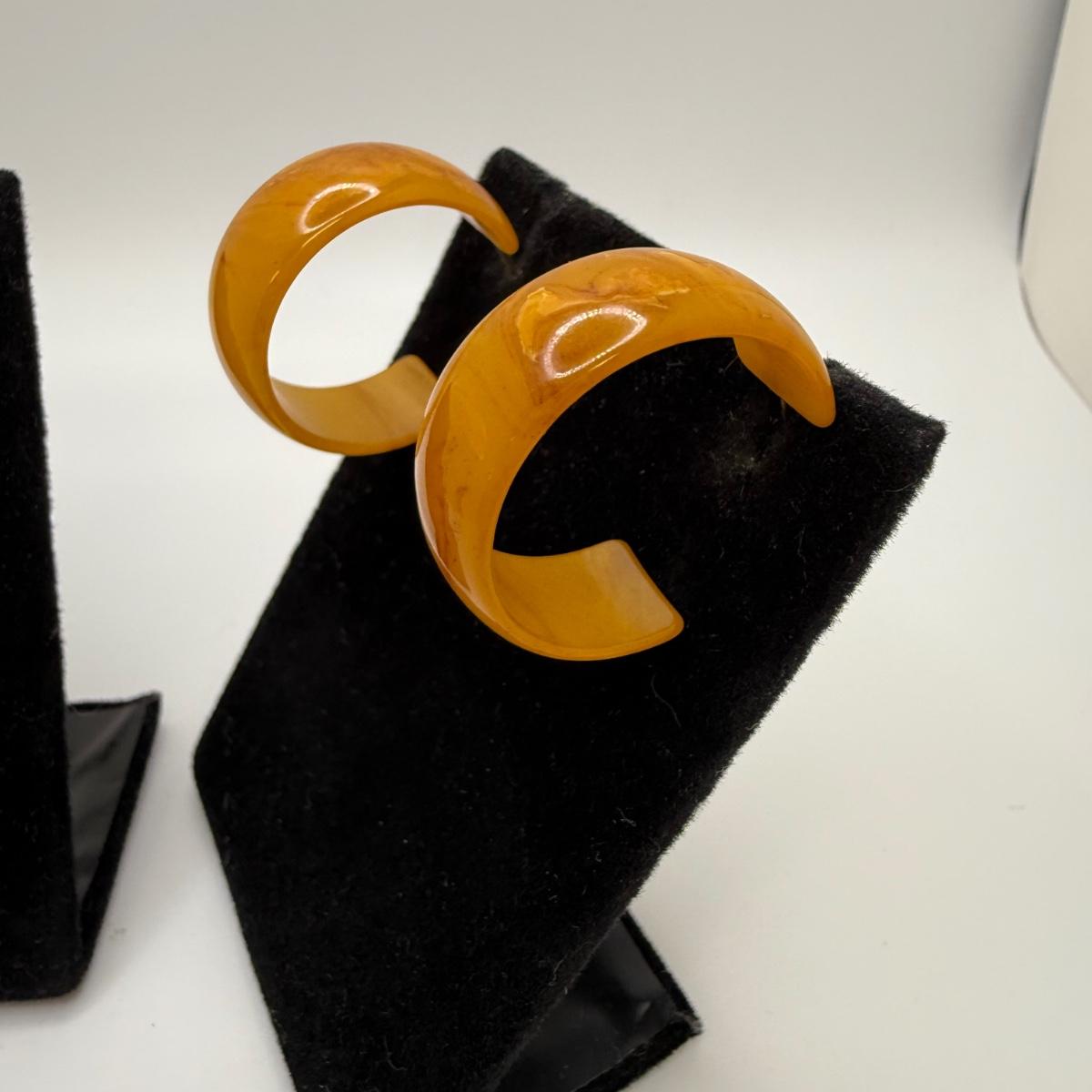 A collection of lovely amber-toned jewelry, including a couple items that appear to have real amber. Three necklaces, two pairs of earrings for pierced ears, and six bracelets. One necklace and one bracelet are stamped ‘Antica Murrina’. The necklace with the multi-color amber stones is stamped 925. And the third with the glass bead is labeled ‘Monet’. Bracelets include Bakelite, leather, iridescent beads, and the translucent cuff appears to have real natural material inside. Please note that one earring back is missing.