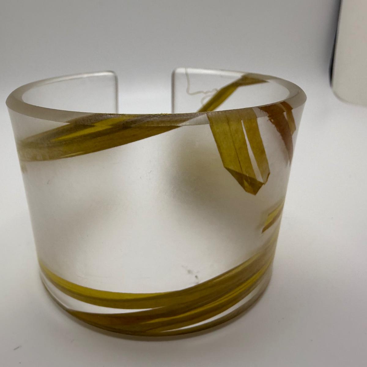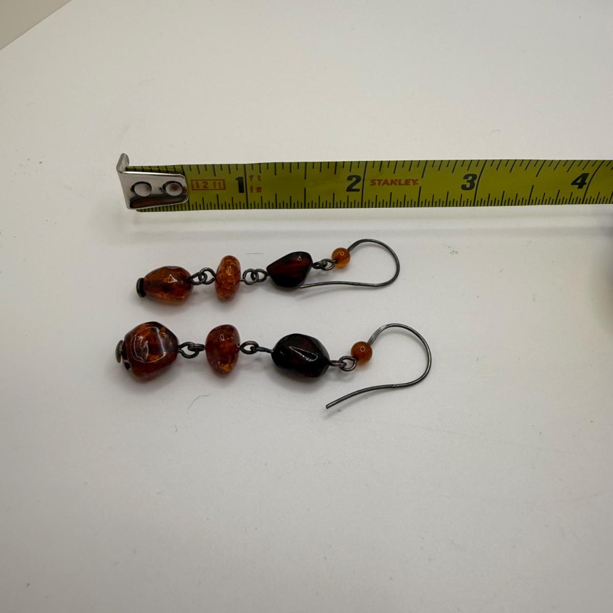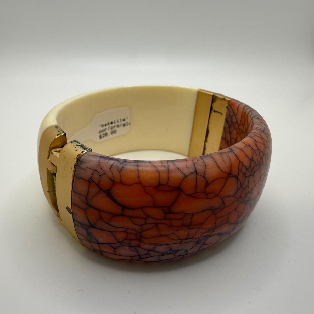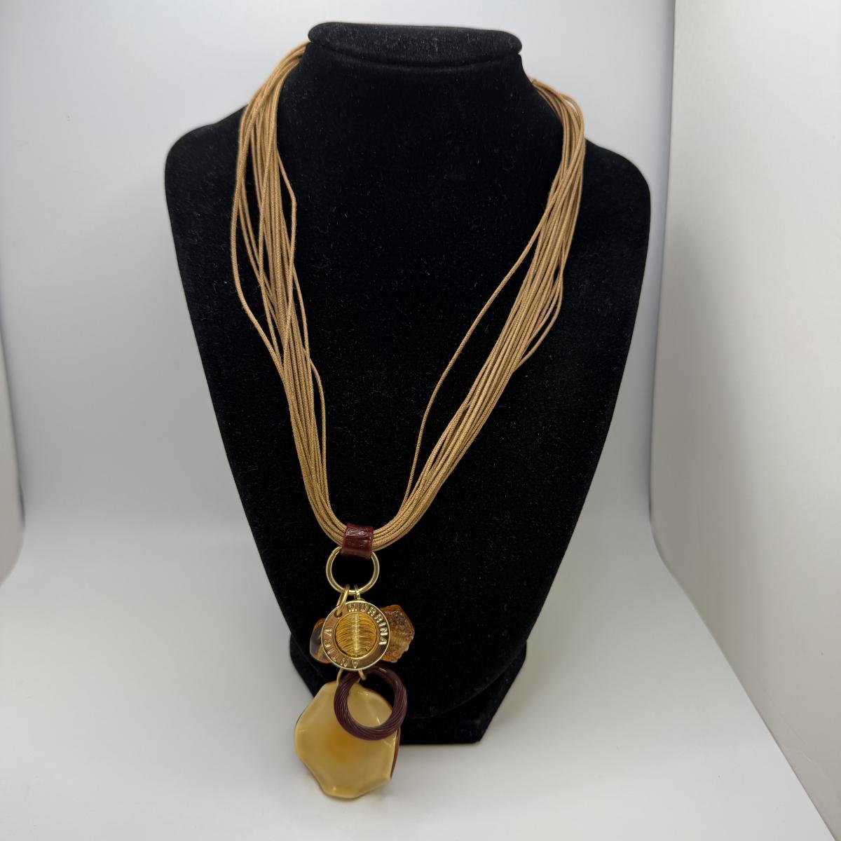 A collection of lovely amber-toned jewelry, including a couple items that appear to have real amber. Three necklaces, two pairs of earrings for pierced ears, and six bracelets. One necklace and one bracelet are stamped ‘Antica Murrina’. The necklace with the multi-color amber stones is stamped 925. And the third with the glass bead is labeled ‘Monet’. Bracelets include Bakelite, leather, iridescent beads, and the translucent cuff appears to have real natural material inside. Please note that one earring back is missing.