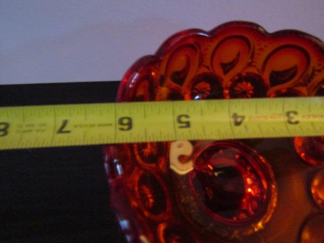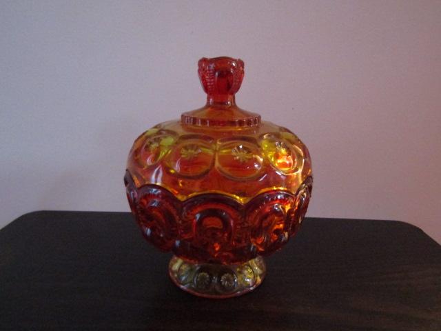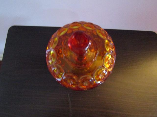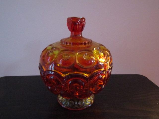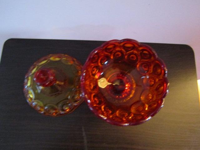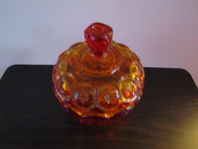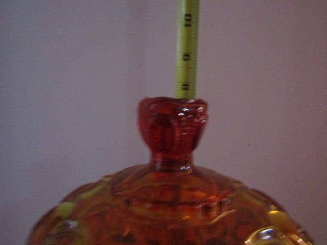 Amberina Footed Candy Dish with Lid. Measures 7 1/2" high and 6 1/4" in diameter.