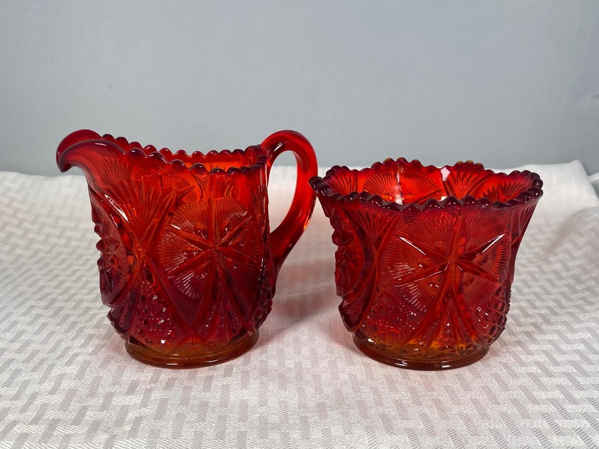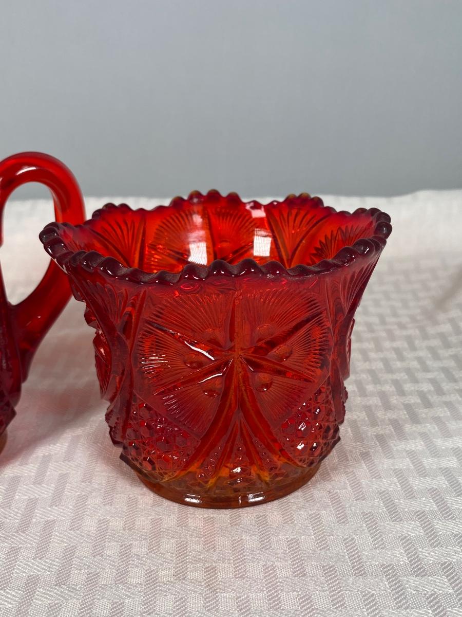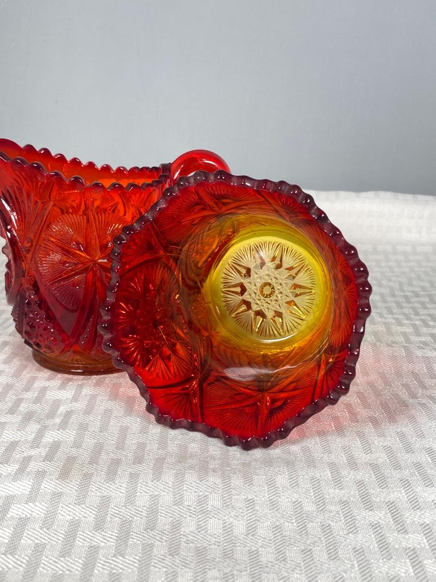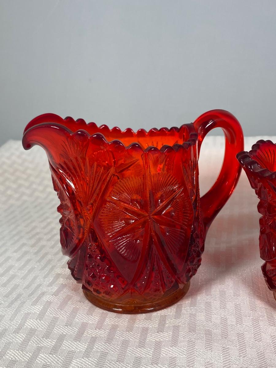 Amberina Red Orange Yellow Flame Depression Glass Cream & Sugar Set. In good condition.