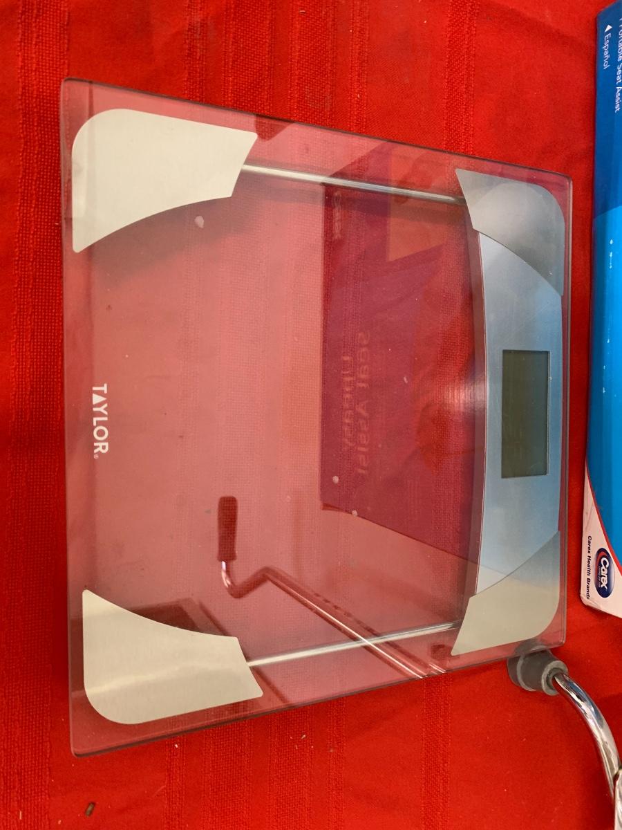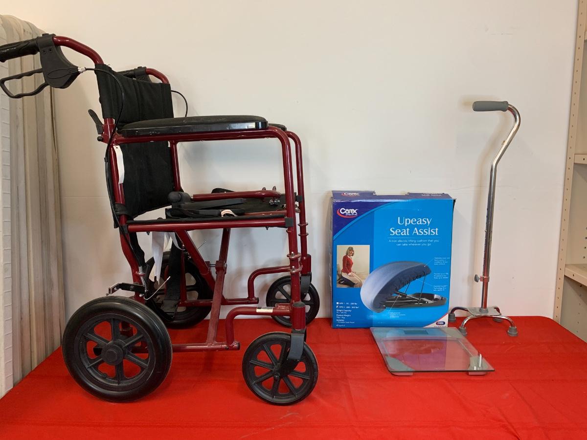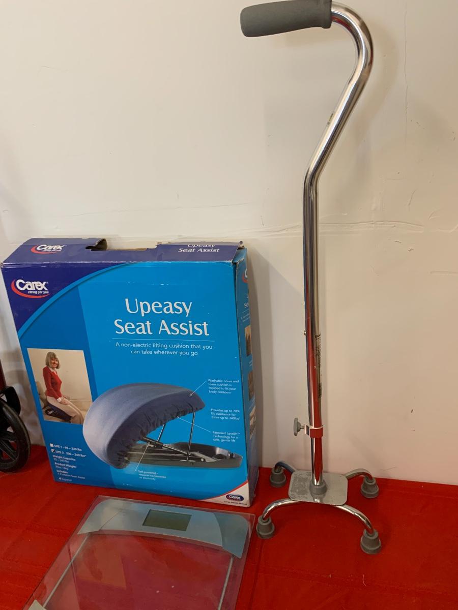 Includes wheelchair, cane, up-easy seat assist and scale. Scale is in working condition. All pieces in good condition.