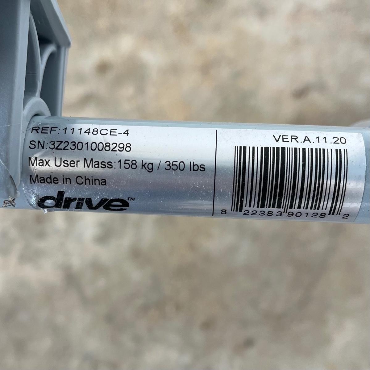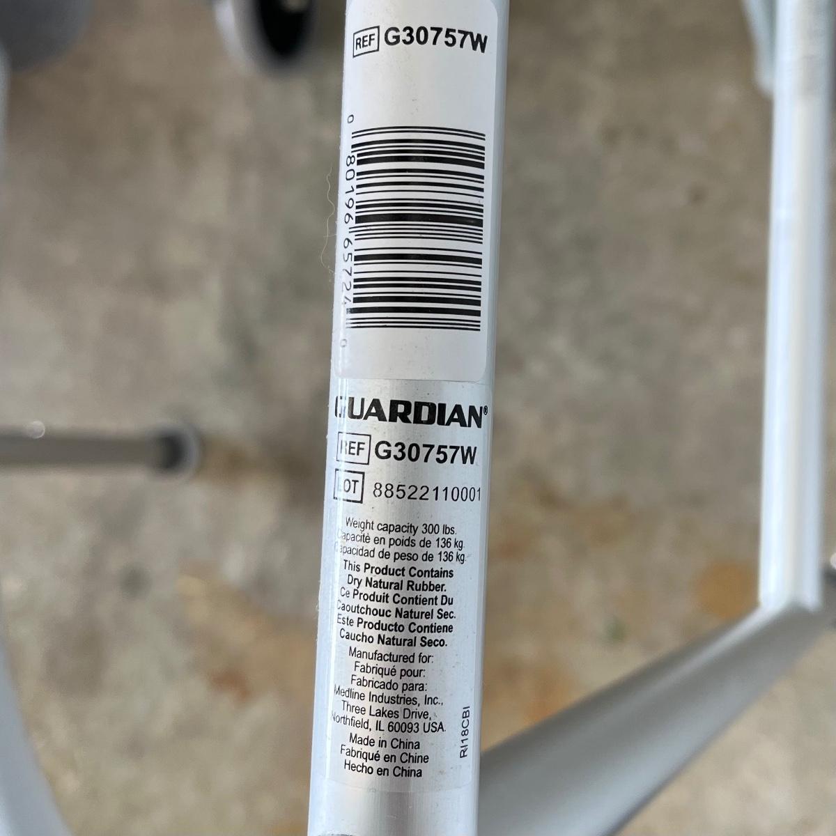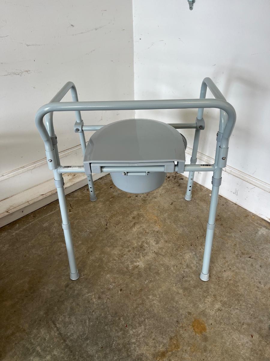 Adjustable Guardian brand folding walker with front wheels and a Drive brand folding commode. Both items appear to be in good and clean condition.