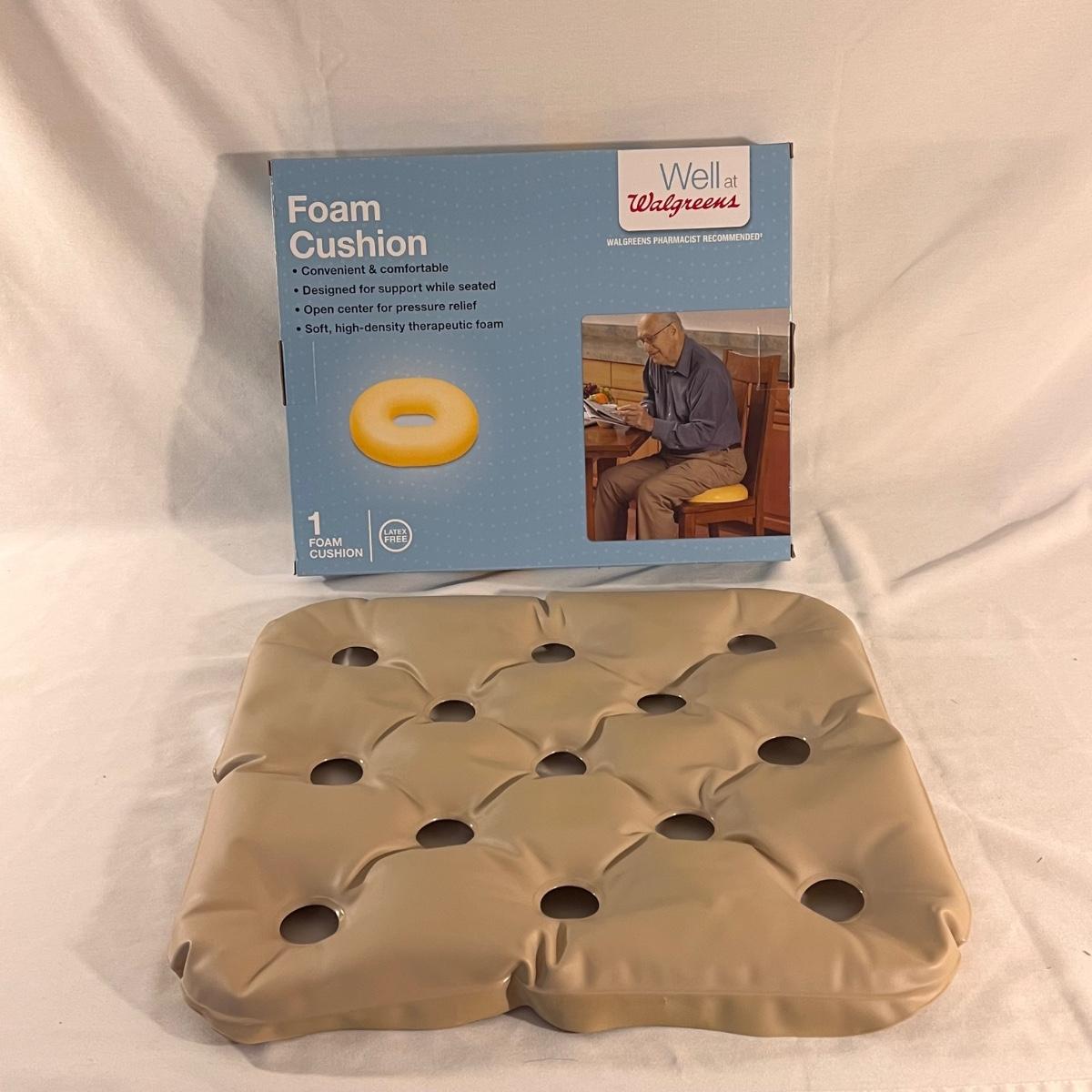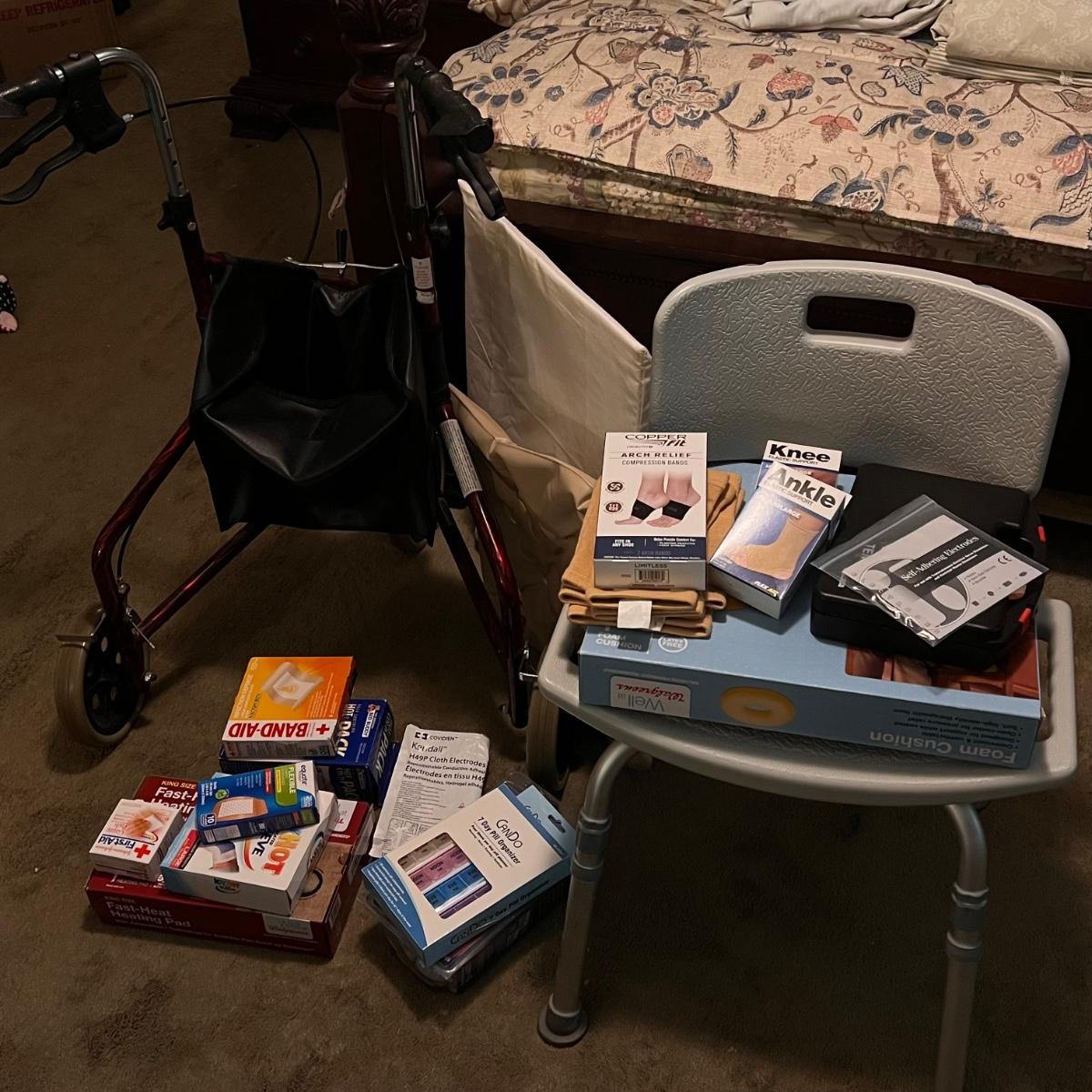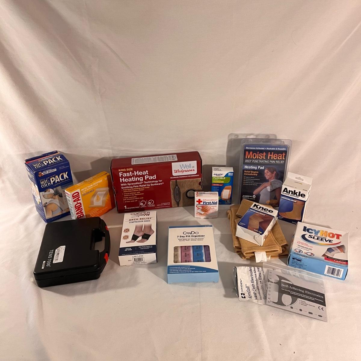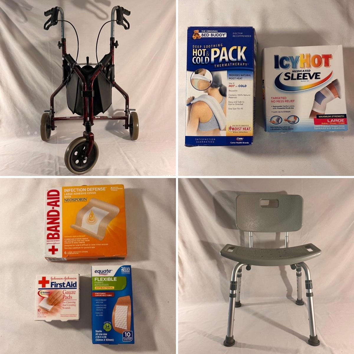 This lot includes one walker by Lifestyle Mobility Aids, two hot/cold packs, one Hermell pillow, one aluminum bath bench, one inflatable cushion, one foam cushion, pill organizer, one Tens 7000, three packs of bandaids, several ankle and knee braces, and two heated pads. The square inflatable cushion measure 18” x 18”H. The walker measures 27” x 34”H. The aluminum bath bench measures 19.5” x 20” x 28”H. Local pickup only.