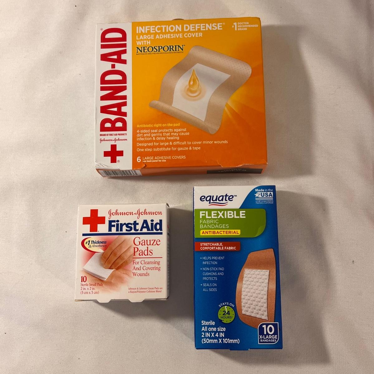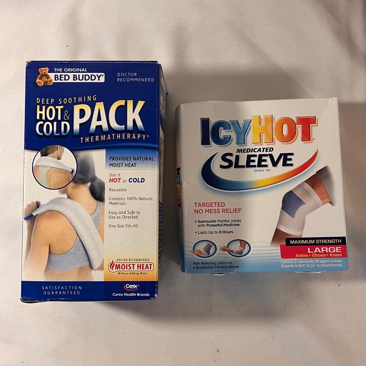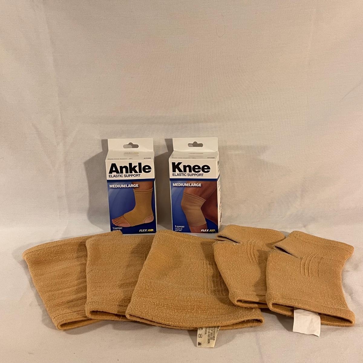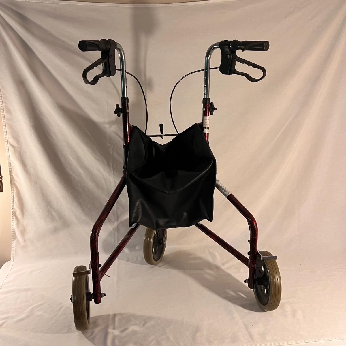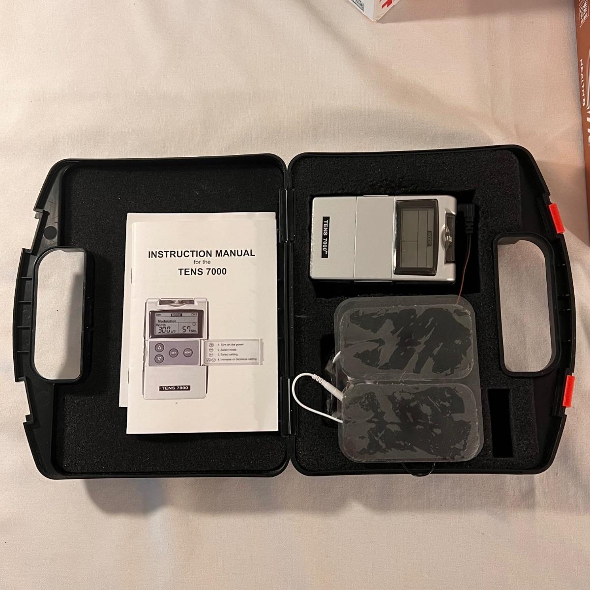This lot includes one walker by Lifestyle Mobility Aids, two hot/cold packs, one Hermell pillow, one aluminum bath bench, one inflatable cushion, one foam cushion, pill organizer, one Tens 7000, three packs of bandaids, several ankle and knee braces, and two heated pads. The square inflatable cushion measure 18” x 18”H. The walker measures 27” x 34”H. The aluminum bath bench measures 19.5” x 20” x 28”H. Local pickup only.