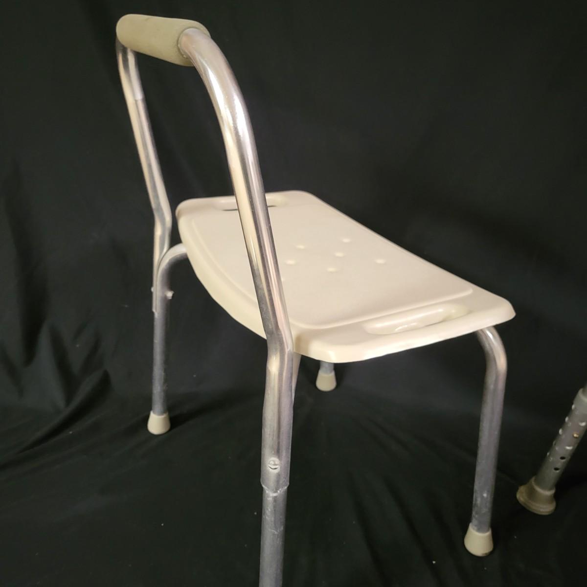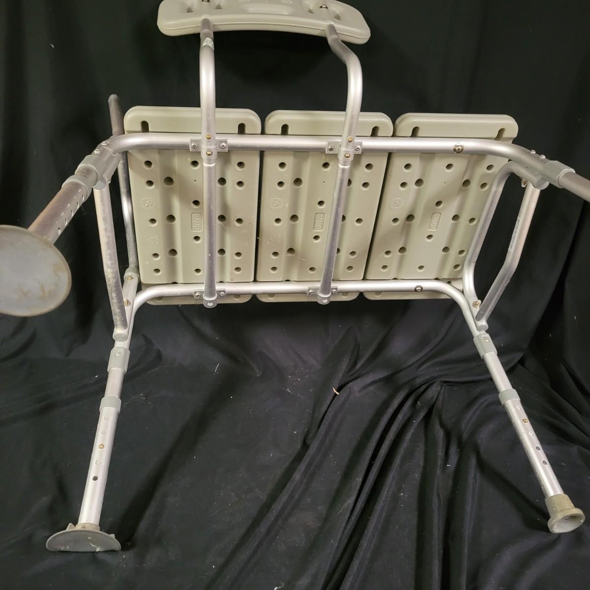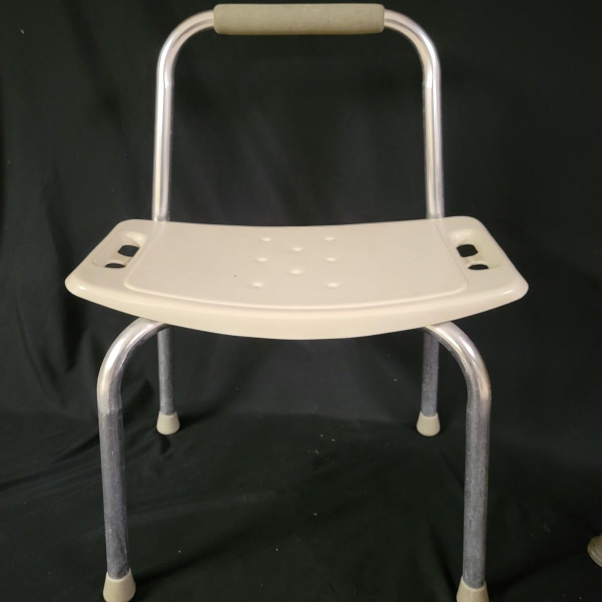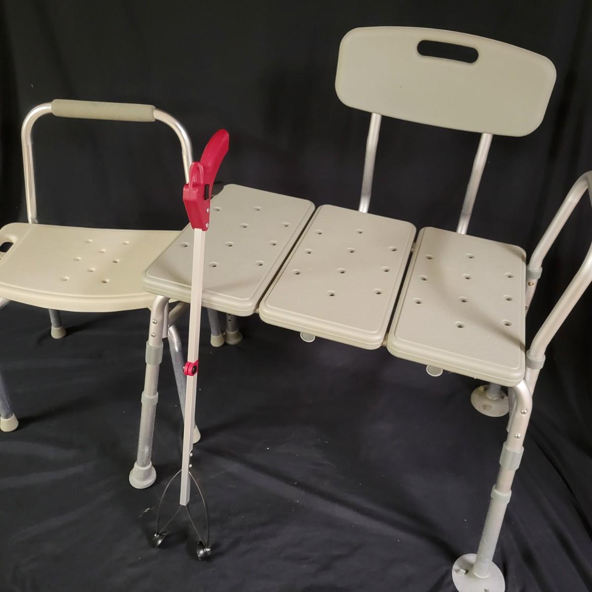 A pair of shower chairs and a reach extender in good condition with no notable damage. The reach extender/grabber folds up for convenient storage and is approximately 33". Lot also includes two shower chairs. Both have plastic seats and aluminum bodies. The larger one has adjustable legs and backrest. Largest chair measures approximately 27.5" x 20" x 34.5" with an adjustable seat height. Local pickup only