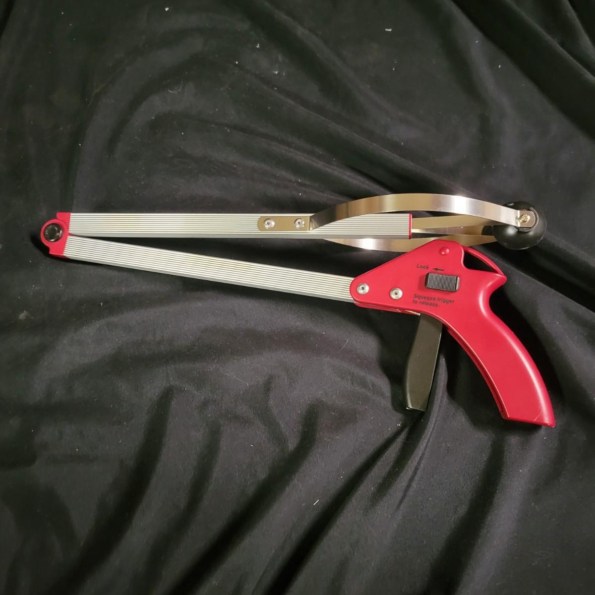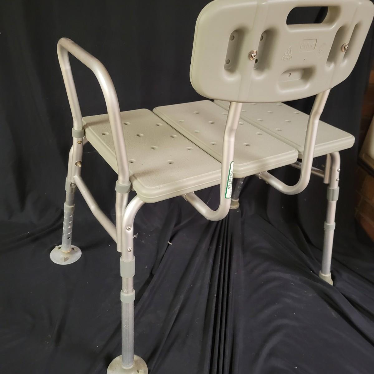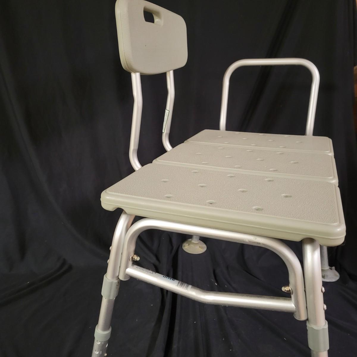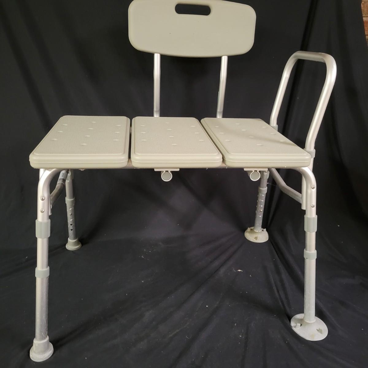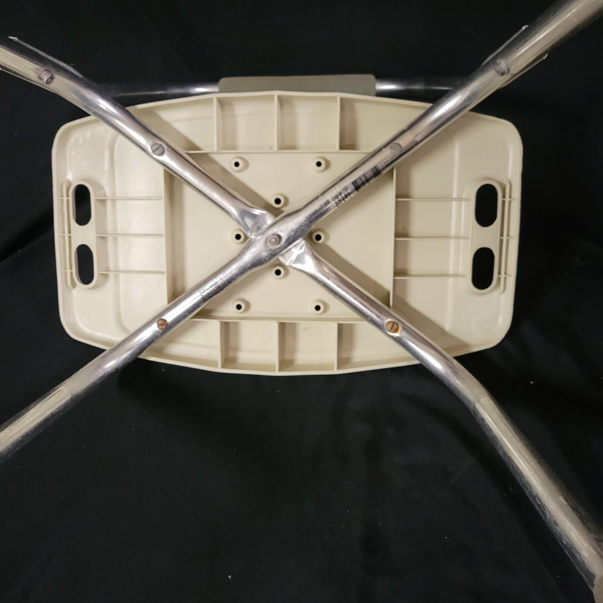 A pair of shower chairs and a reach extender in good condition with no notable damage. The reach extender/grabber folds up for convenient storage and is approximately 33". Lot also includes two shower chairs. Both have plastic seats and aluminum bodies. The larger one has adjustable legs and backrest. Largest chair measures approximately 27.5" x 20" x 34.5" with an adjustable seat height. Local pickup only
