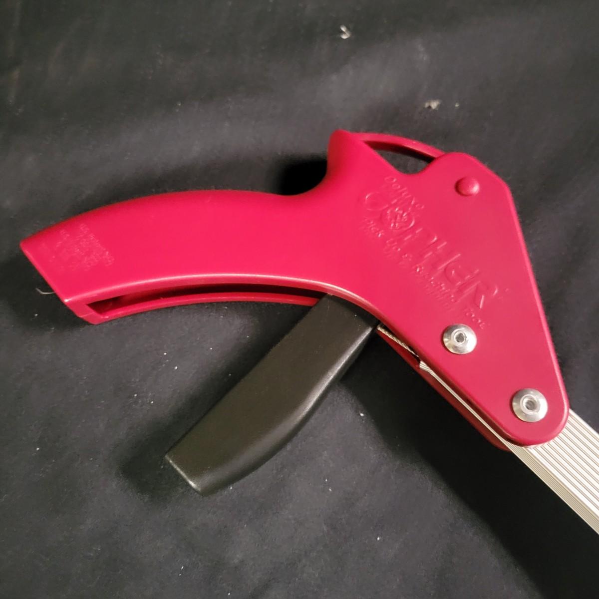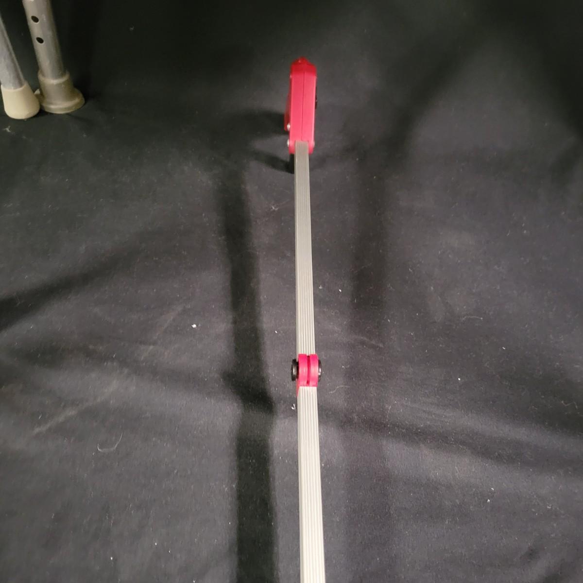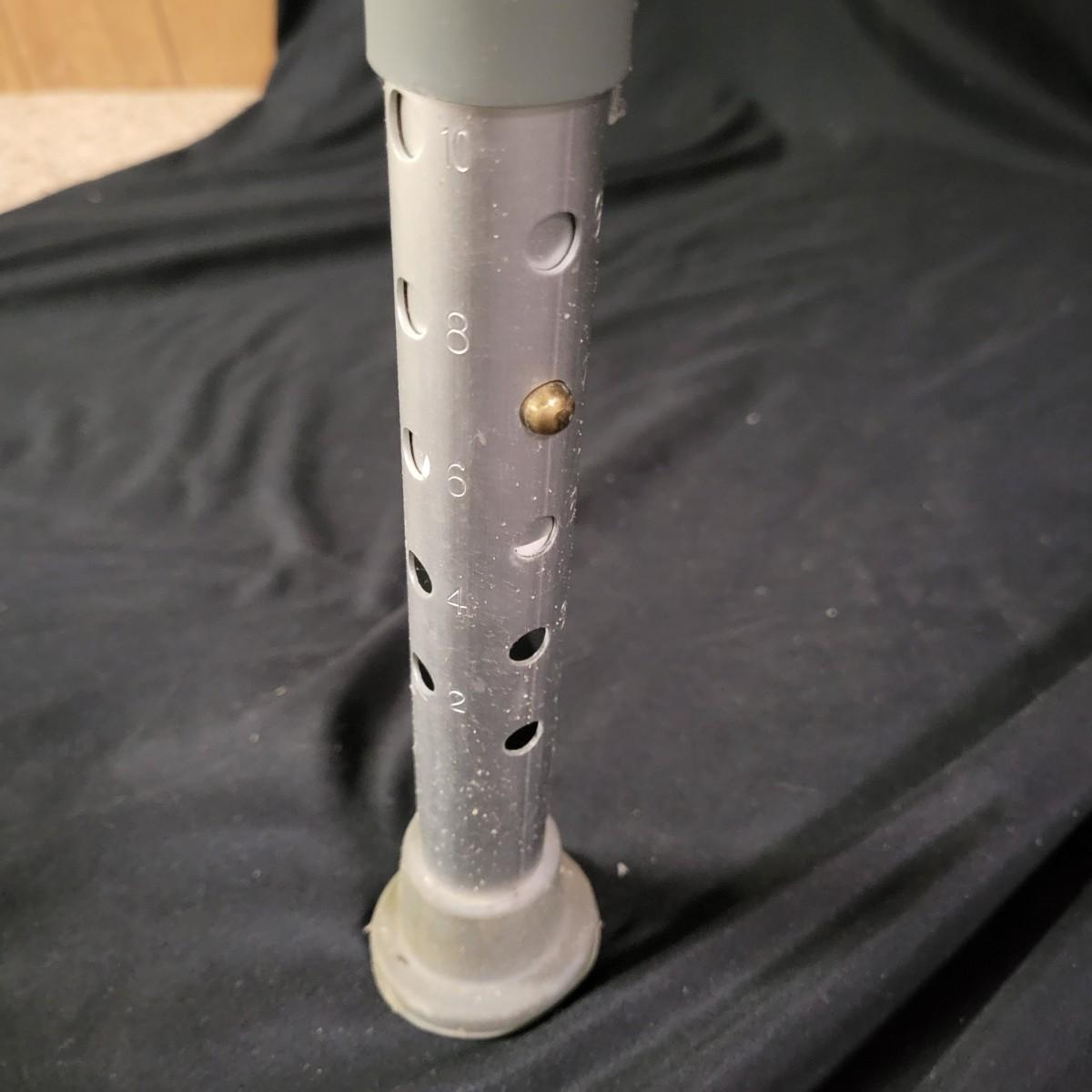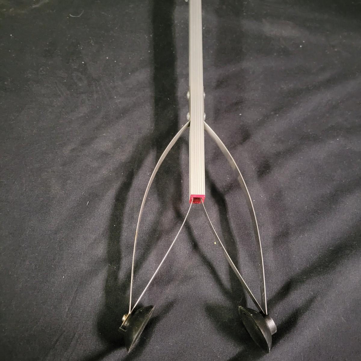 A pair of shower chairs and a reach extender in good condition with no notable damage. The reach extender/grabber folds up for convenient storage and is approximately 33". Lot also includes two shower chairs. Both have plastic seats and aluminum bodies. The larger one has adjustable legs and backrest. Largest chair measures approximately 27.5" x 20" x 34.5" with an adjustable seat height. Local pickup only