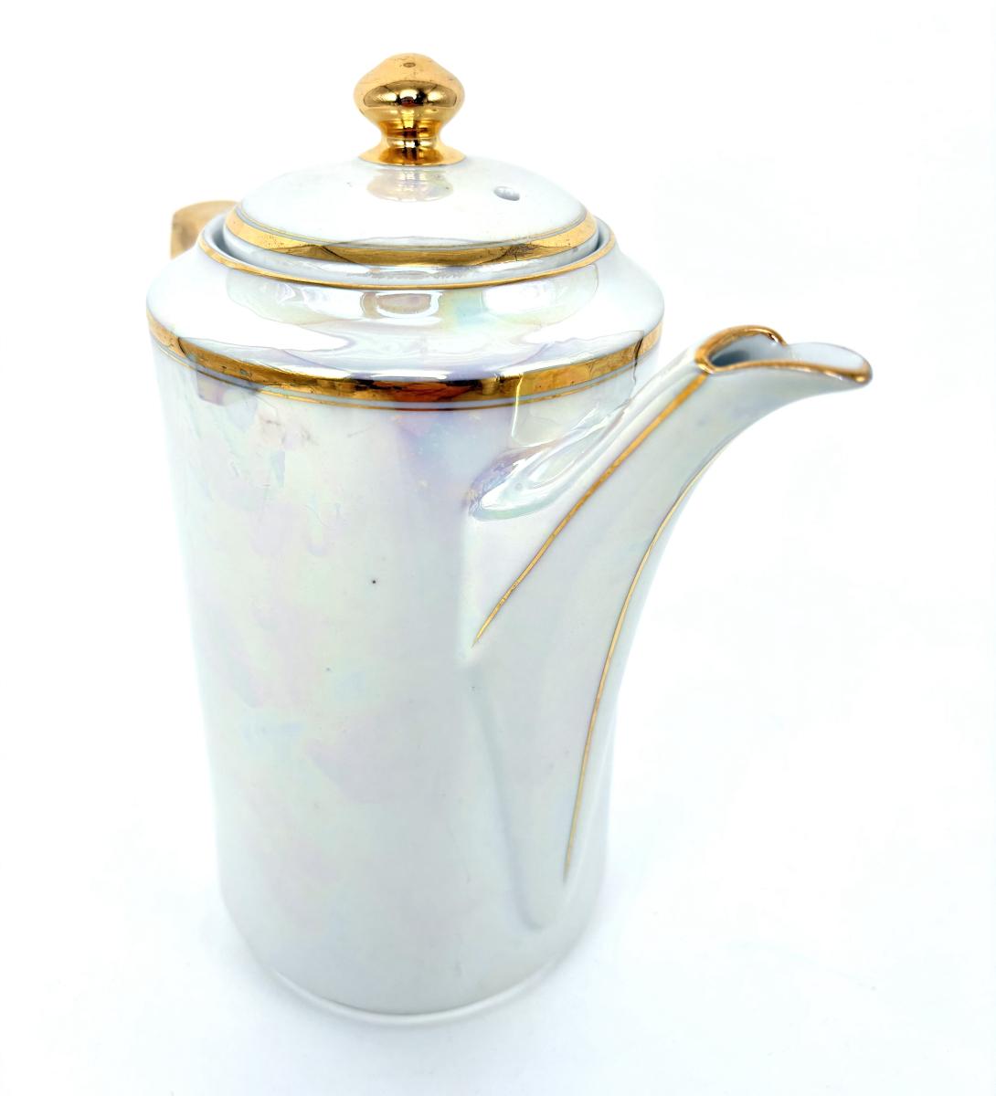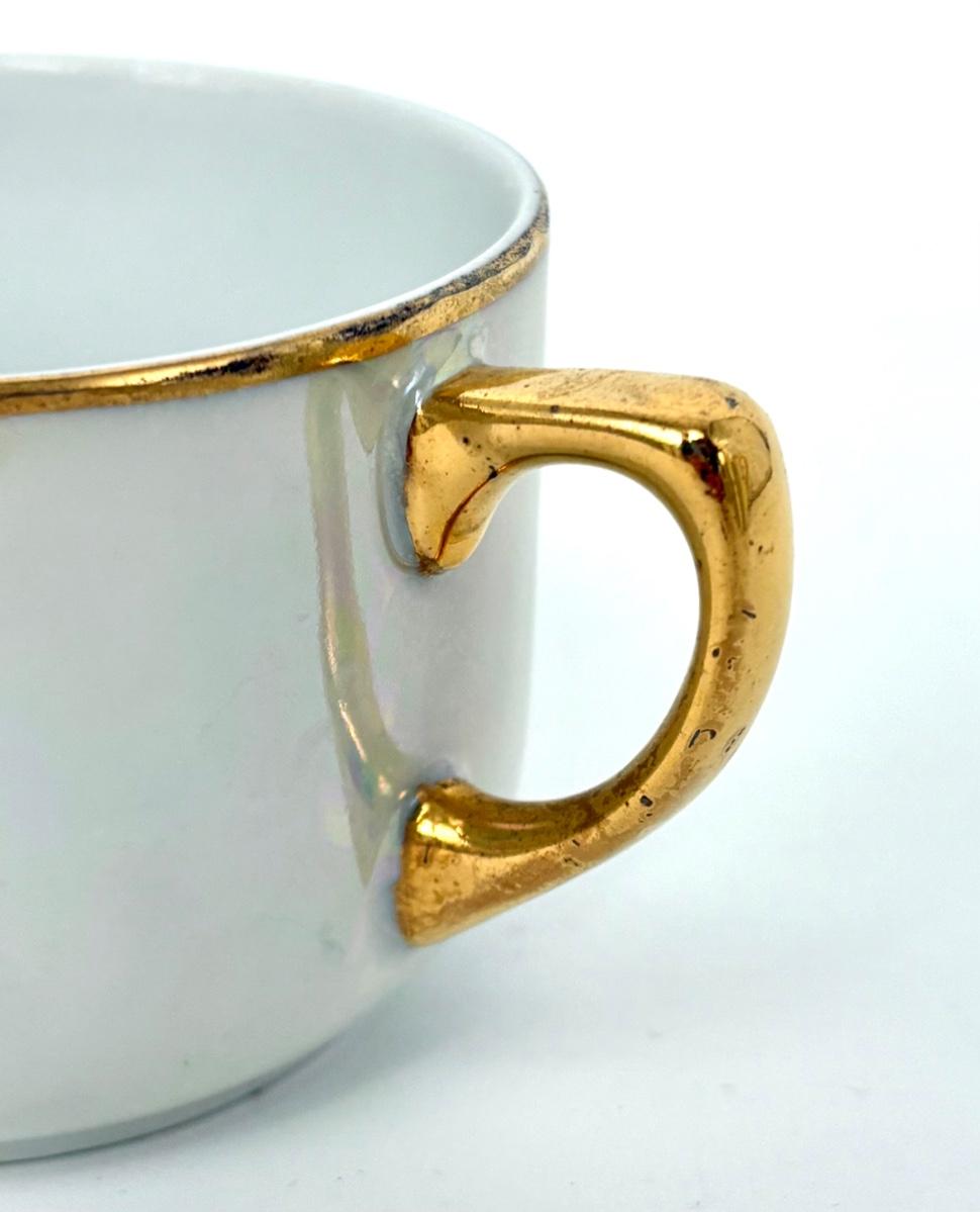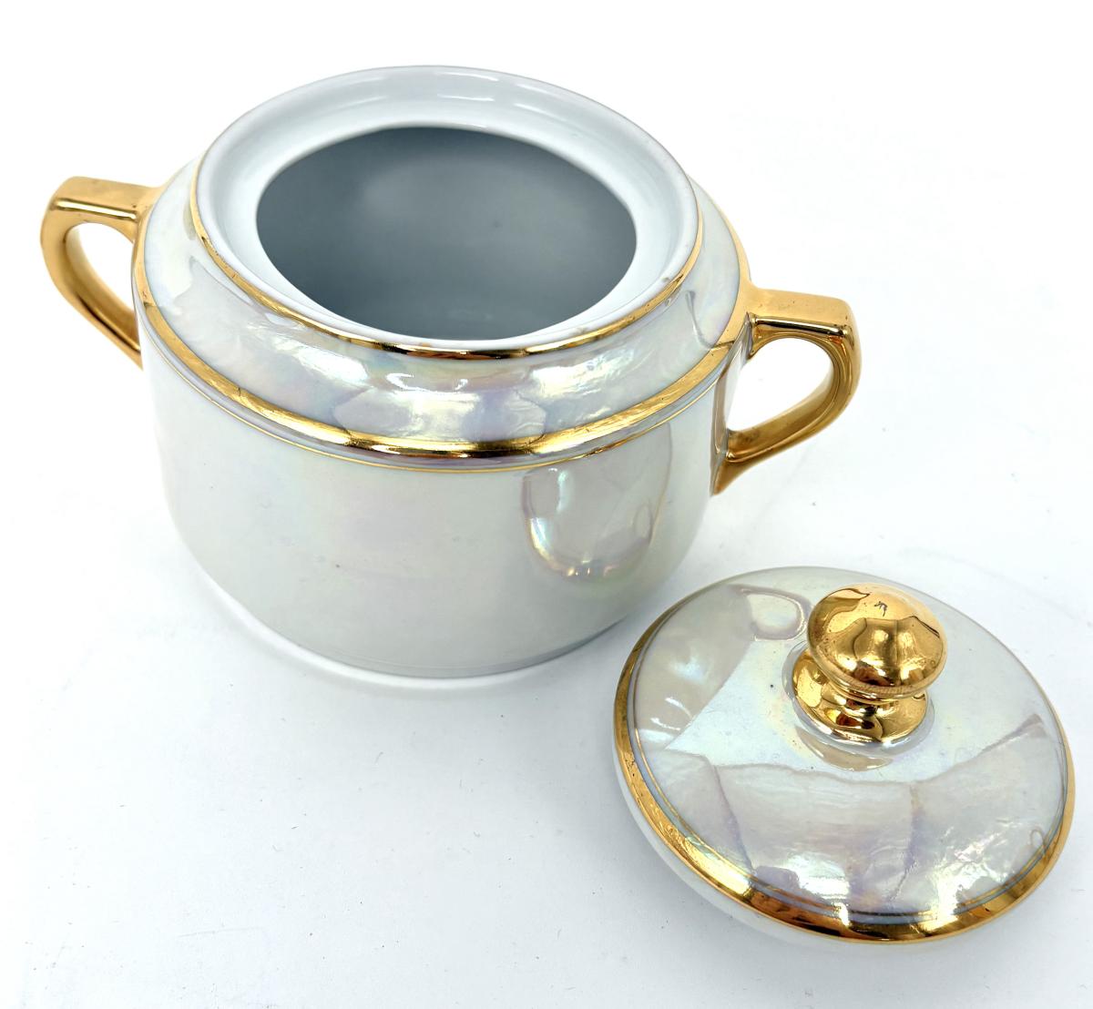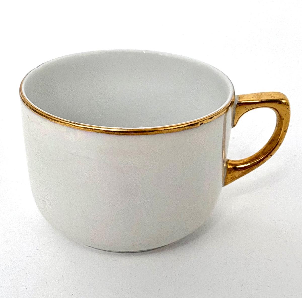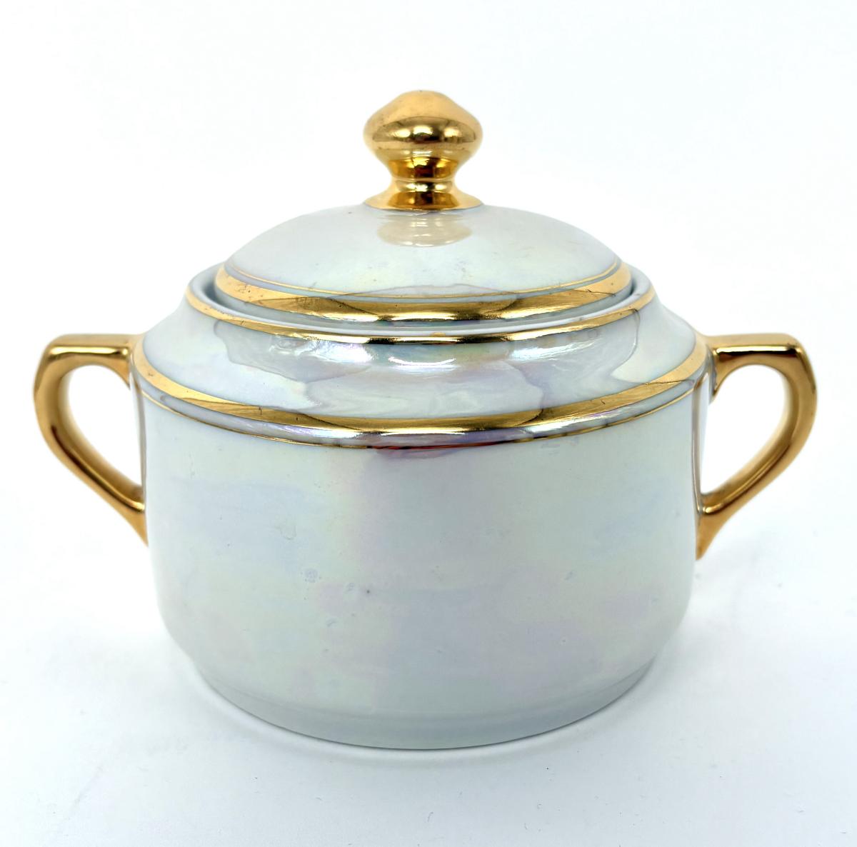 Tea pot is 9” tall x 8” wide from spout to handle. Creamer is 4-3/4” tall x 4-3/4” wide from spout to handle. Sugar is 4-1/2” tall x 5-3/4” wide from handle to handle. Teacups (12) are 2-1/4” tall x 3” diameter. Saucers (11) 5-1/2” diameter.