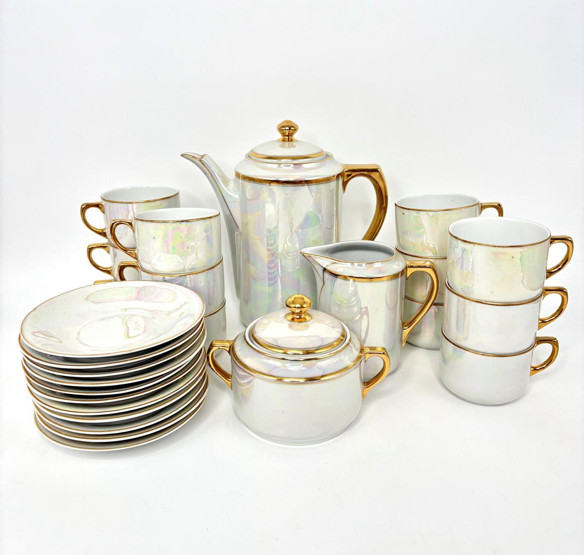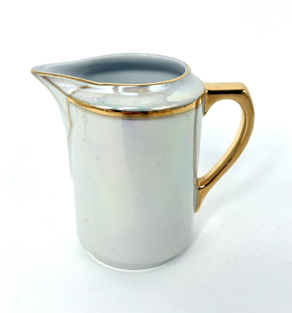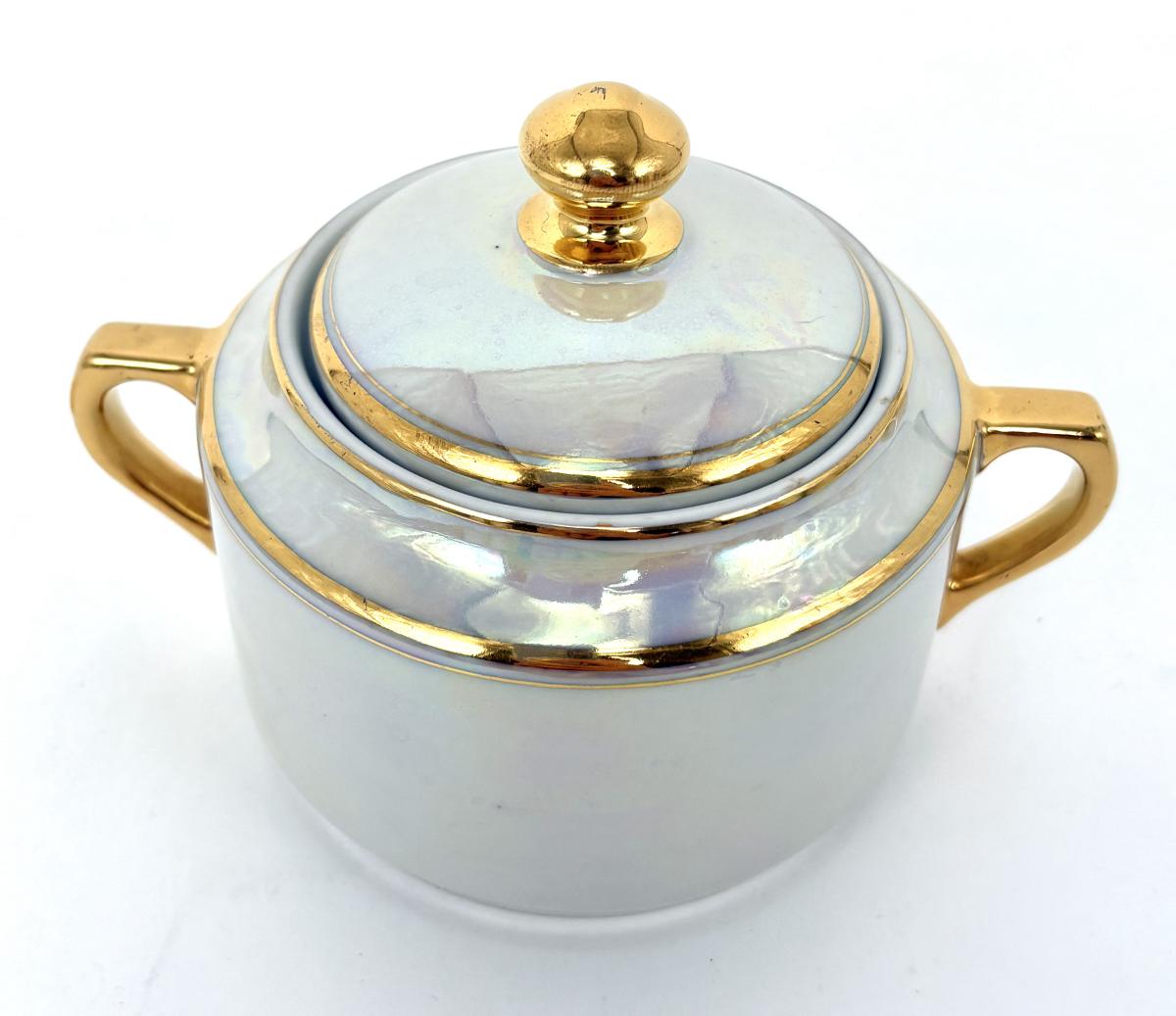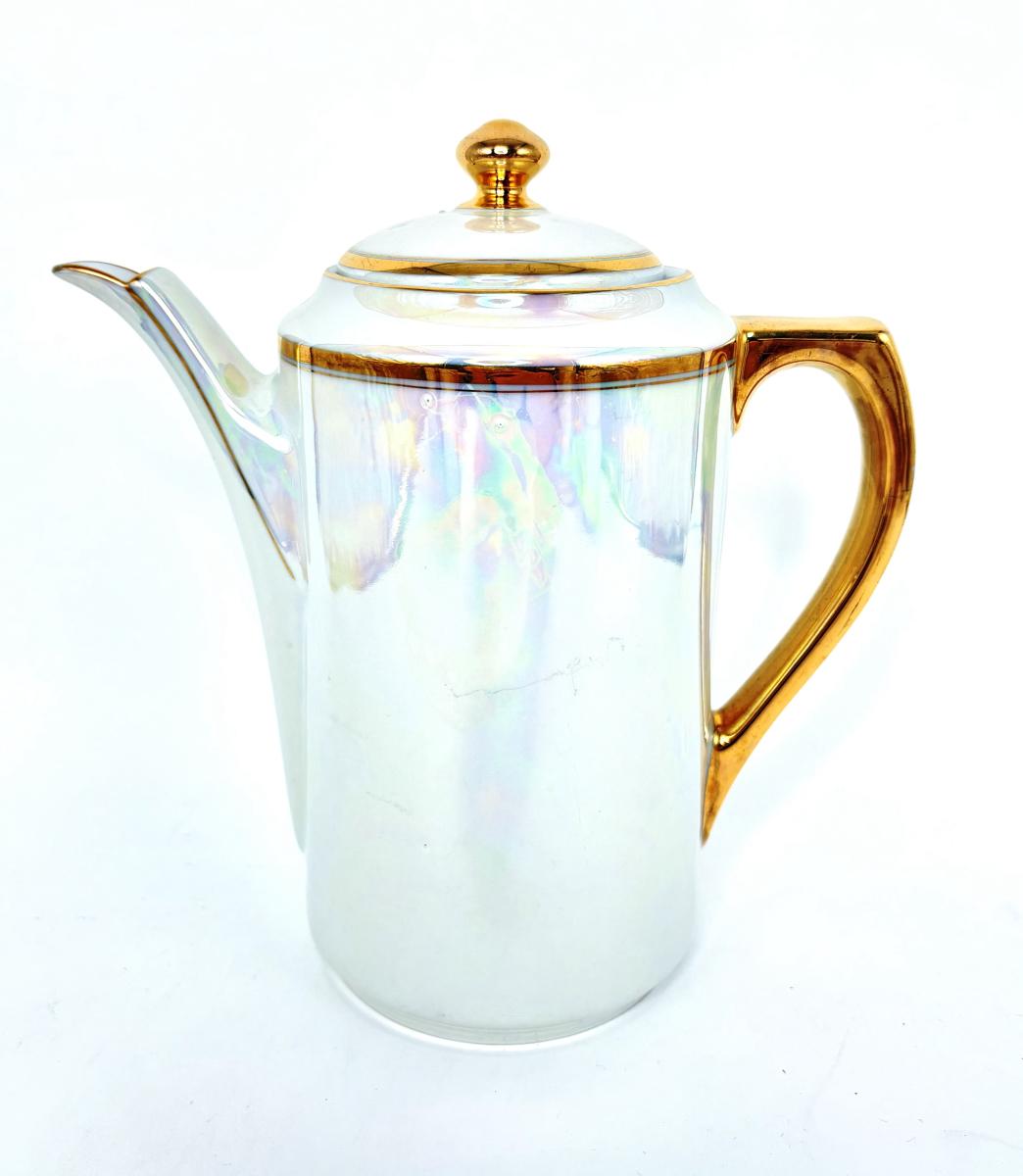 Tea pot is 9” tall x 8” wide from spout to handle. Creamer is 4-3/4” tall x 4-3/4” wide from spout to handle. Sugar is 4-1/2” tall x 5-3/4” wide from handle to handle. Teacups (12) are 2-1/4” tall x 3” diameter. Saucers (11) 5-1/2” diameter.