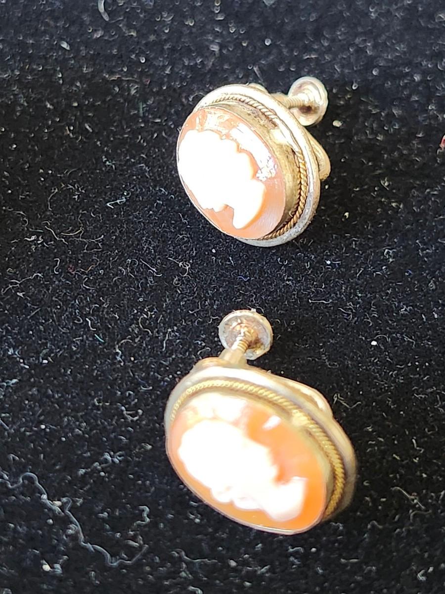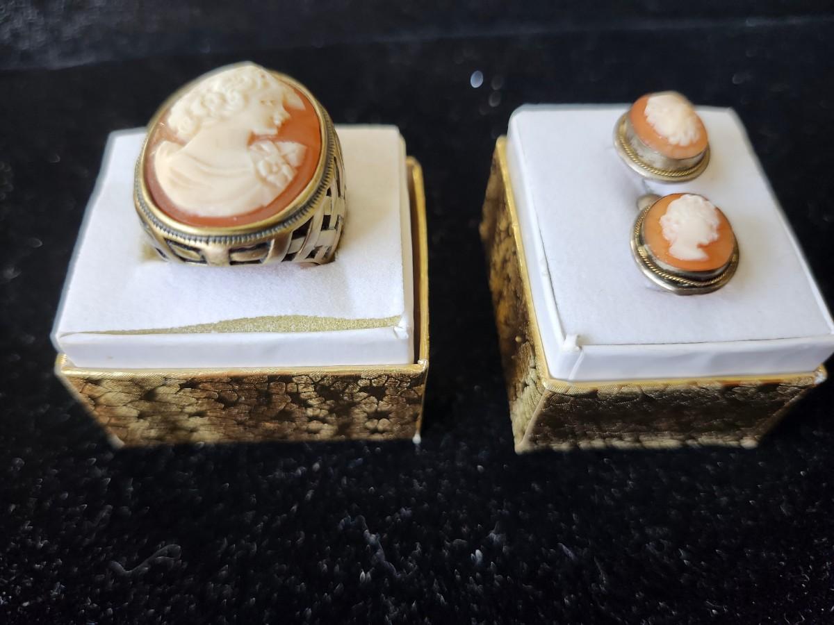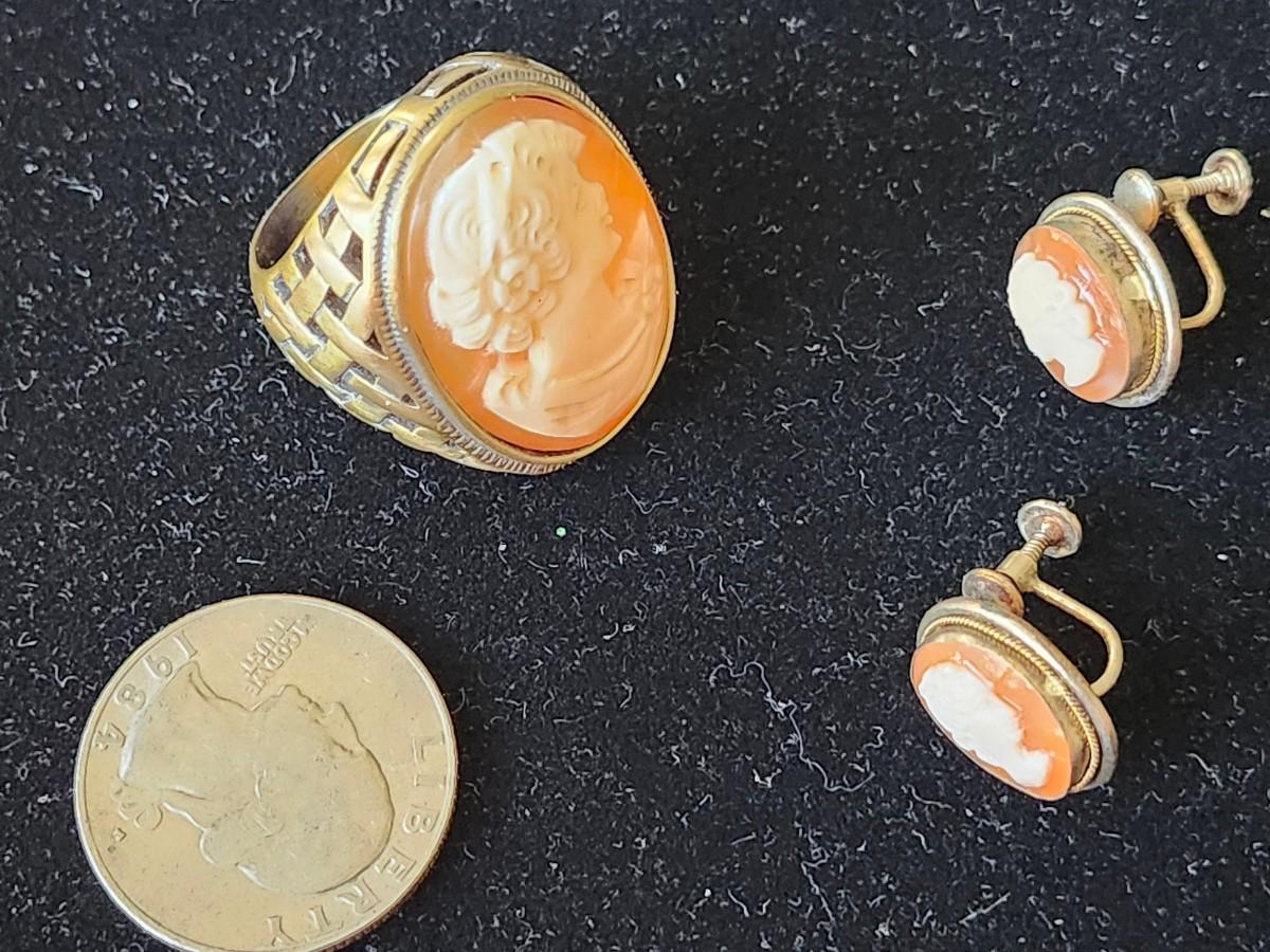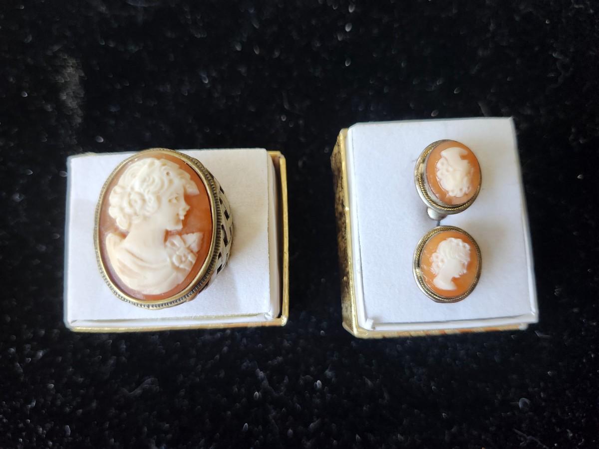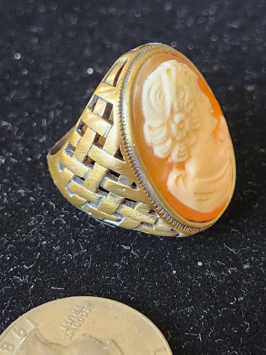 The ring is stamped Amedio with lovely carved shell cameo, probably set in brass?