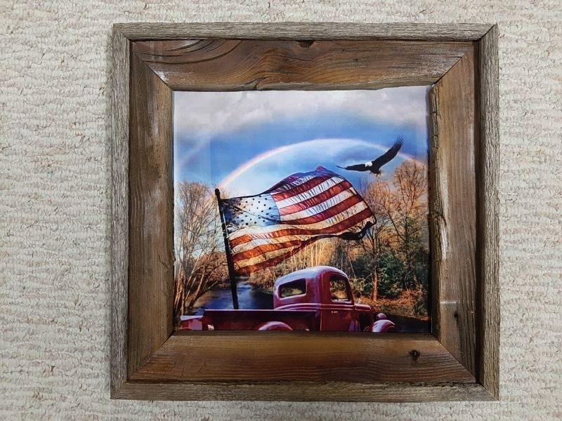 An American classic picture! Wooden frame of a great truck, a beautiful eagle, and Old Glory! Measures 15 3/4" x 15 1/2"