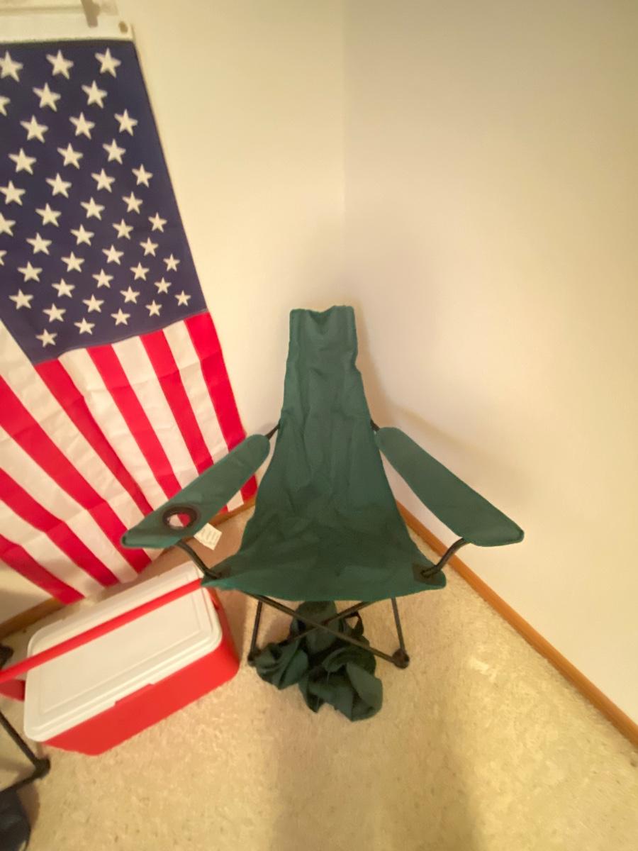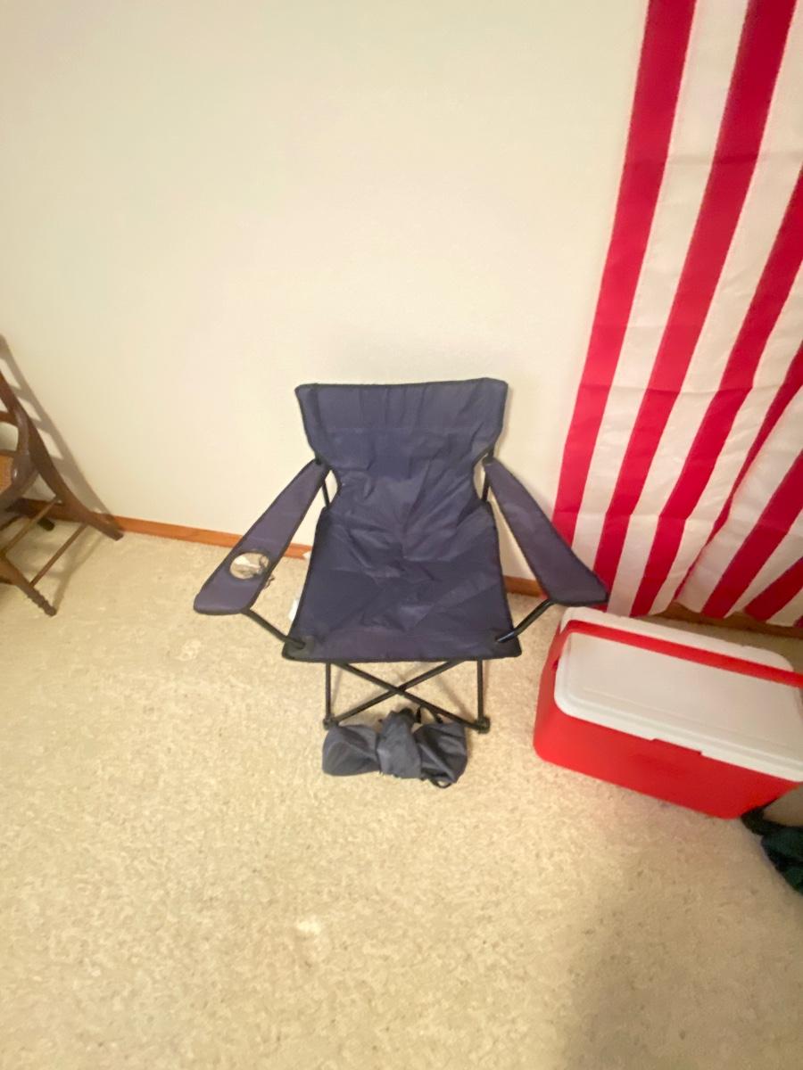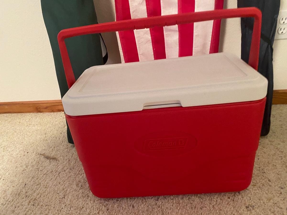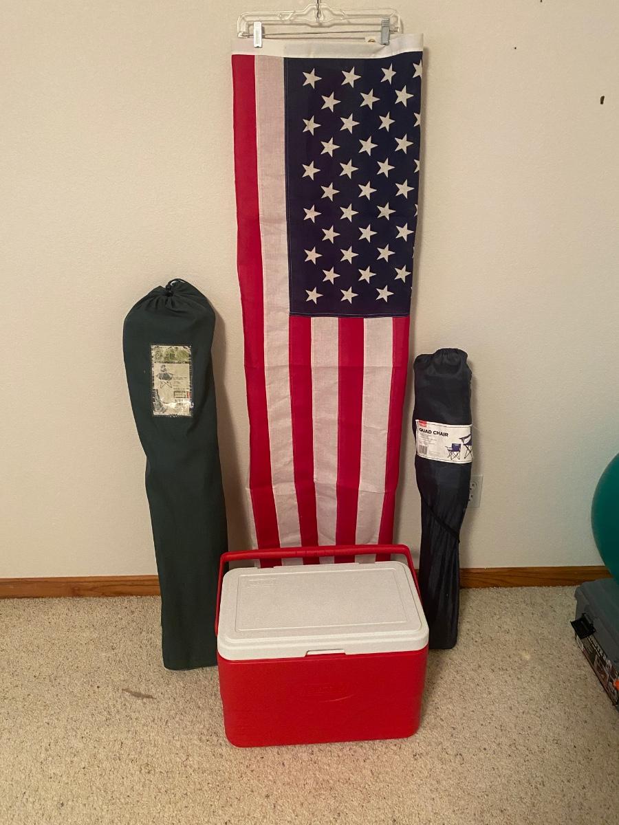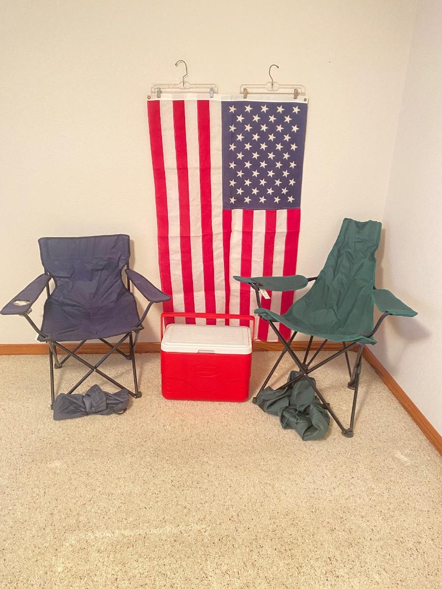AMERICA! COLEMAN COOLER, LIGHTLY USED FOLDING CHAIRS AND A USA FLAG
