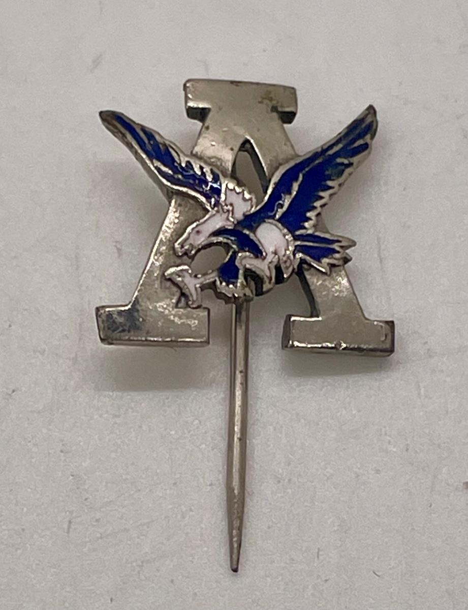 Bird is enameled in blue and white. Letter A is polished silver-tone metal.