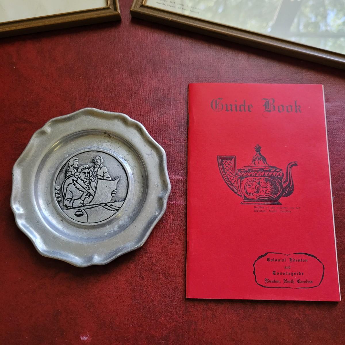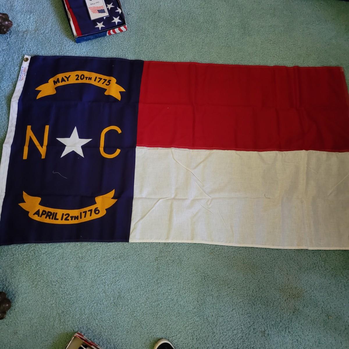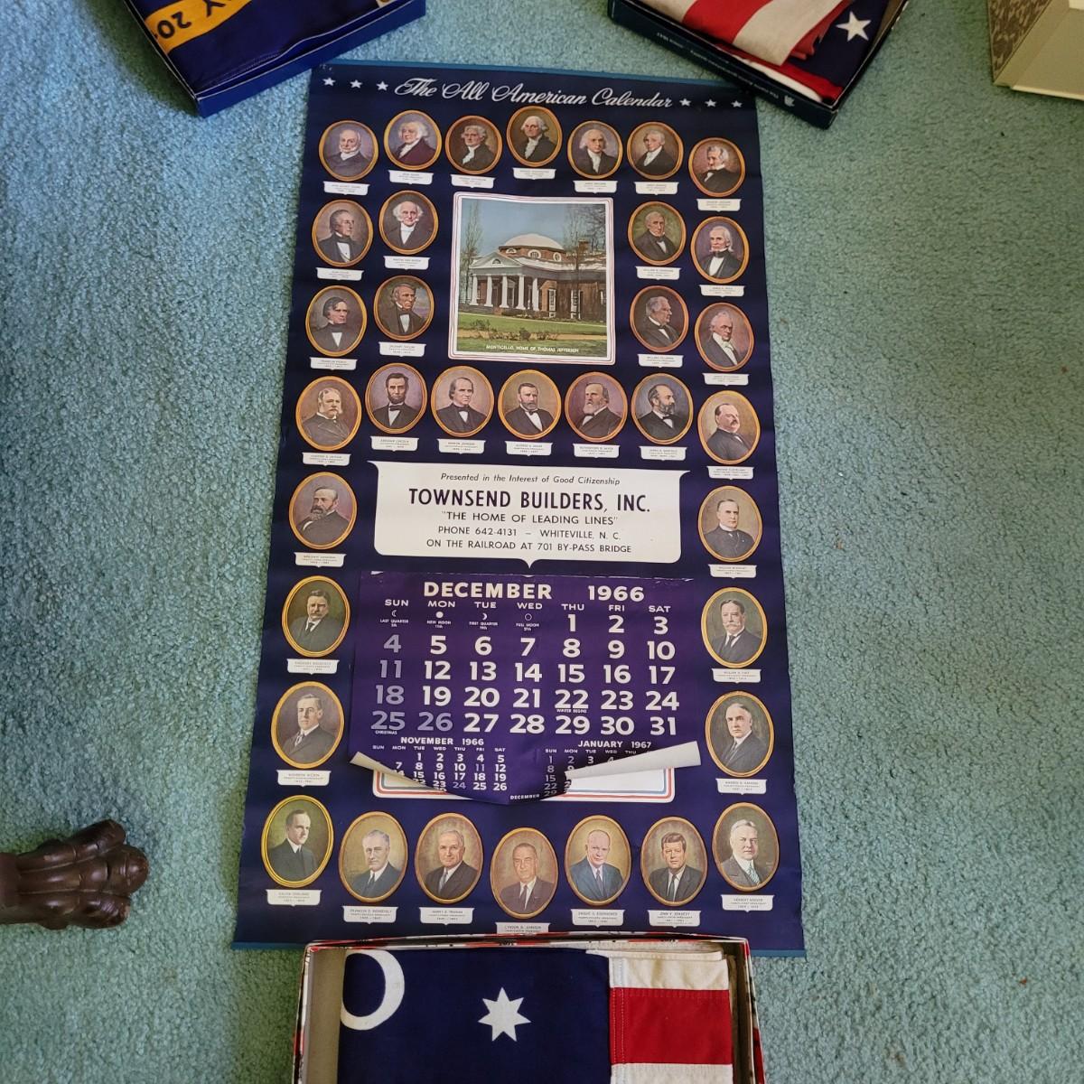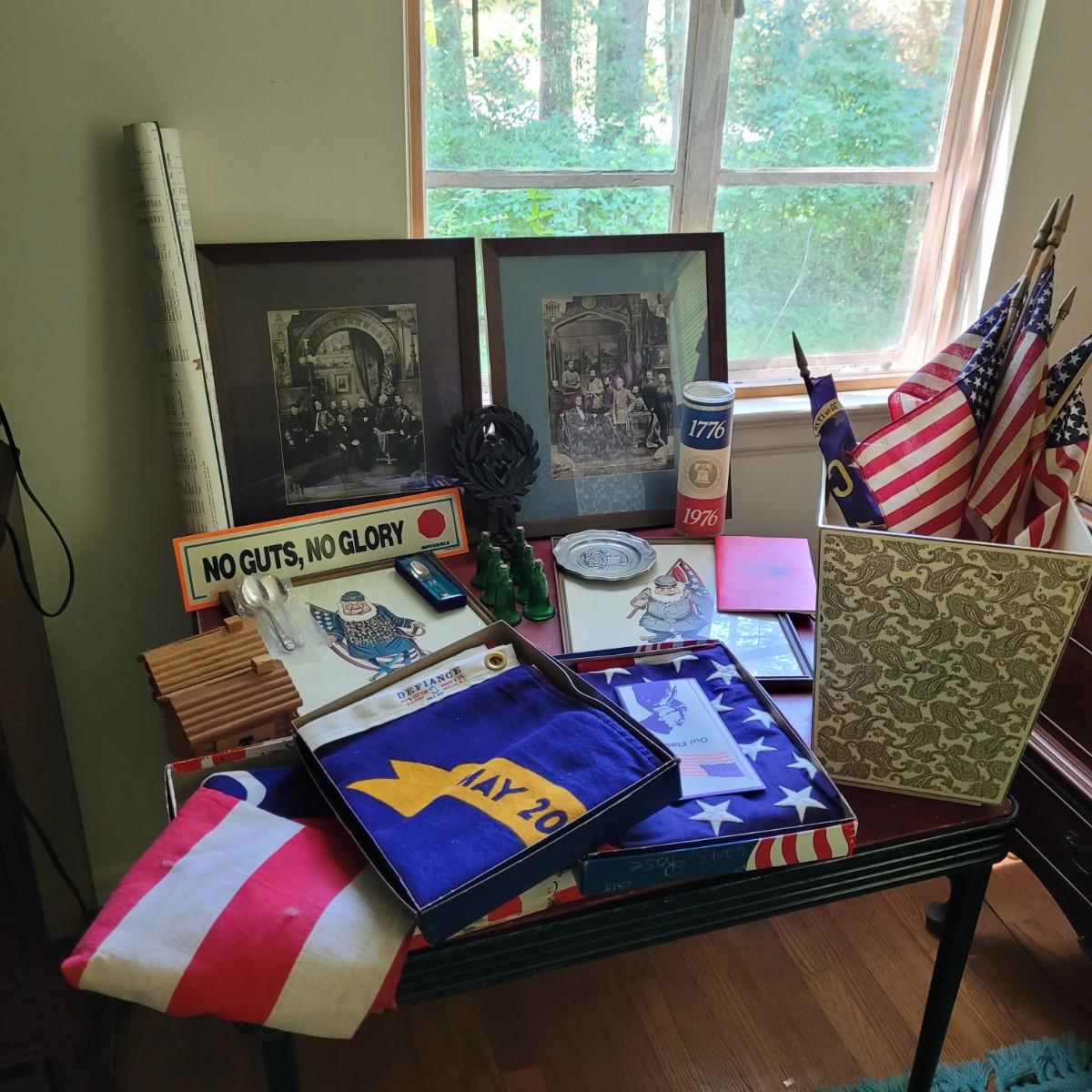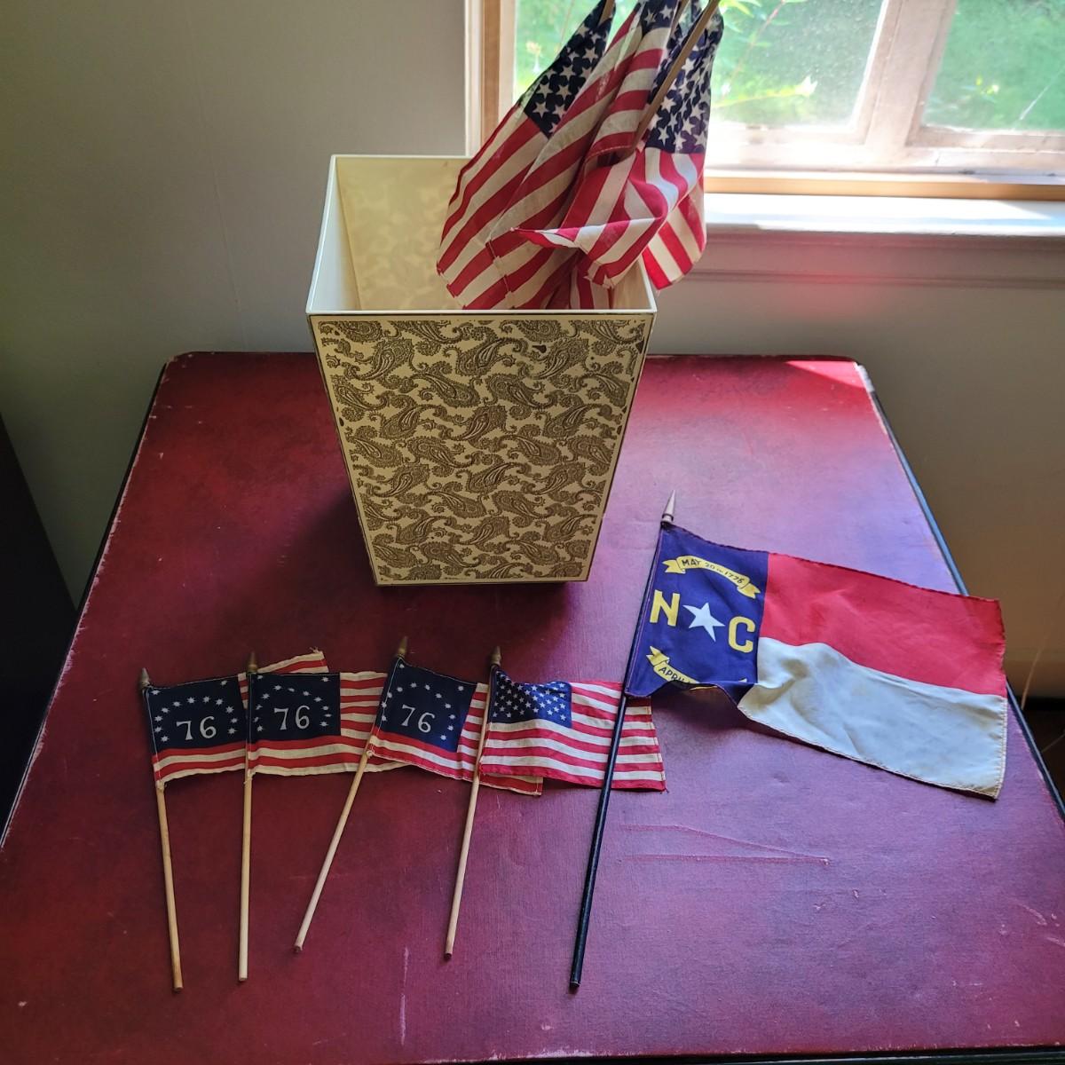 Collection of American and NC history memorabilia, including 3' x5' Americans and NC flags, small parade flags, Bicentennial candle holder and two log cabin piggy banks. Other items include metal American eagle decor, large American presidents calendar from 1966, commemorative engraved spoons, small green glass Liberty Bell bottles, and Civil War framed prints. For reference, Civil War prints depicting Union and Confederate Armies measure 17"L x14.5"W in frames. Shipping available.