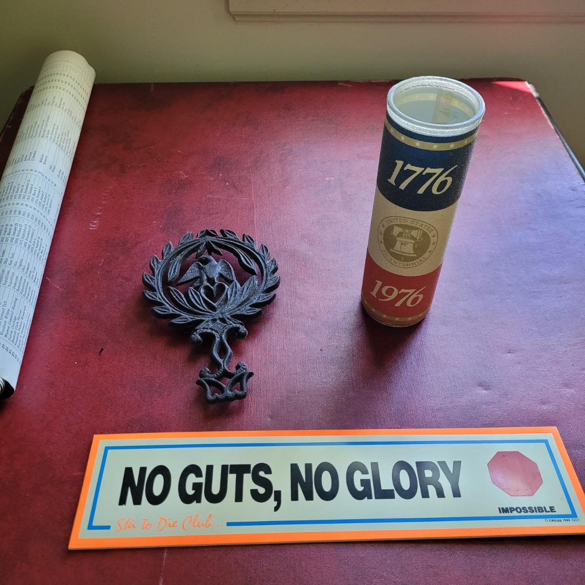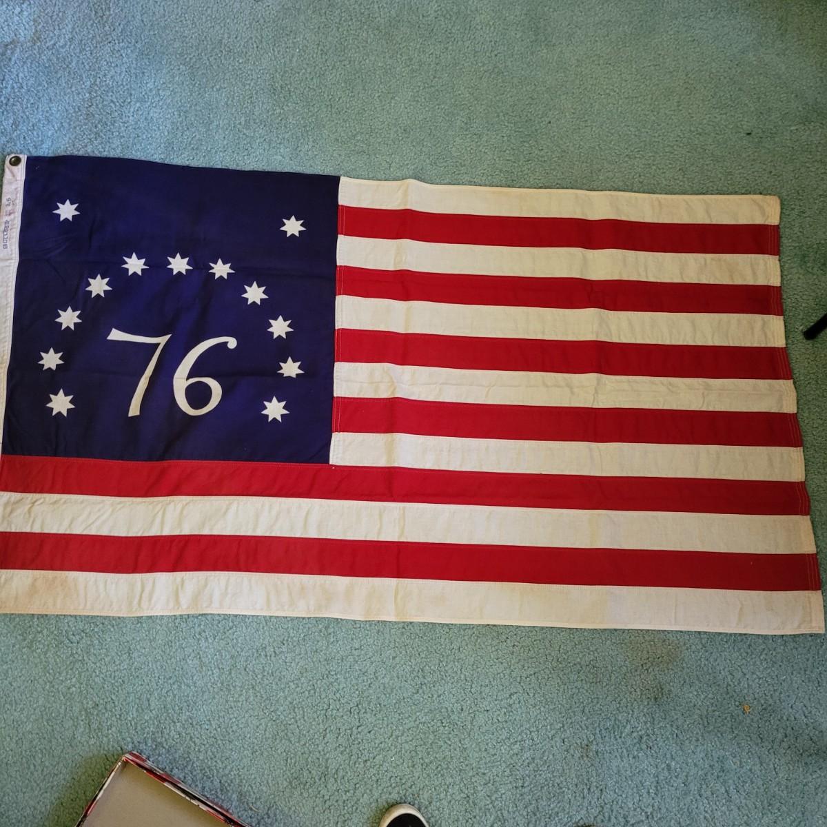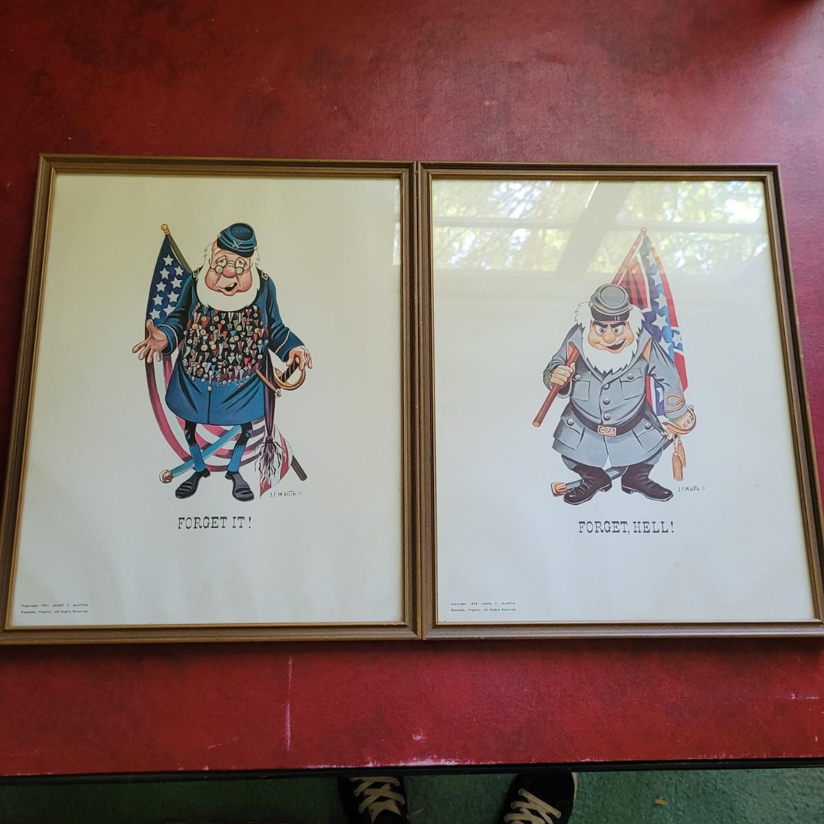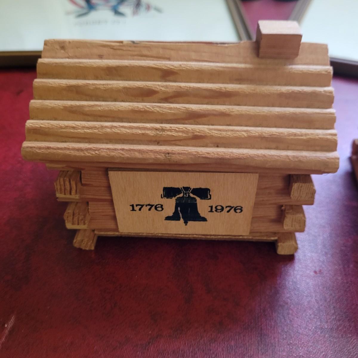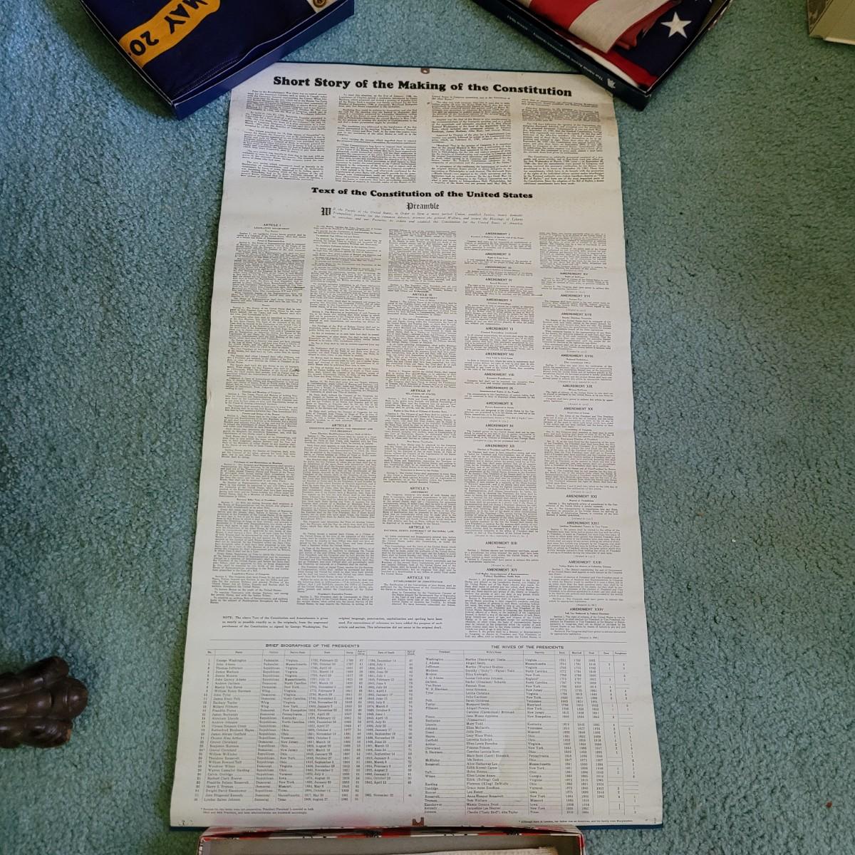 Collection of American and NC history memorabilia, including 3' x5' Americans and NC flags, small parade flags, Bicentennial candle holder and two log cabin piggy banks. Other items include metal American eagle decor, large American presidents calendar from 1966, commemorative engraved spoons, small green glass Liberty Bell bottles, and Civil War framed prints. For reference, Civil War prints depicting Union and Confederate Armies measure 17"L x14.5"W in frames. Shipping available.