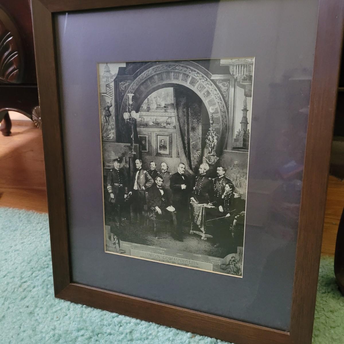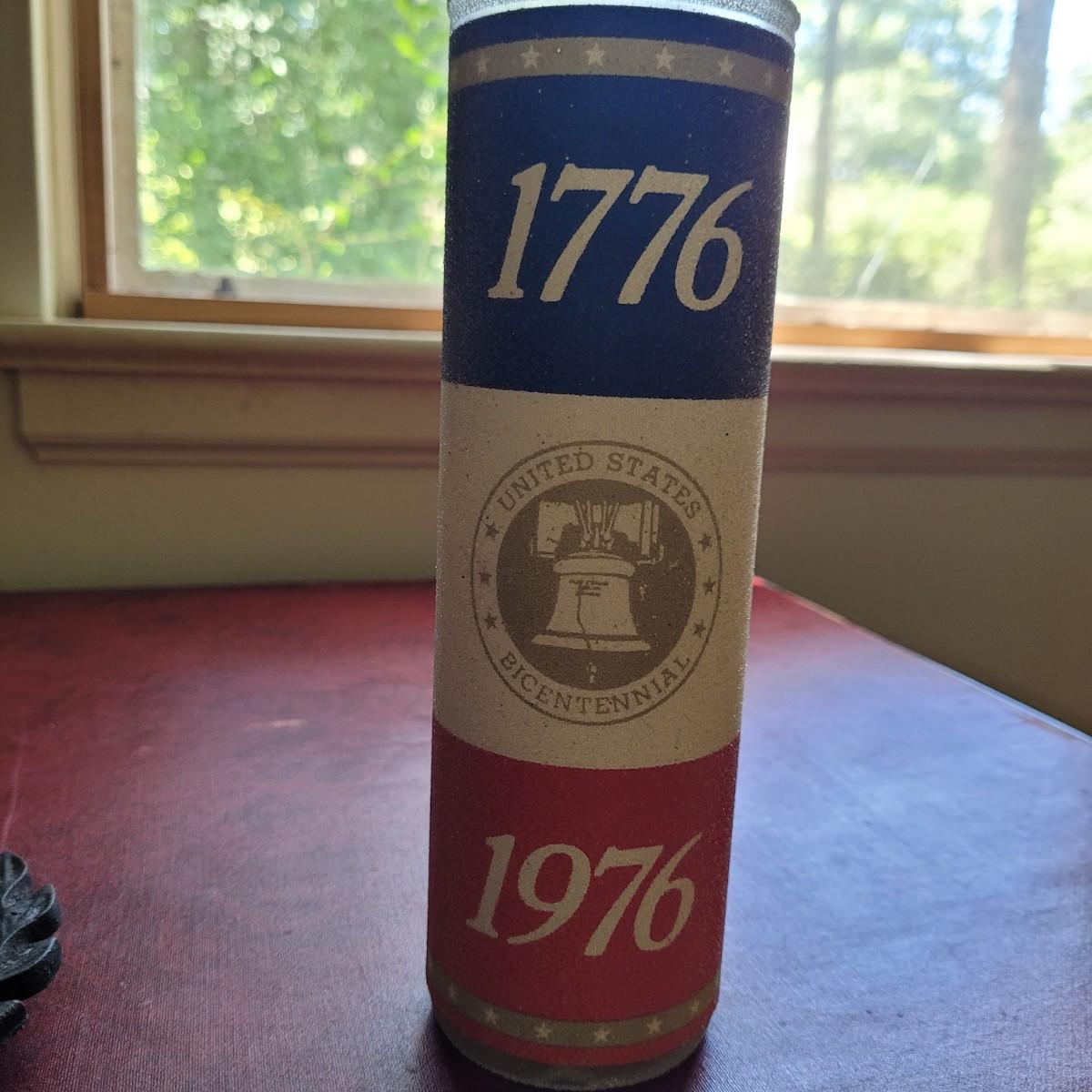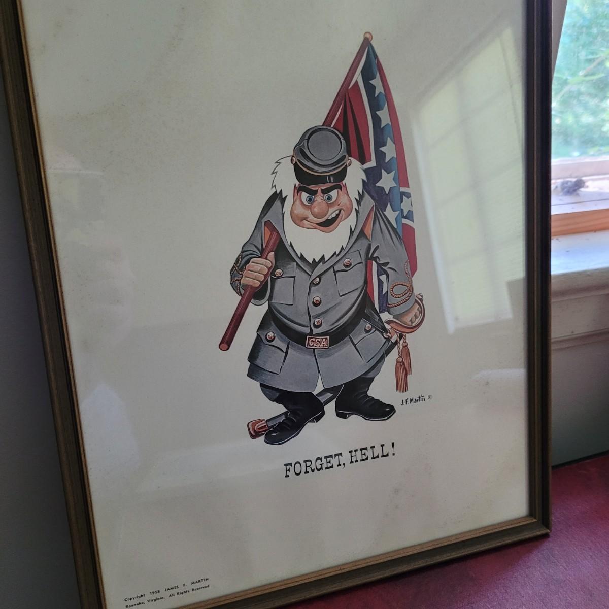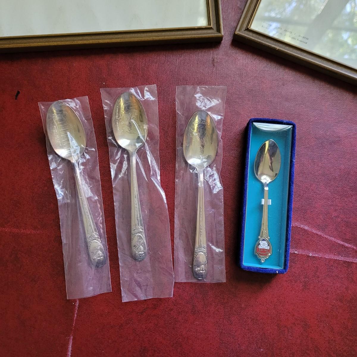 Collection of American and NC history memorabilia, including 3' x5' Americans and NC flags, small parade flags, Bicentennial candle holder and two log cabin piggy banks. Other items include metal American eagle decor, large American presidents calendar from 1966, commemorative engraved spoons, small green glass Liberty Bell bottles, and Civil War framed prints. For reference, Civil War prints depicting Union and Confederate Armies measure 17"L x14.5"W in frames. Shipping available.