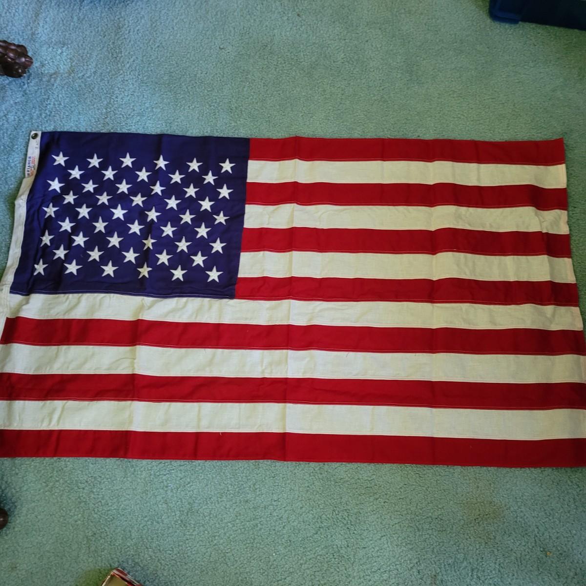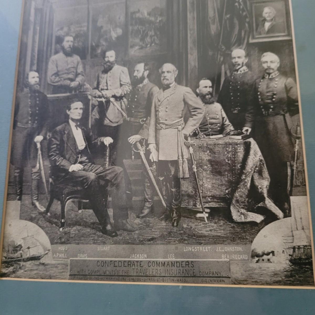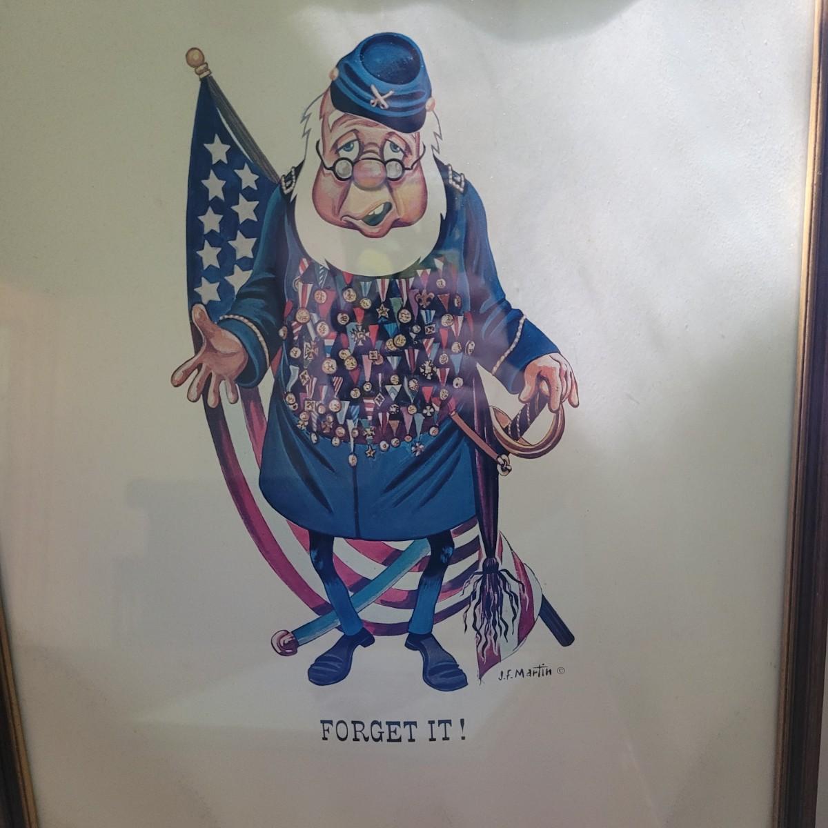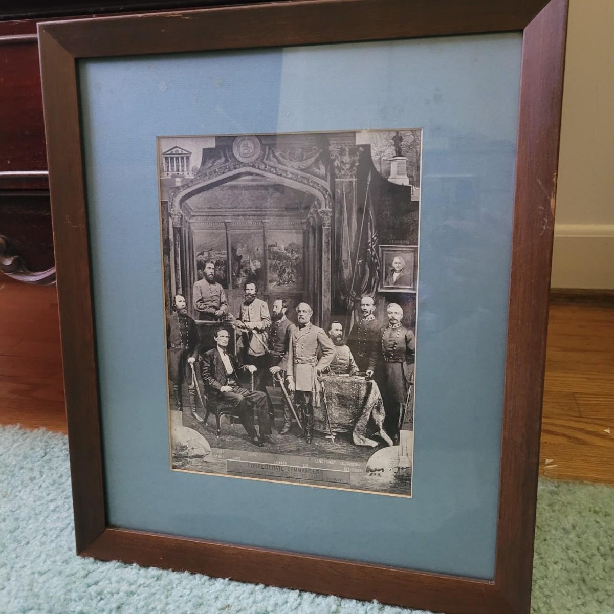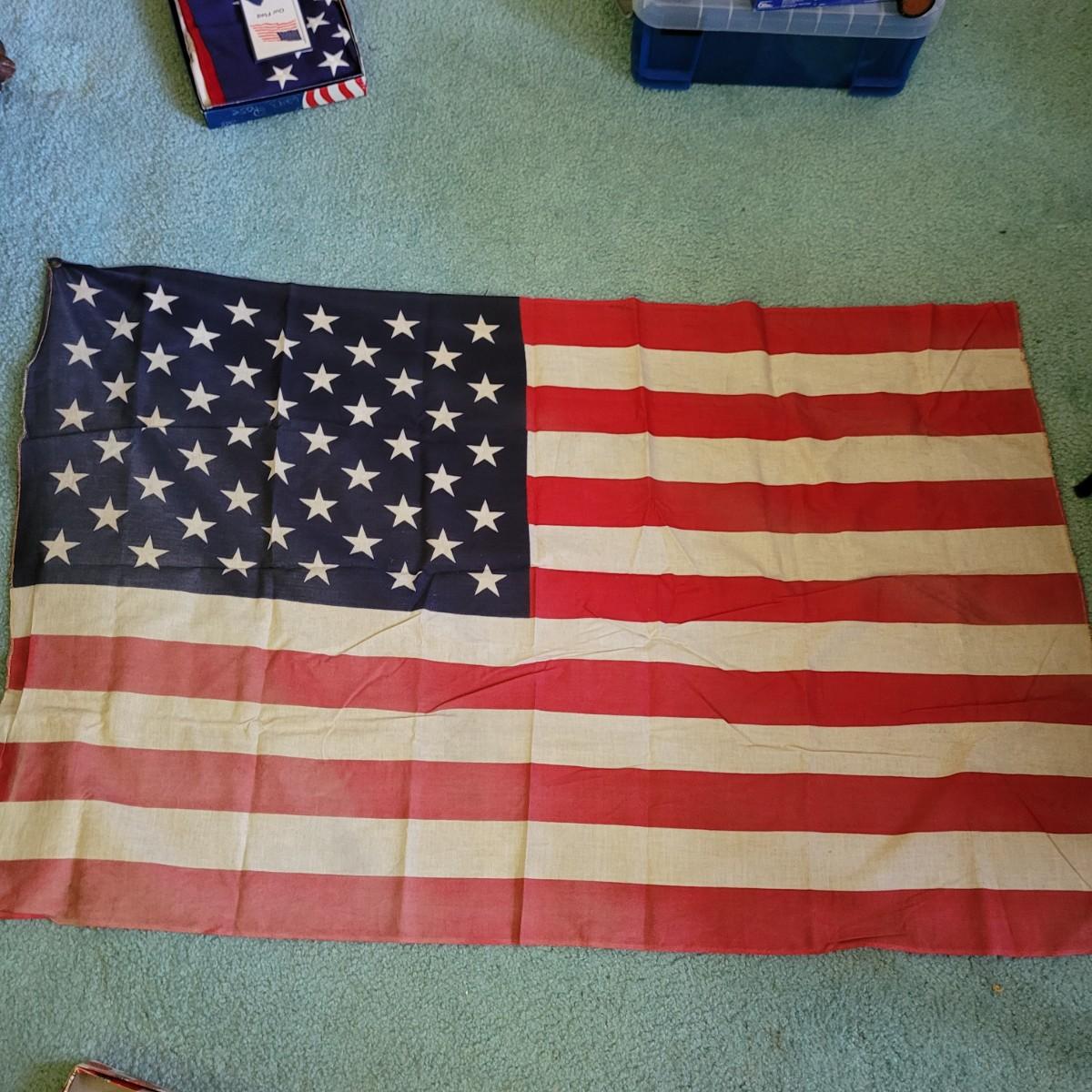 Collection of American and NC history memorabilia, including 3' x5' Americans and NC flags, small parade flags, Bicentennial candle holder and two log cabin piggy banks. Other items include metal American eagle decor, large American presidents calendar from 1966, commemorative engraved spoons, small green glass Liberty Bell bottles, and Civil War framed prints. For reference, Civil War prints depicting Union and Confederate Armies measure 17"L x14.5"W in frames. Shipping available.