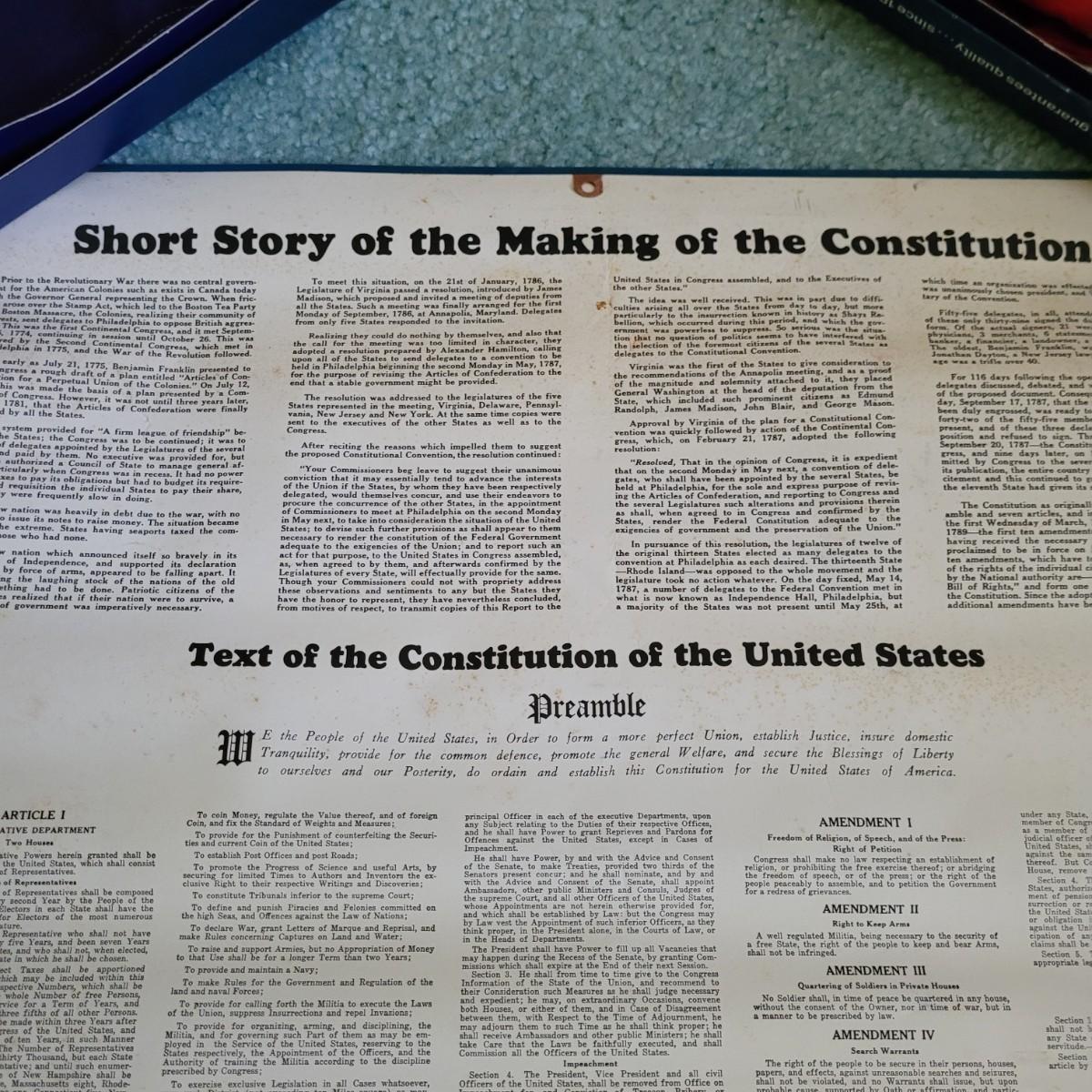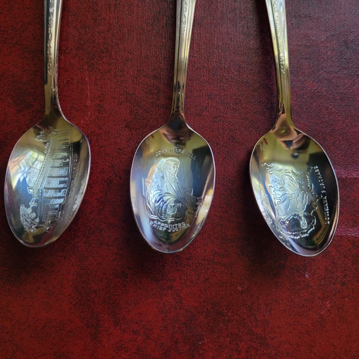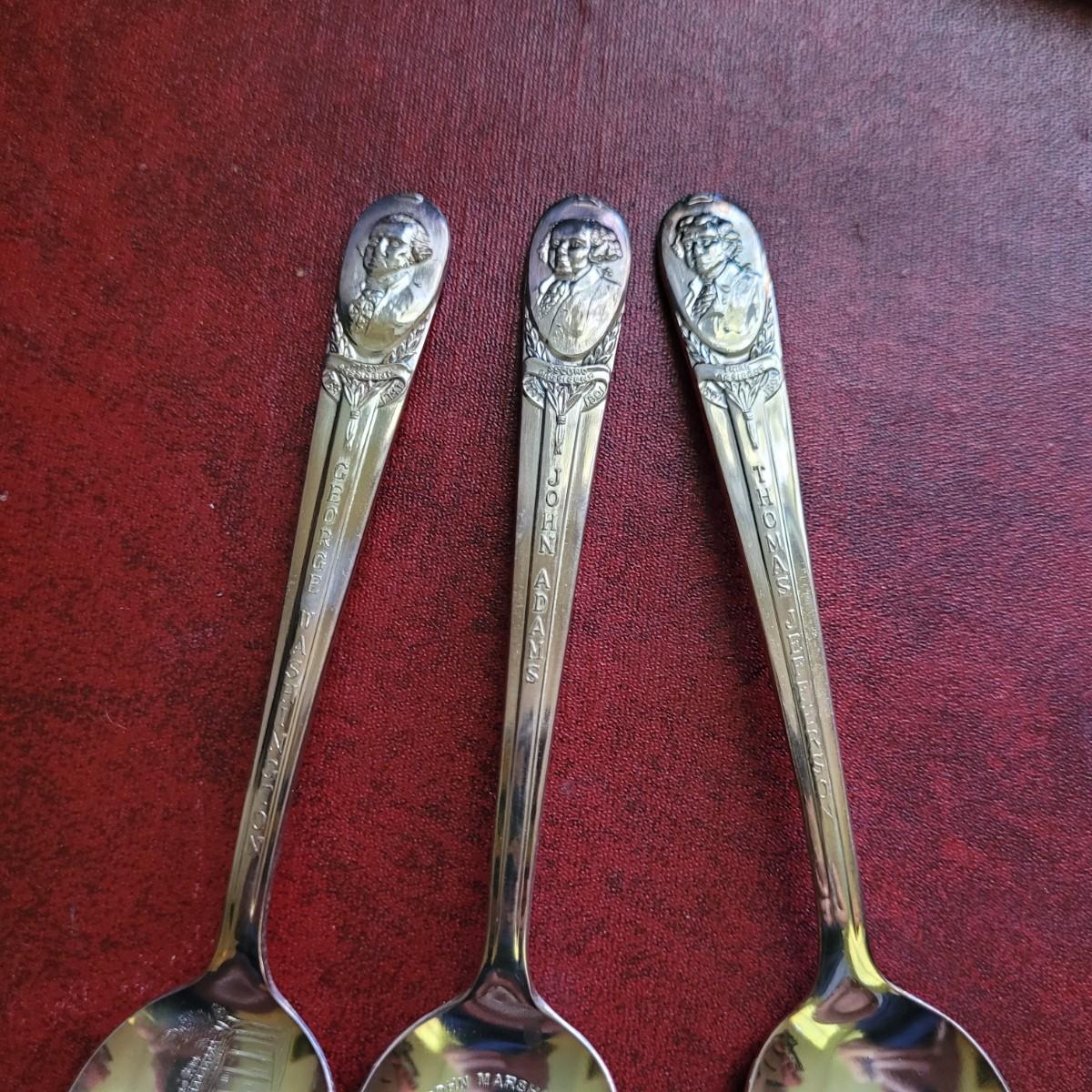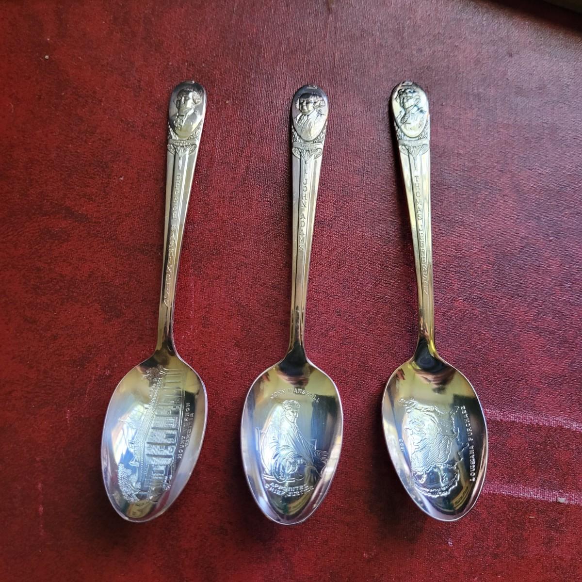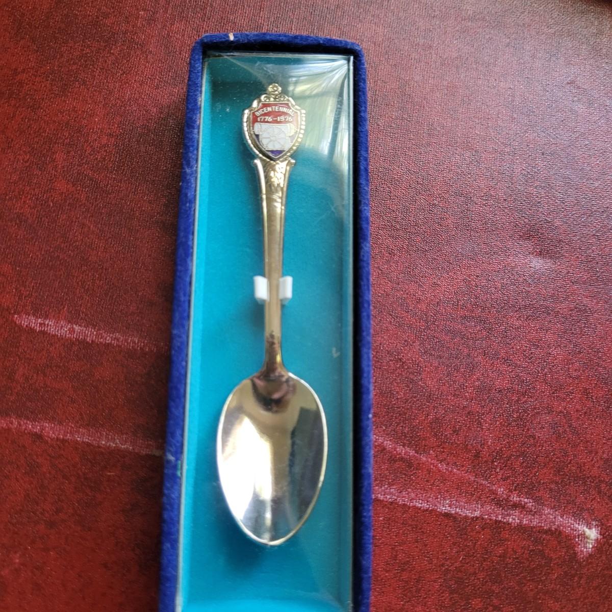 Collection of American and NC history memorabilia, including 3' x5' Americans and NC flags, small parade flags, Bicentennial candle holder and two log cabin piggy banks. Other items include metal American eagle decor, large American presidents calendar from 1966, commemorative engraved spoons, small green glass Liberty Bell bottles, and Civil War framed prints. For reference, Civil War prints depicting Union and Confederate Armies measure 17"L x14.5"W in frames. Shipping available.