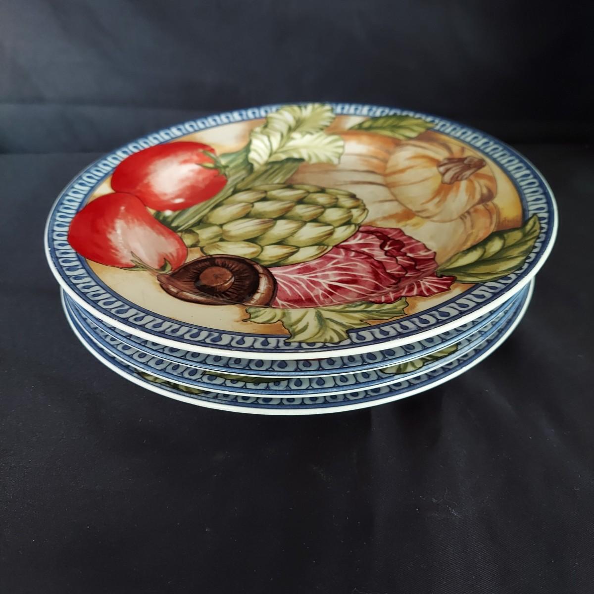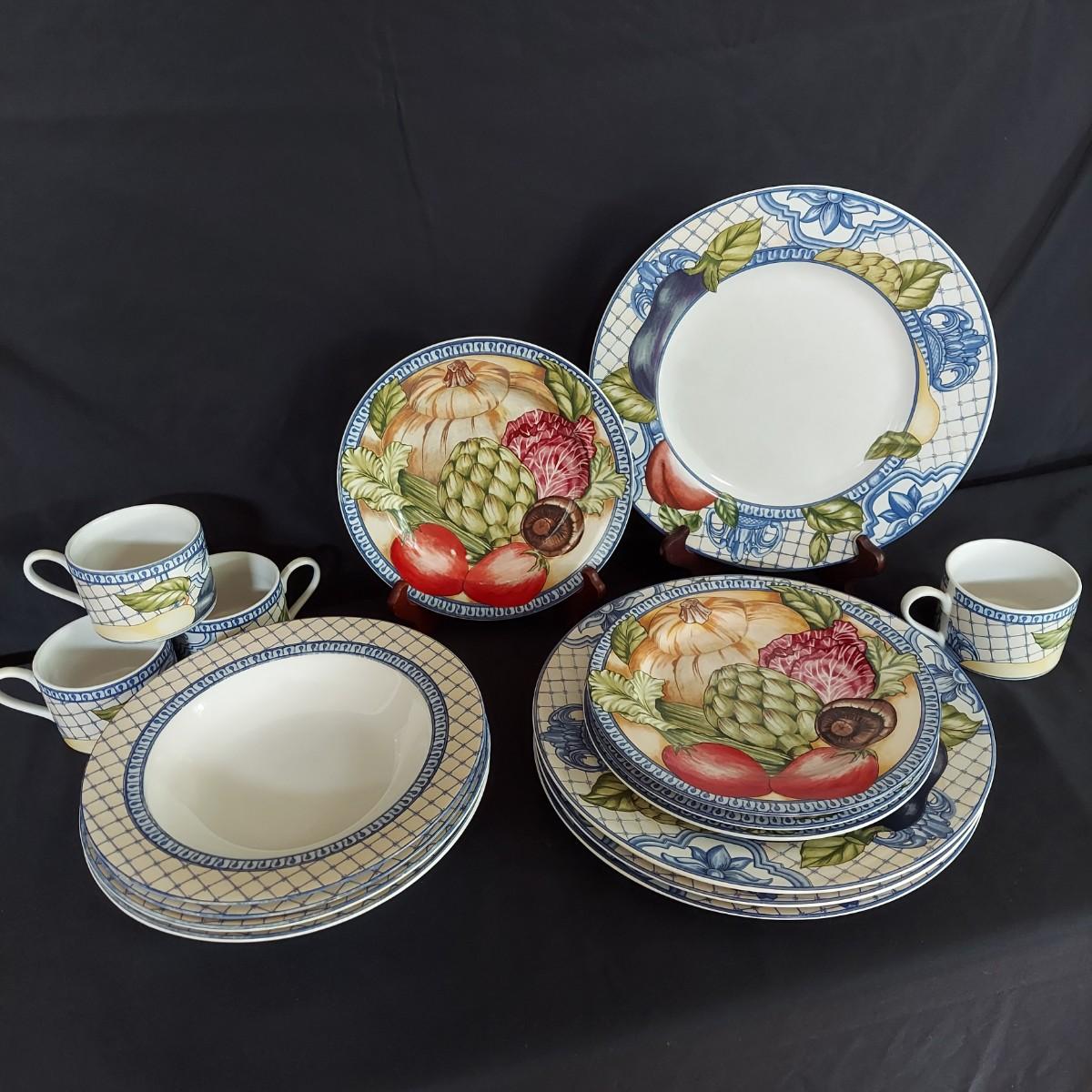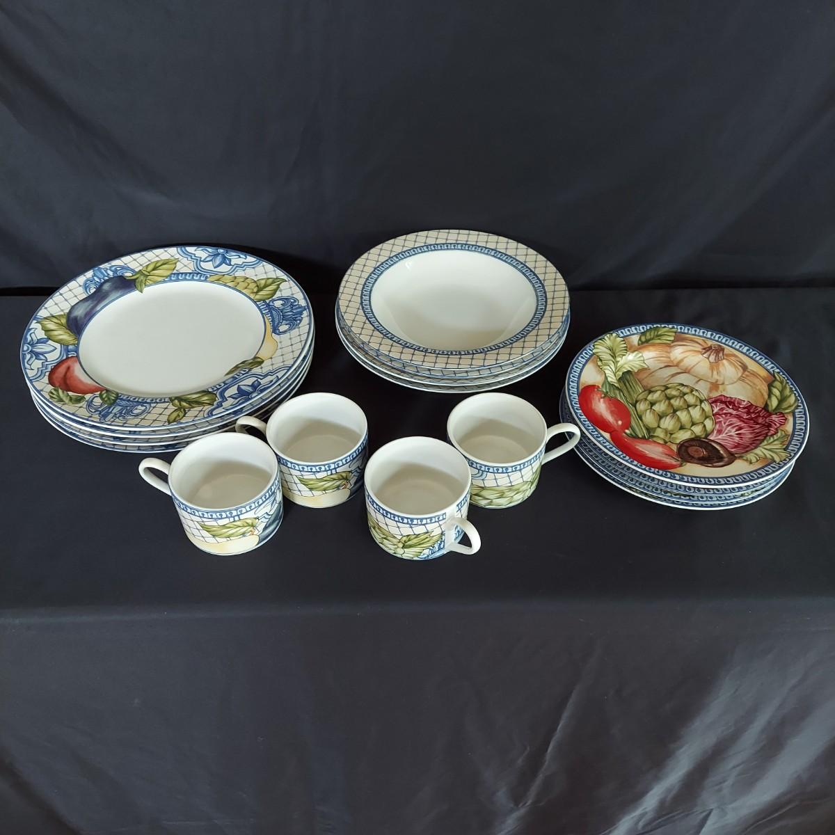 Vegetable print dishes. Four place settings of American Atelier Le Verdure dishes including an 11" dinner plate, an 8" salad plate, a 9" bowl and coffee cup. Local Pickup Only