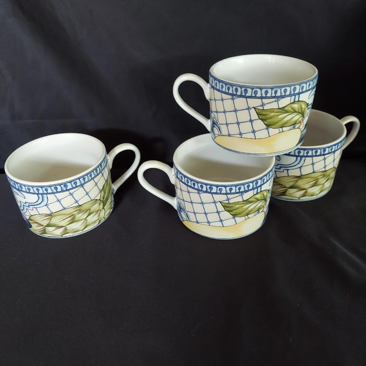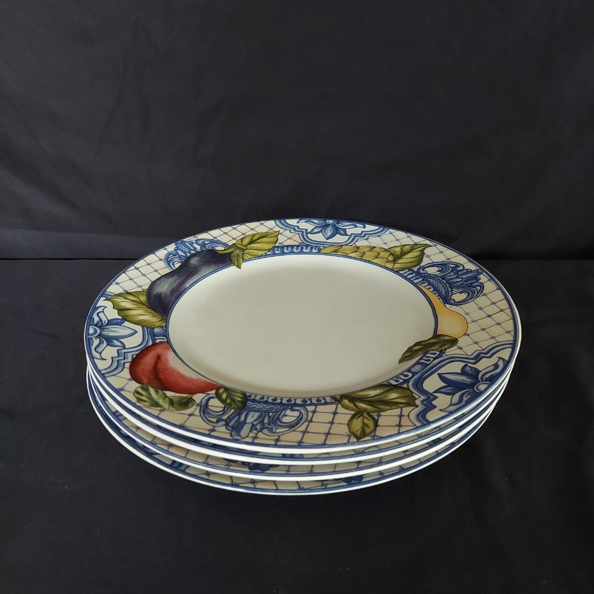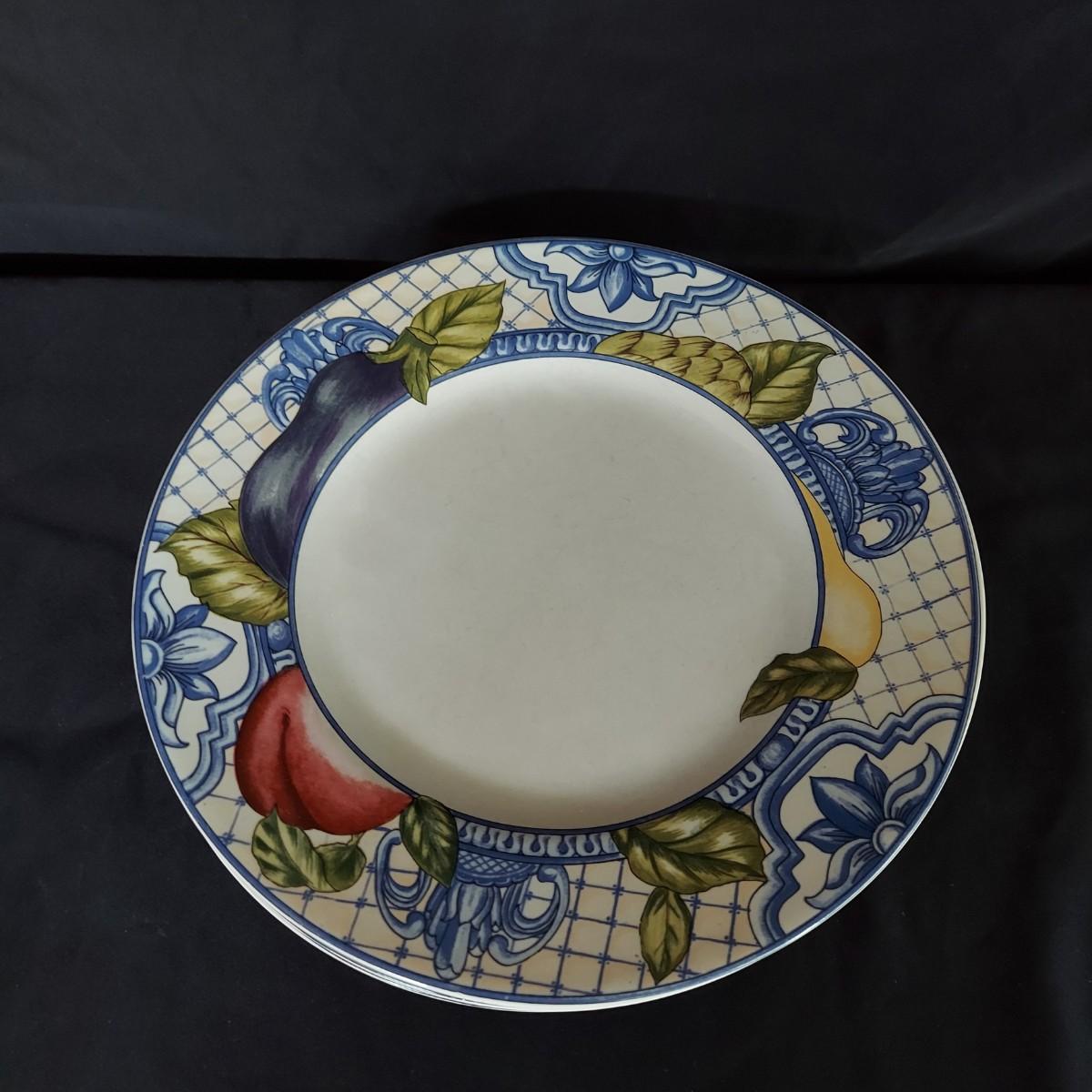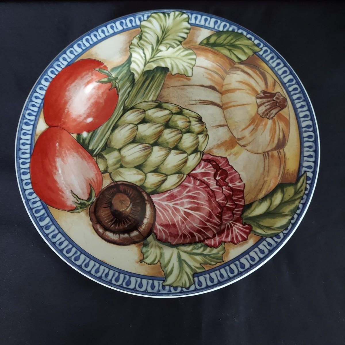 Vegetable print dishes. Four place settings of American Atelier Le Verdure dishes including an 11" dinner plate, an 8" salad plate, a 9" bowl and coffee cup. Local Pickup Only