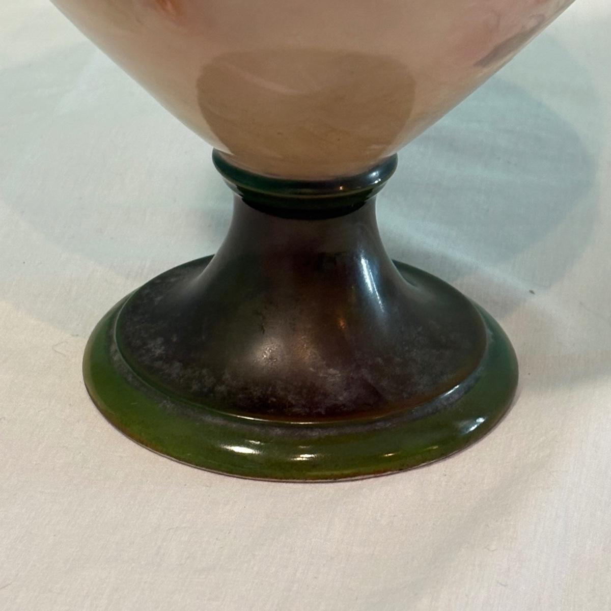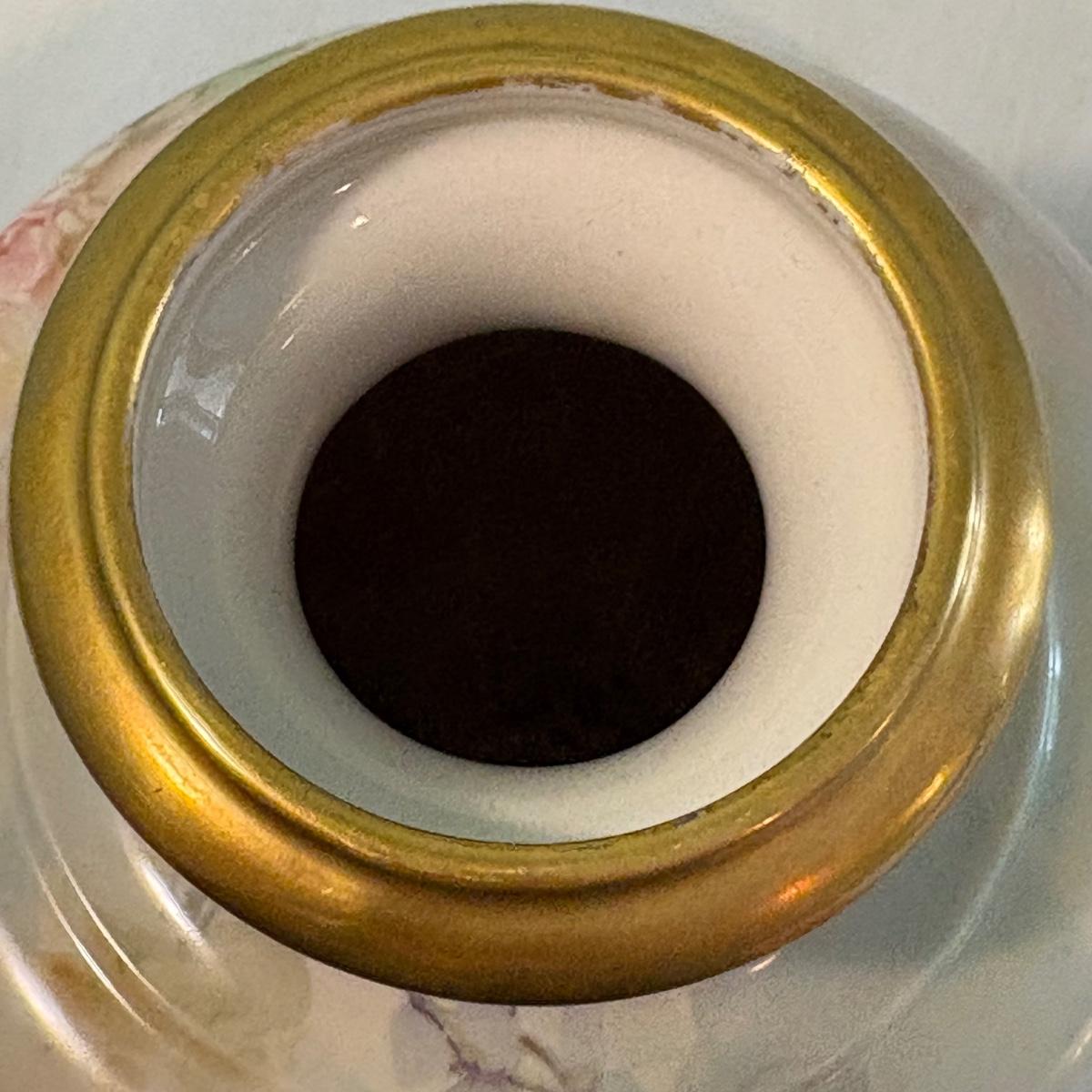 This American Belleek porcelain vase features a Baluster shape with hand painted clusters of roses with a gold-gilded rim. The measurements are approximately 5"D x 10.5"H. See photos for more details.