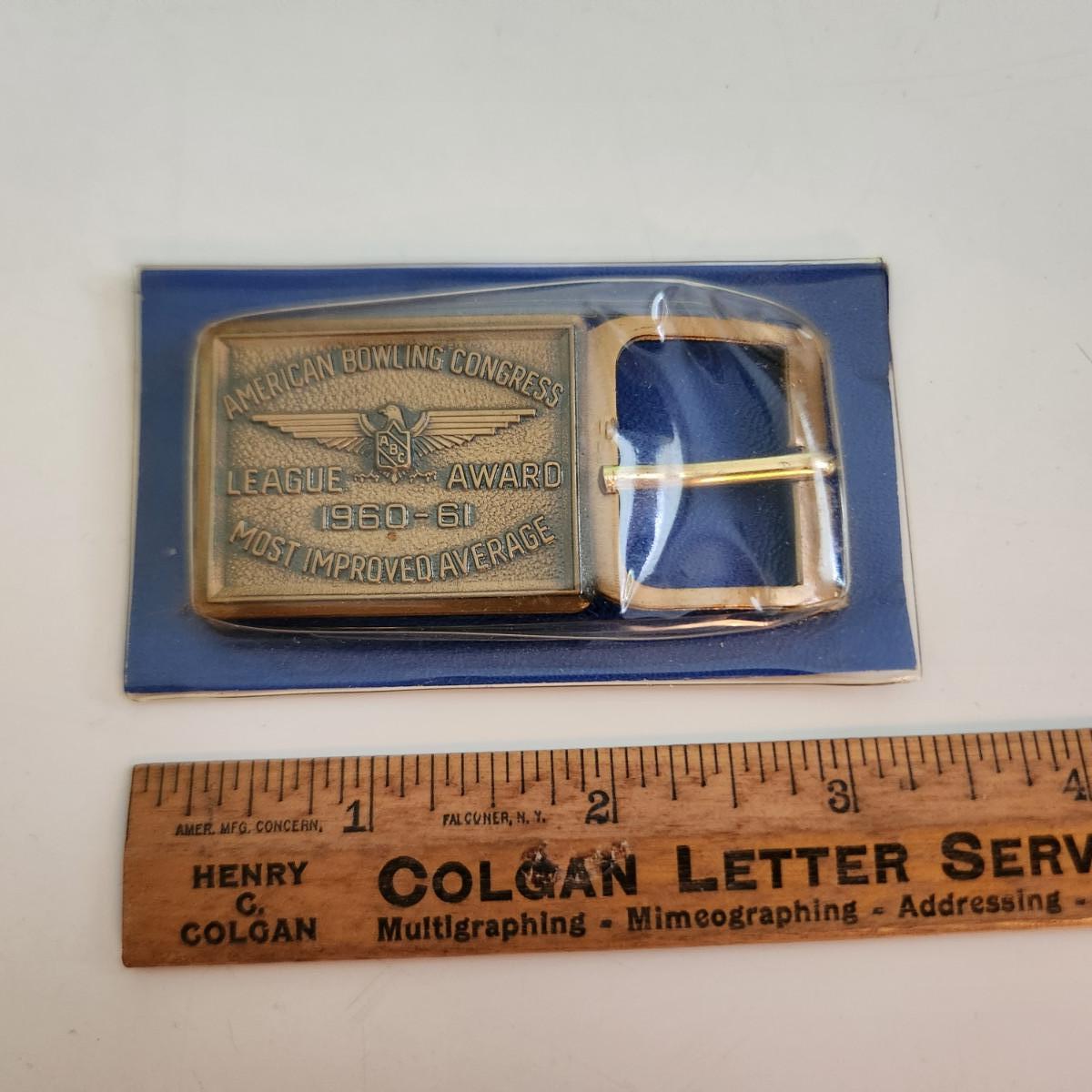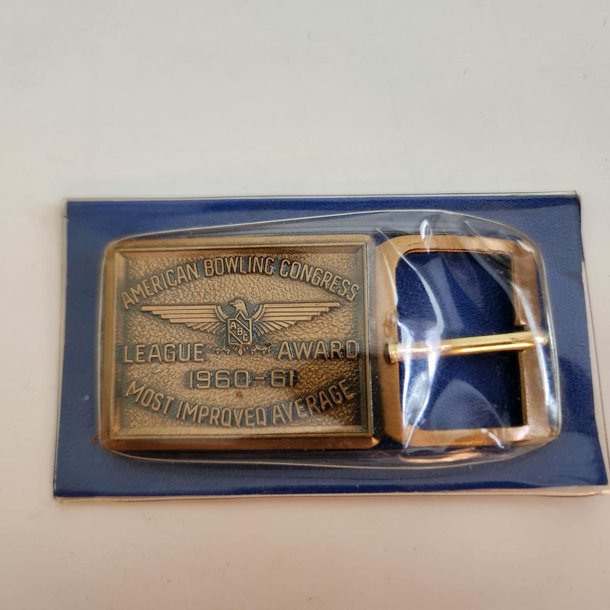 This auction lot is for an American Bowling Congress Belt Buckle Award. Dated 1960-61 this award is for the most improved average. Nice old bowling collectible. Still in it's original plastic covering.