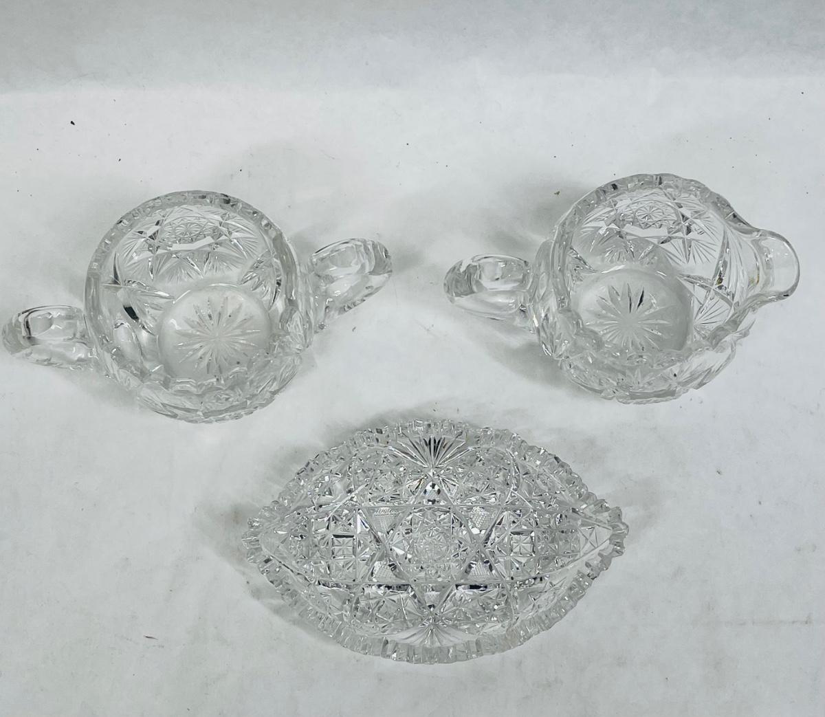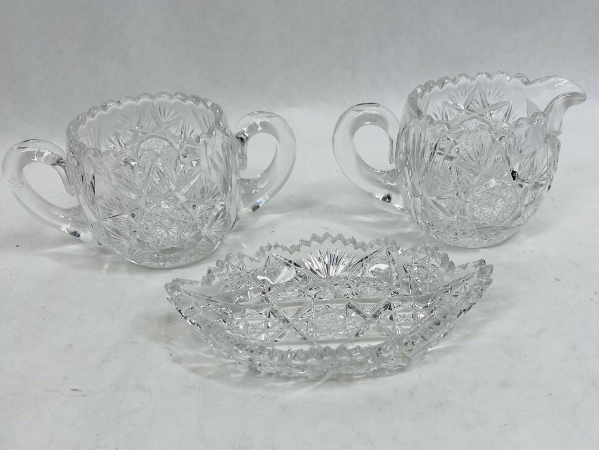 American Brilliant Cut Glass Cream & Sugar with small Serving Dish saw tooth edge