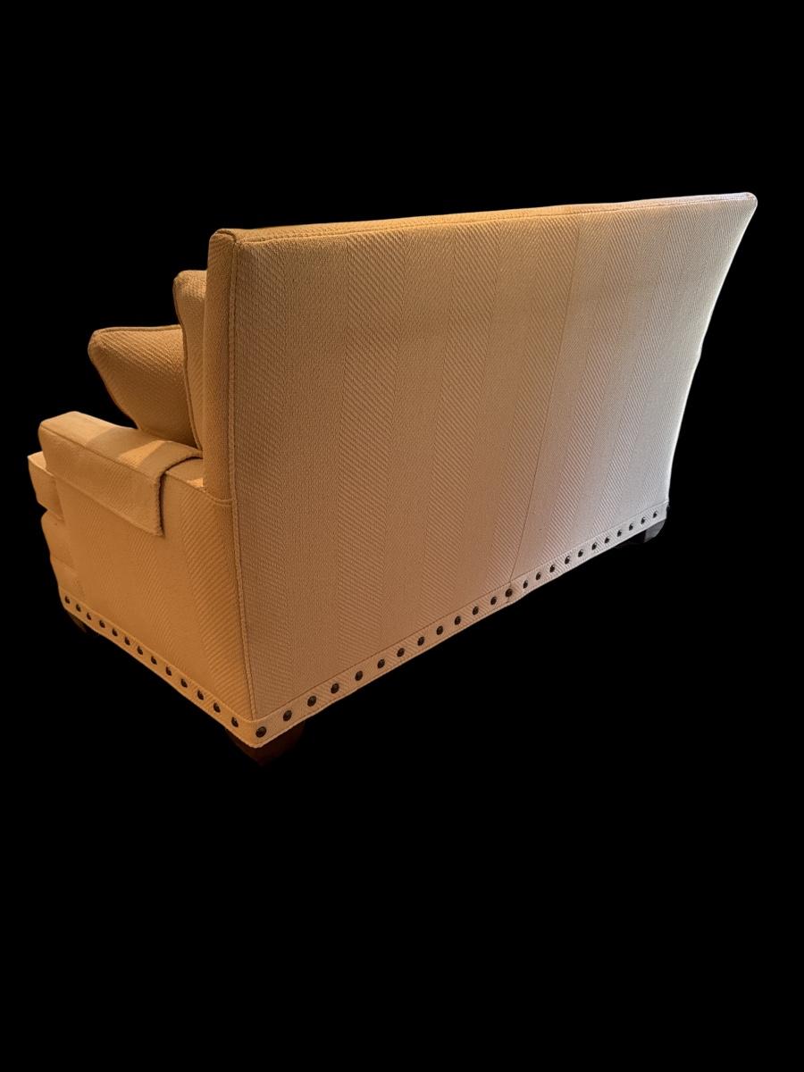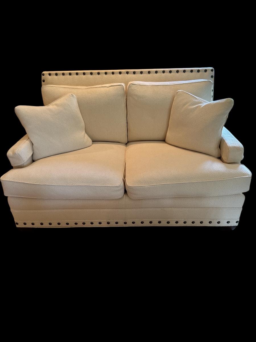 1 of 2 /This elegant upholstered loveseat features a neutral, textured fabric in a soft beige or cream tone. The design includes: