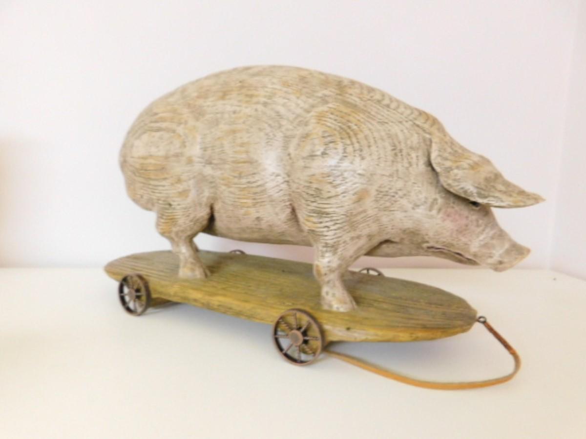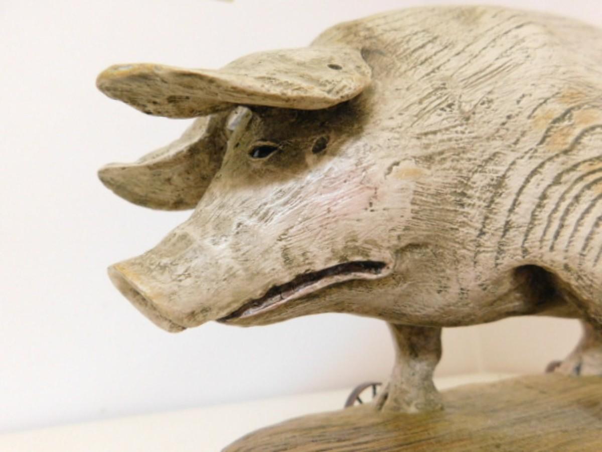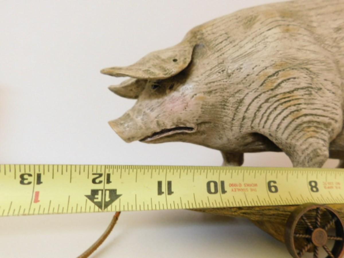 American Chestnut Folk Art 'Sweet Vadalia' Large Resin Wood Grain Finish Pig on a Pull Cart