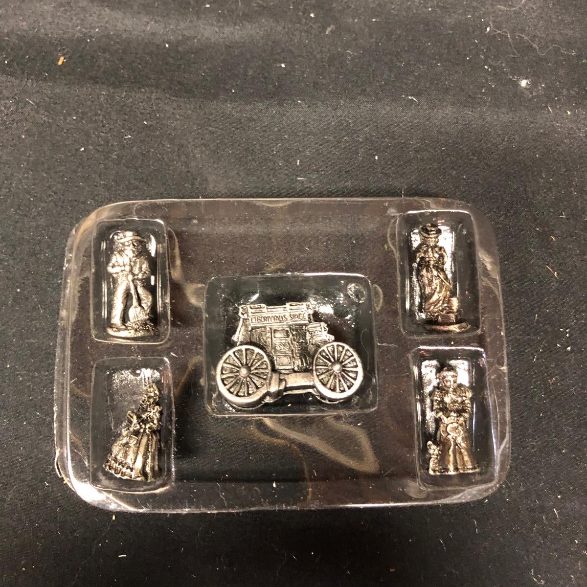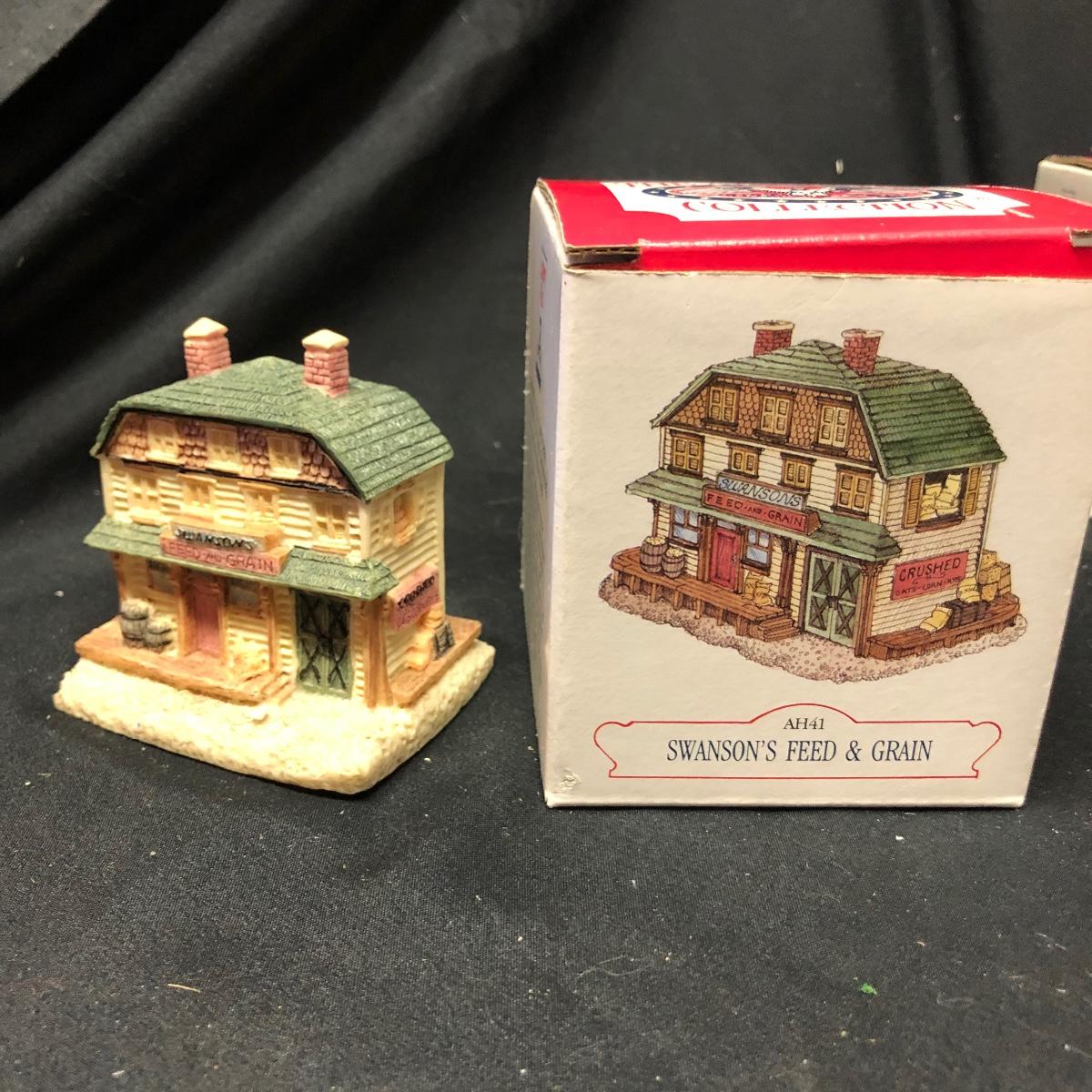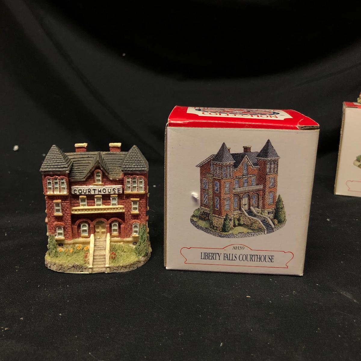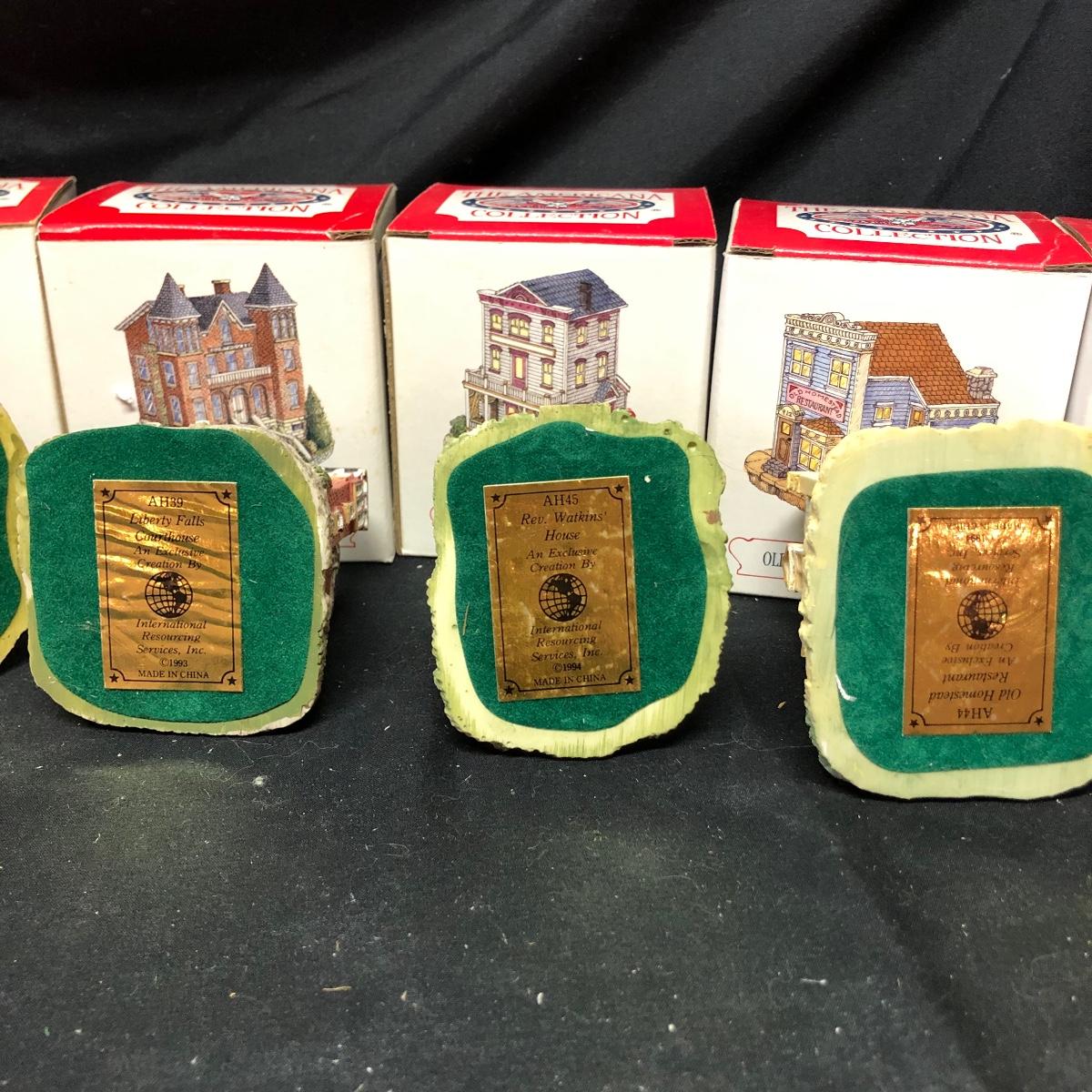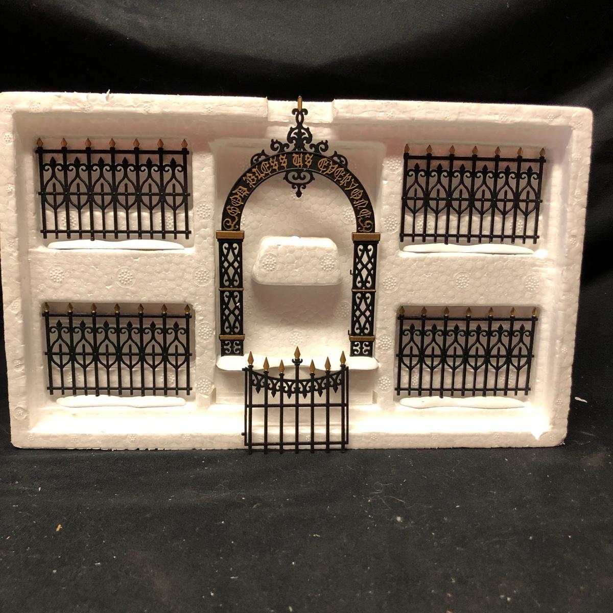 Lot contains nine The Americana Collection buildings, in boxes, as well as two 5-piece sets of Liberty Falls Americana Pewter Collection. Also included is a Department 56 wrought iron fence and gate and two green spruce trees. Buildings measure 3” tall.