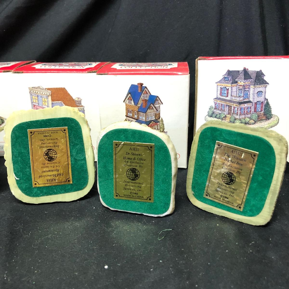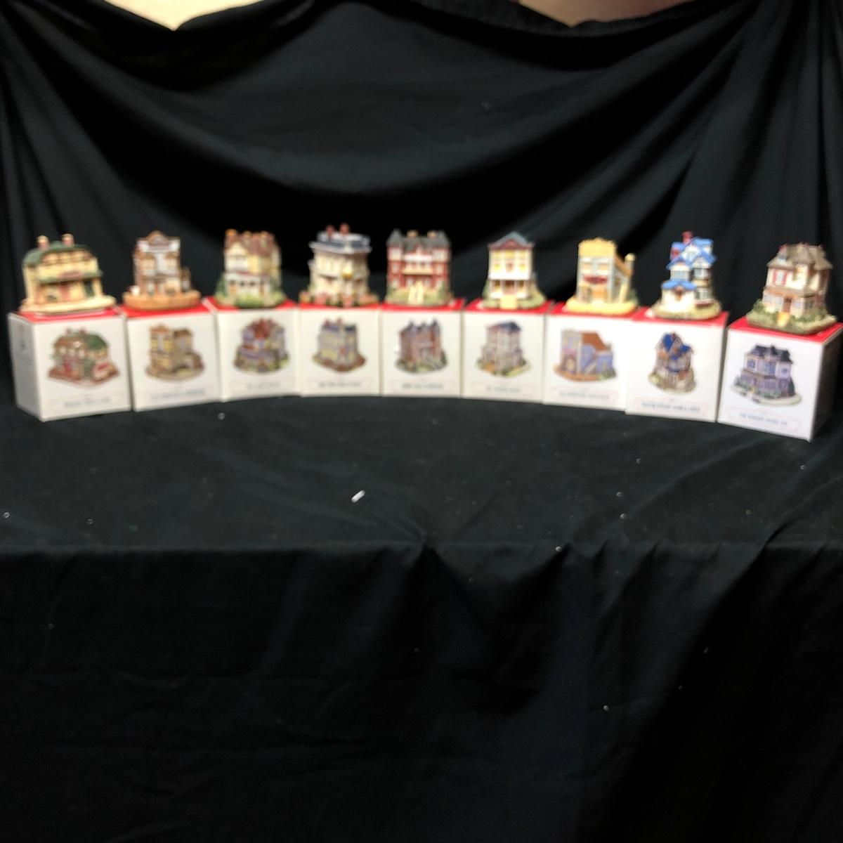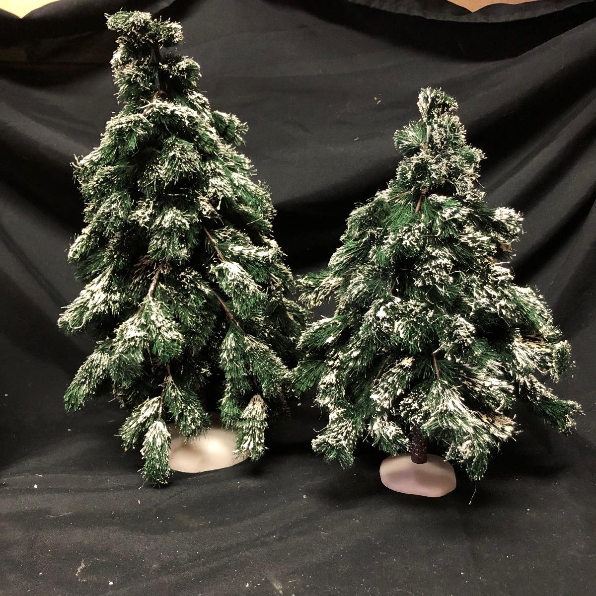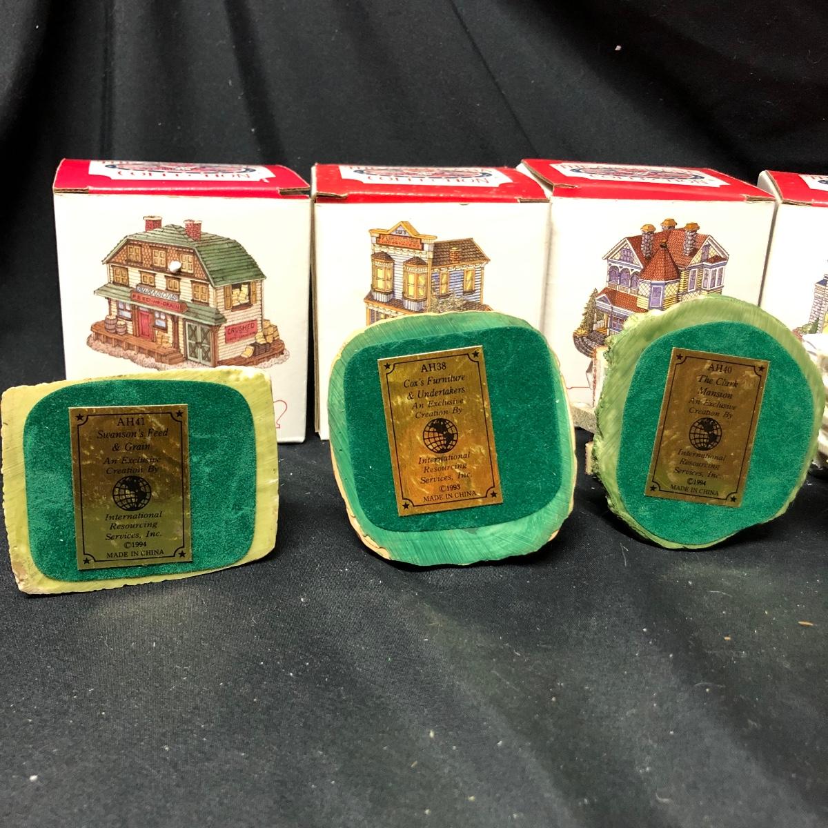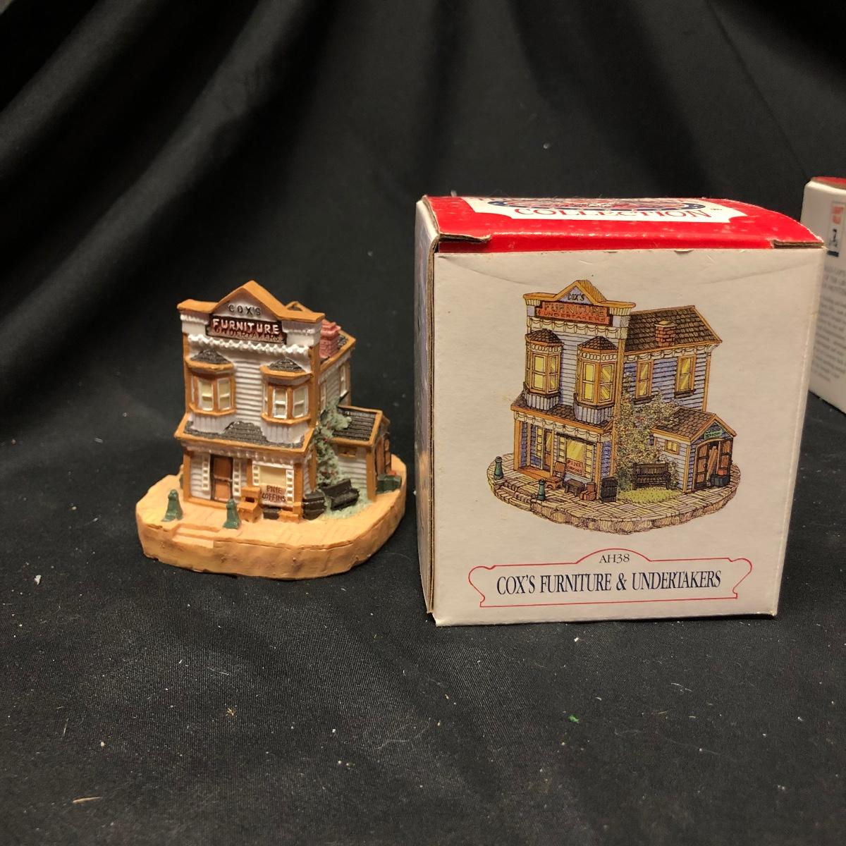 Lot contains nine The Americana Collection buildings, in boxes, as well as two 5-piece sets of Liberty Falls Americana Pewter Collection. Also included is a Department 56 wrought iron fence and gate and two green spruce trees. Buildings measure 3” tall.