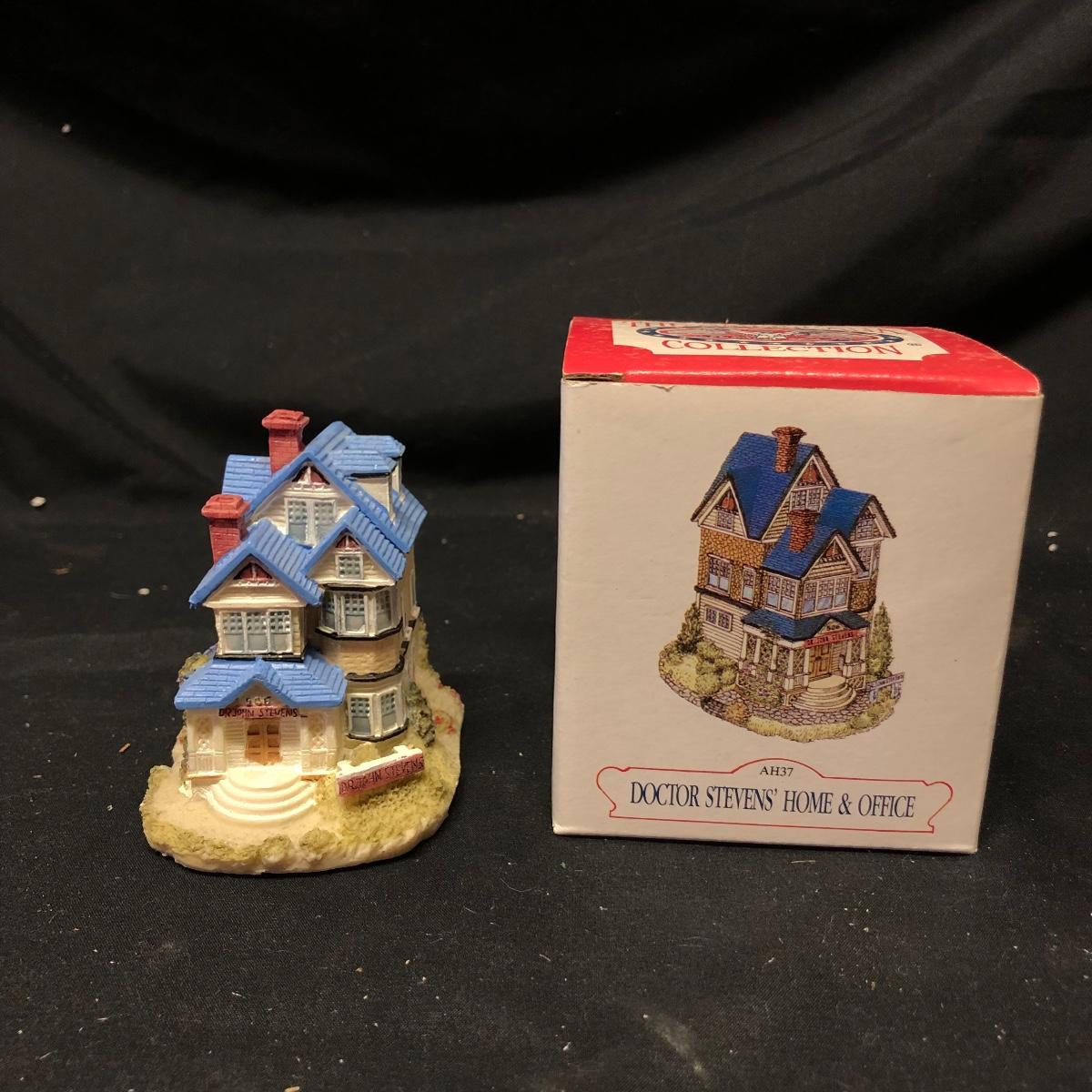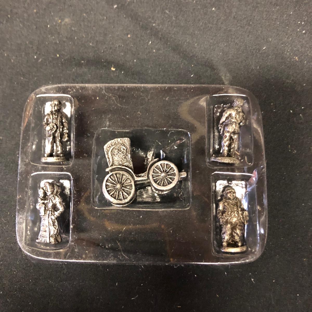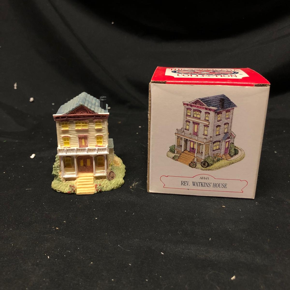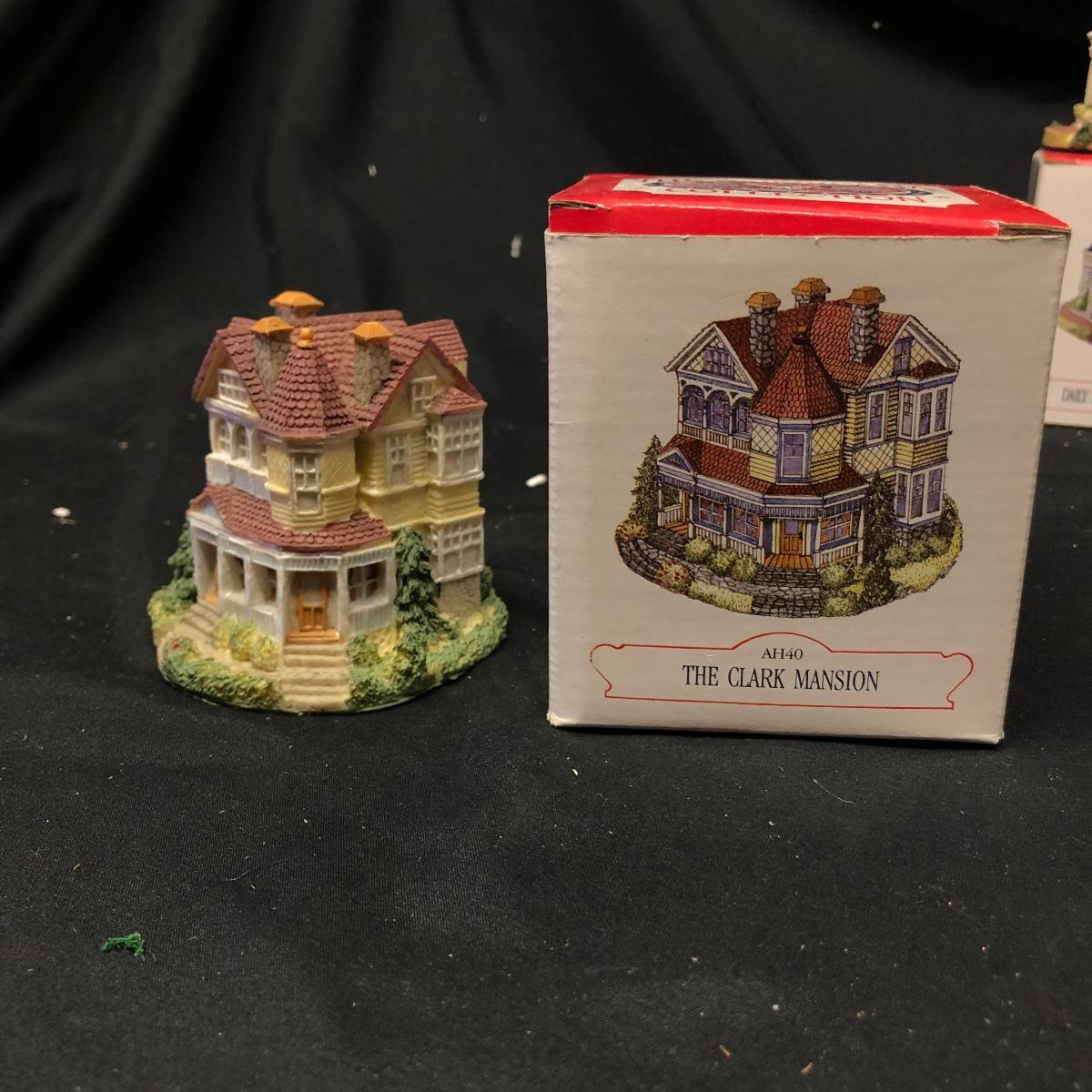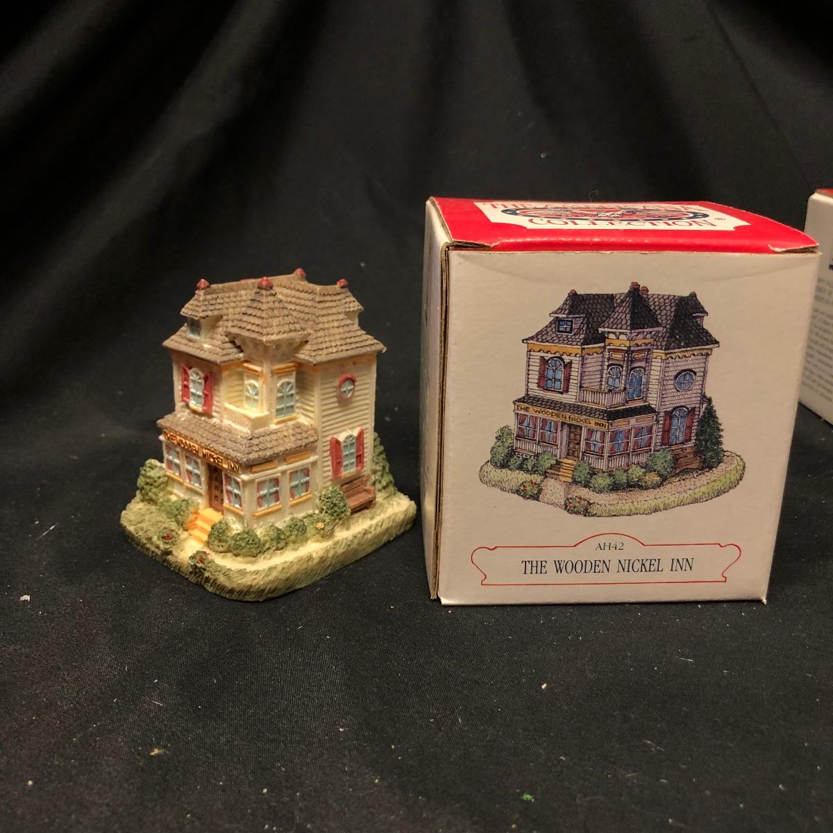 Lot contains nine The Americana Collection buildings, in boxes, as well as two 5-piece sets of Liberty Falls Americana Pewter Collection. Also included is a Department 56 wrought iron fence and gate and two green spruce trees. Buildings measure 3” tall.