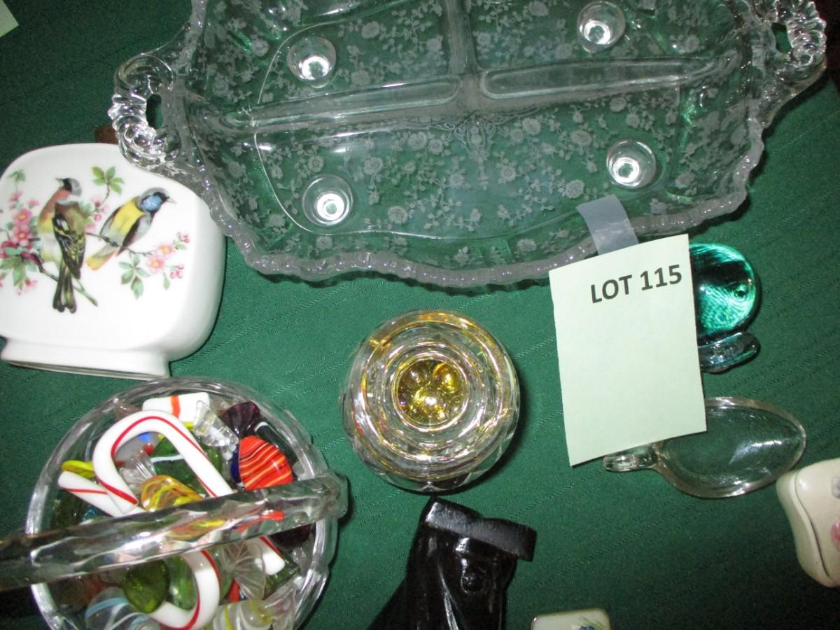 Glass S & P Shakers, Etched glass relish tray, candy dish w/glass candy, trinkets