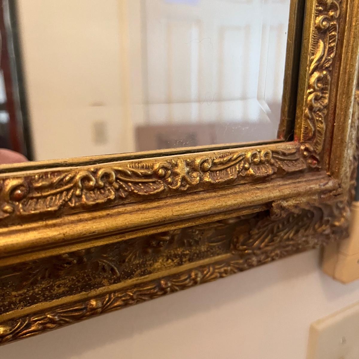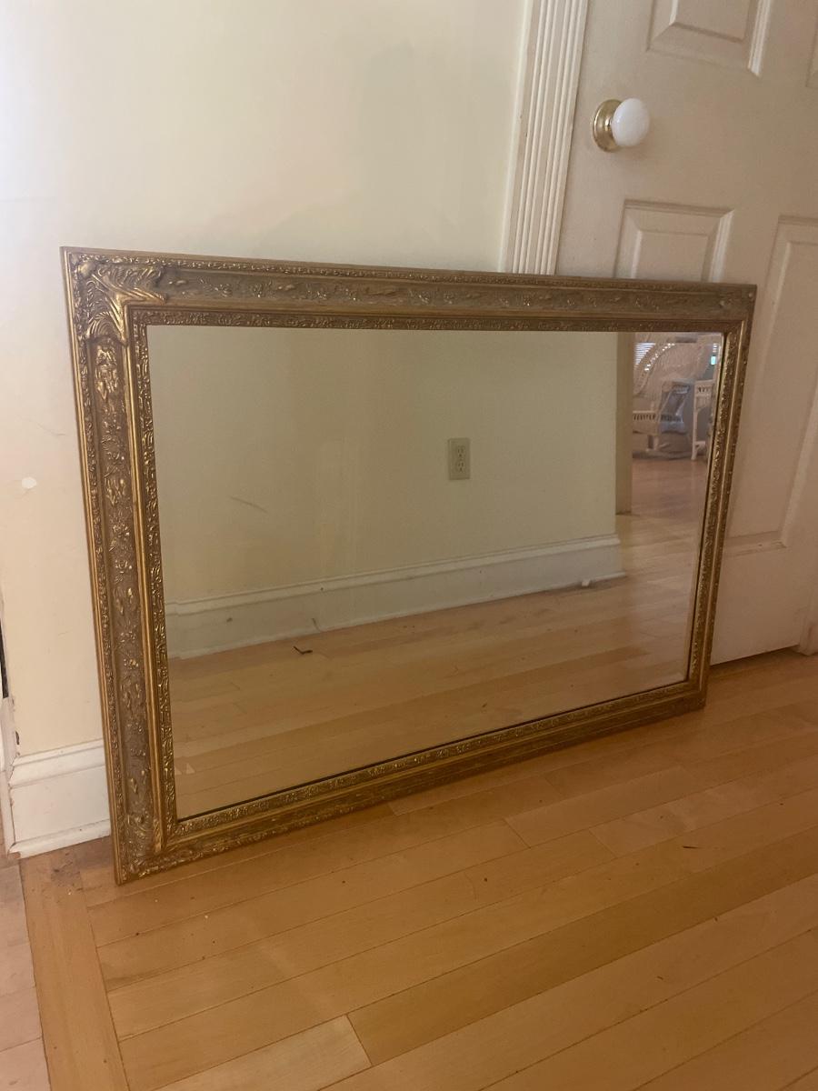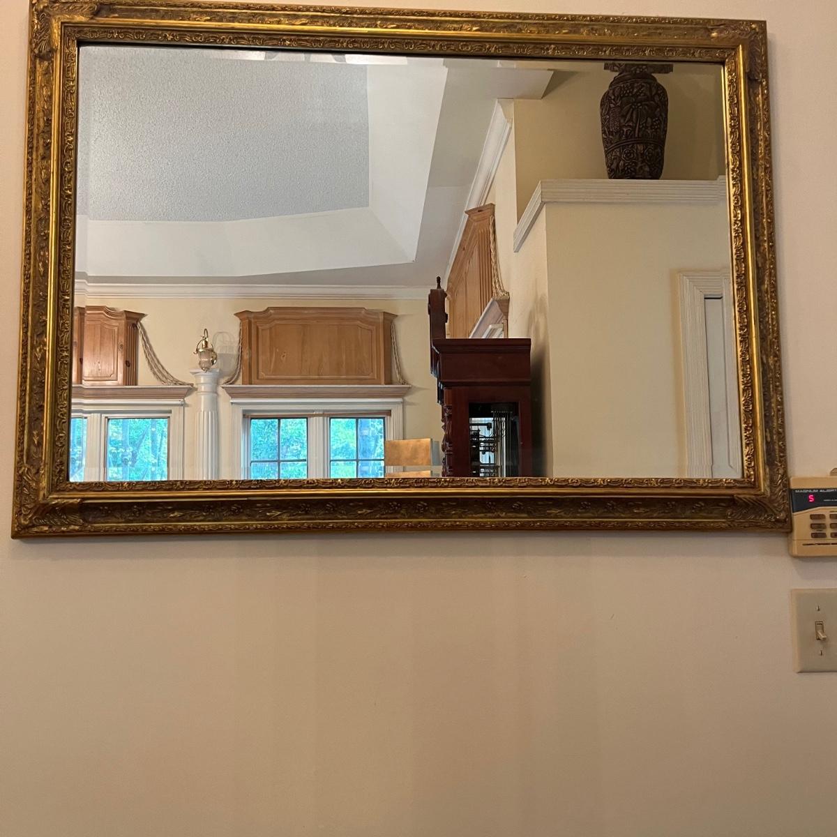 Lot includes a American Decor brand gold colored wooden framed beveled mirror. Mirror has hanging wire to hang both directions. Mirror measures 29” x 41”.