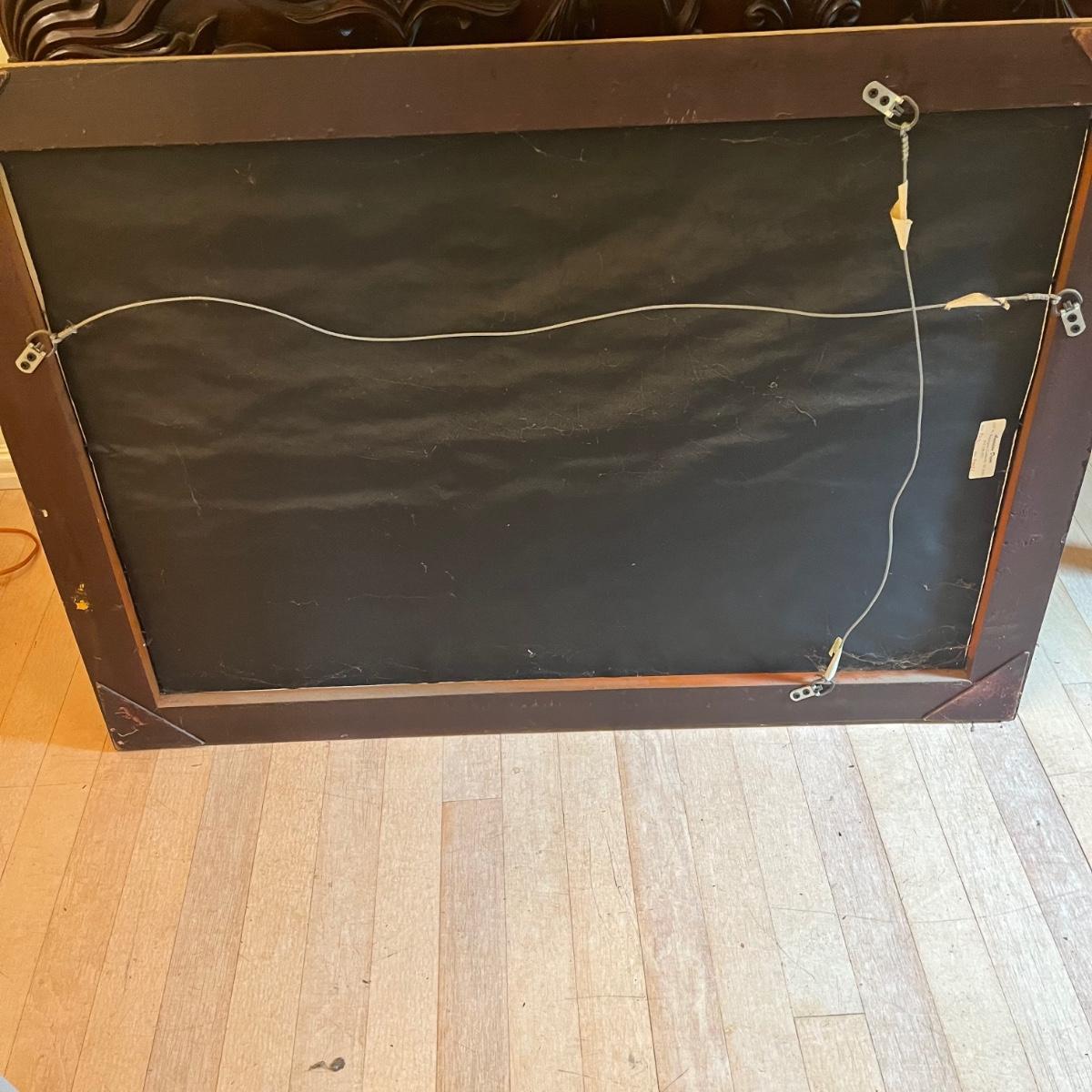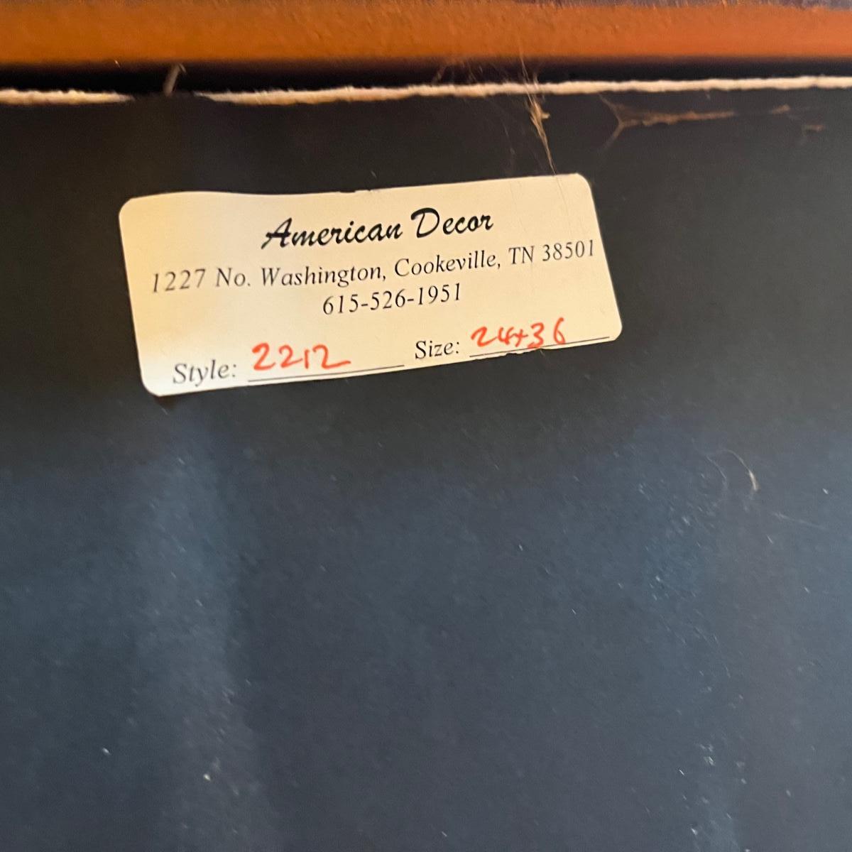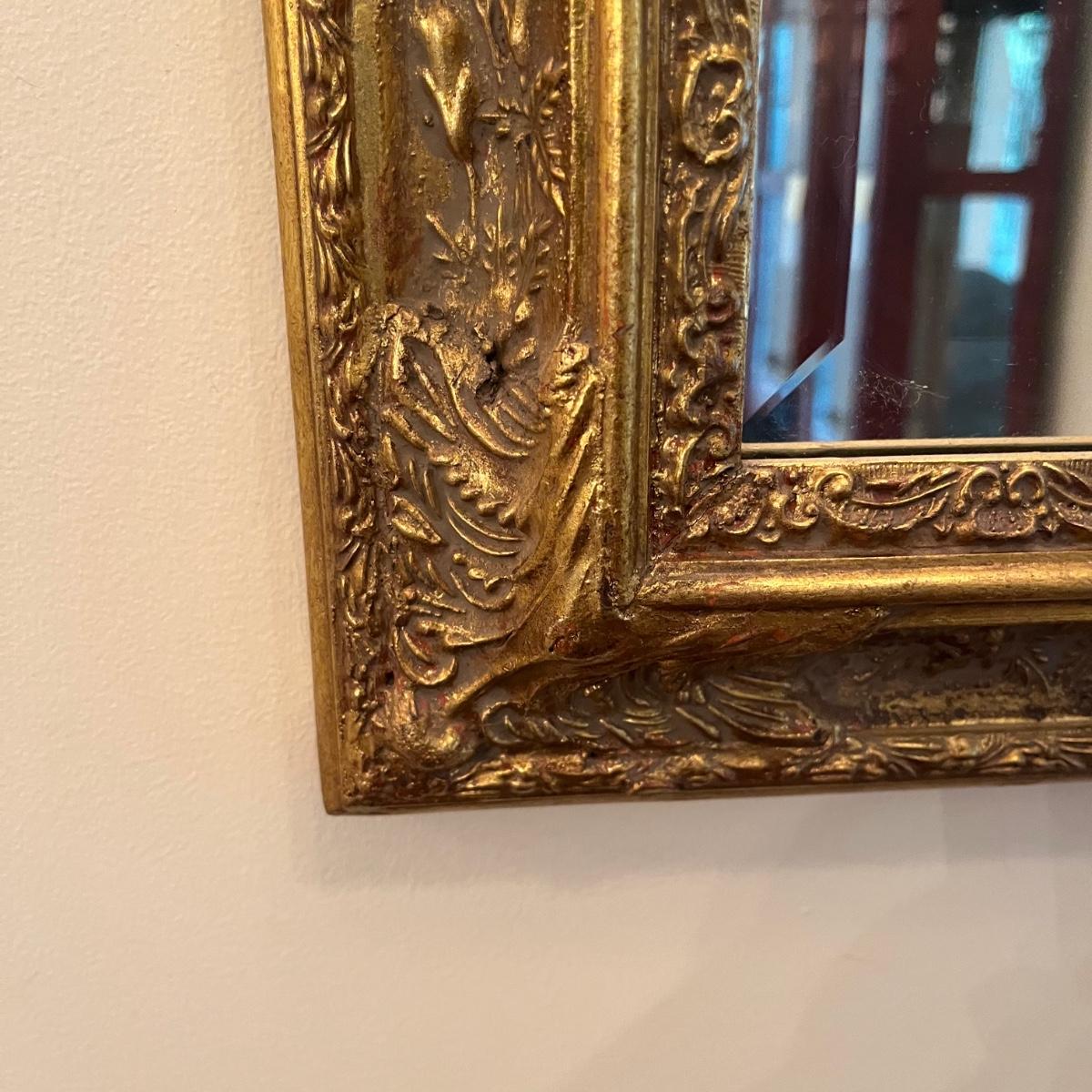 Lot includes a American Decor brand gold colored wooden framed beveled mirror. Mirror has hanging wire to hang both directions. Mirror measures 29” x 41”.