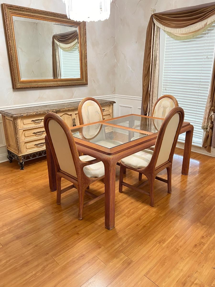 Includes: Glass top table, 2 Captains chairs, & 2 regular chairs ~ *Chairs need to be reupholstered ~ Table = 30” H x 64” W x 42” D ~ Both captains chairs = 43” H x 22” W x 25” D ~ Both regular chairs = 43” H x 20” W x 25” D