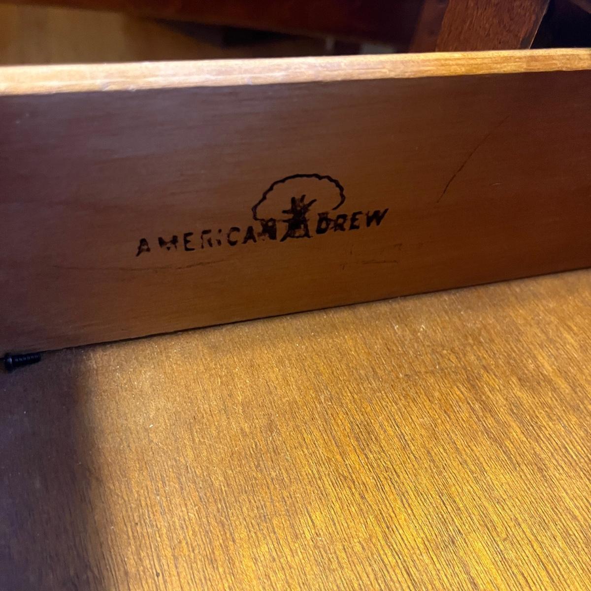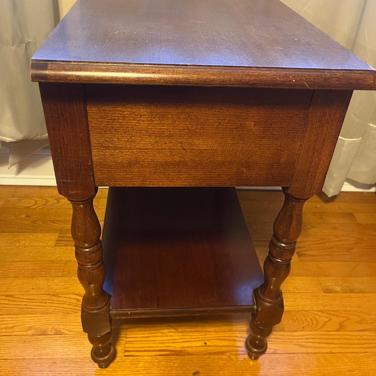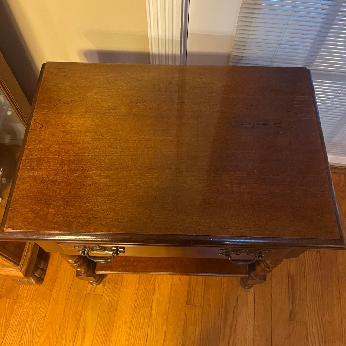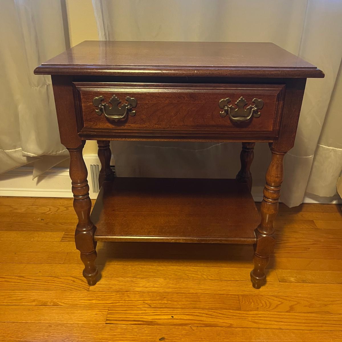 This solid wood American Drew end table has one drawer and a shelf underneath. Table measures 24” x 16” x 26.5”H. Top has finish wearing off in spots, see pictures.