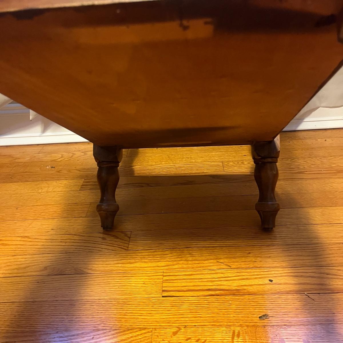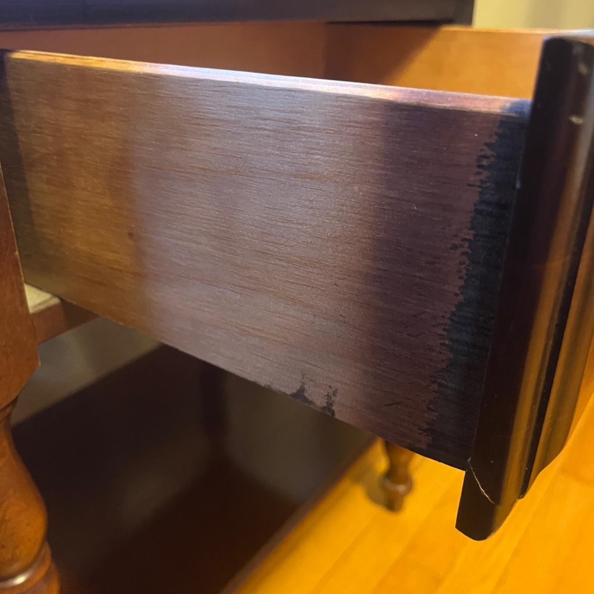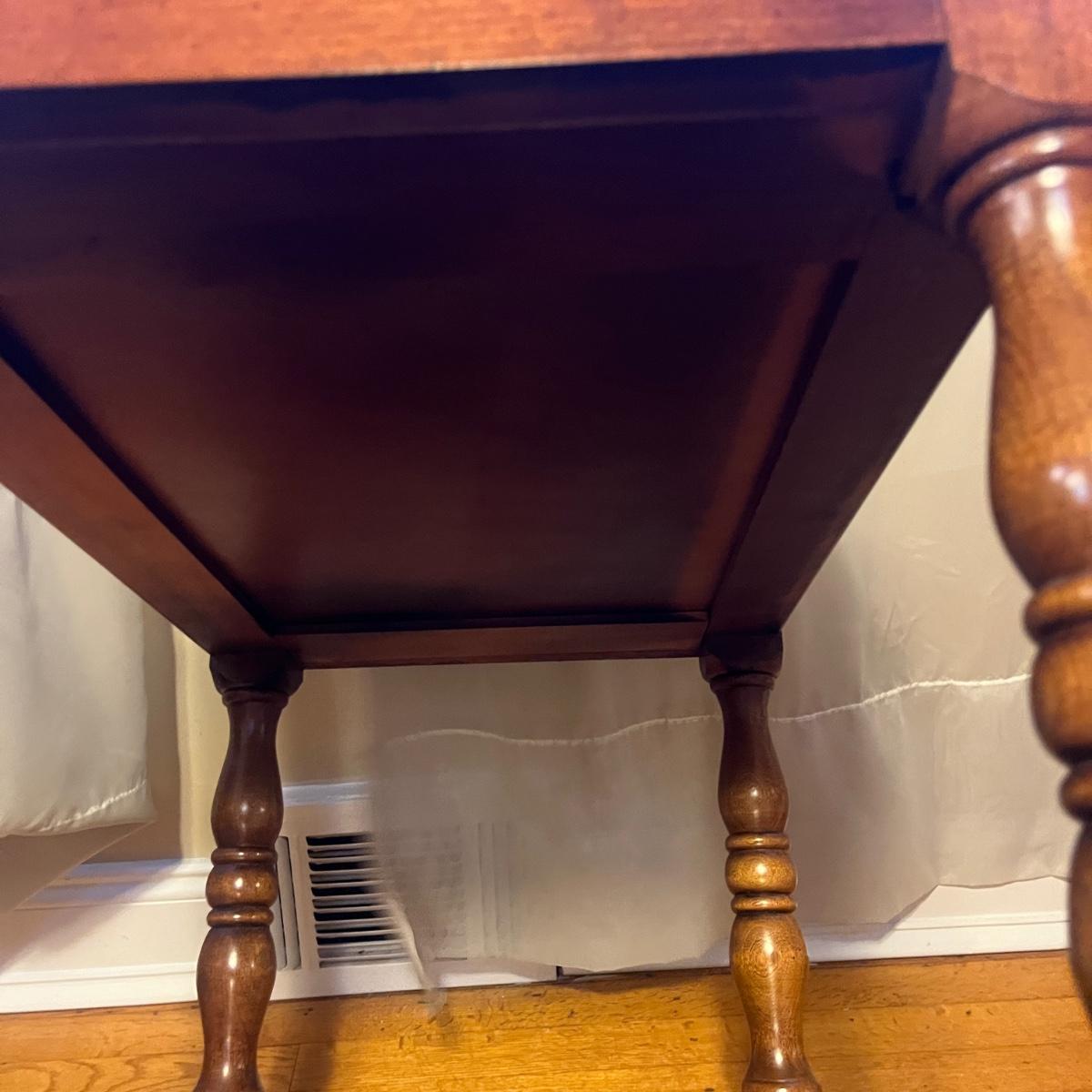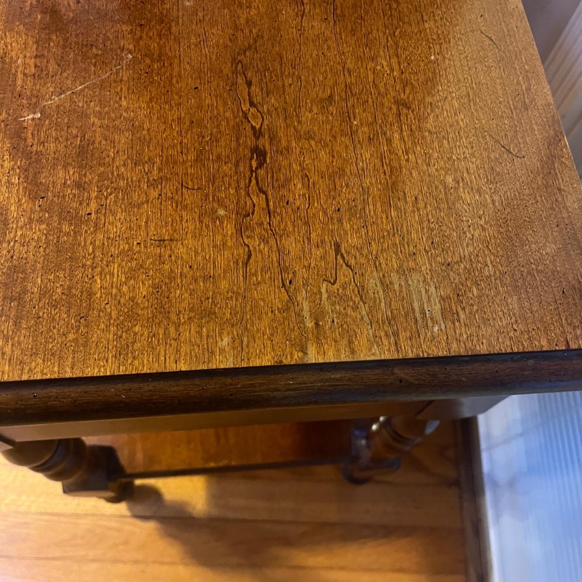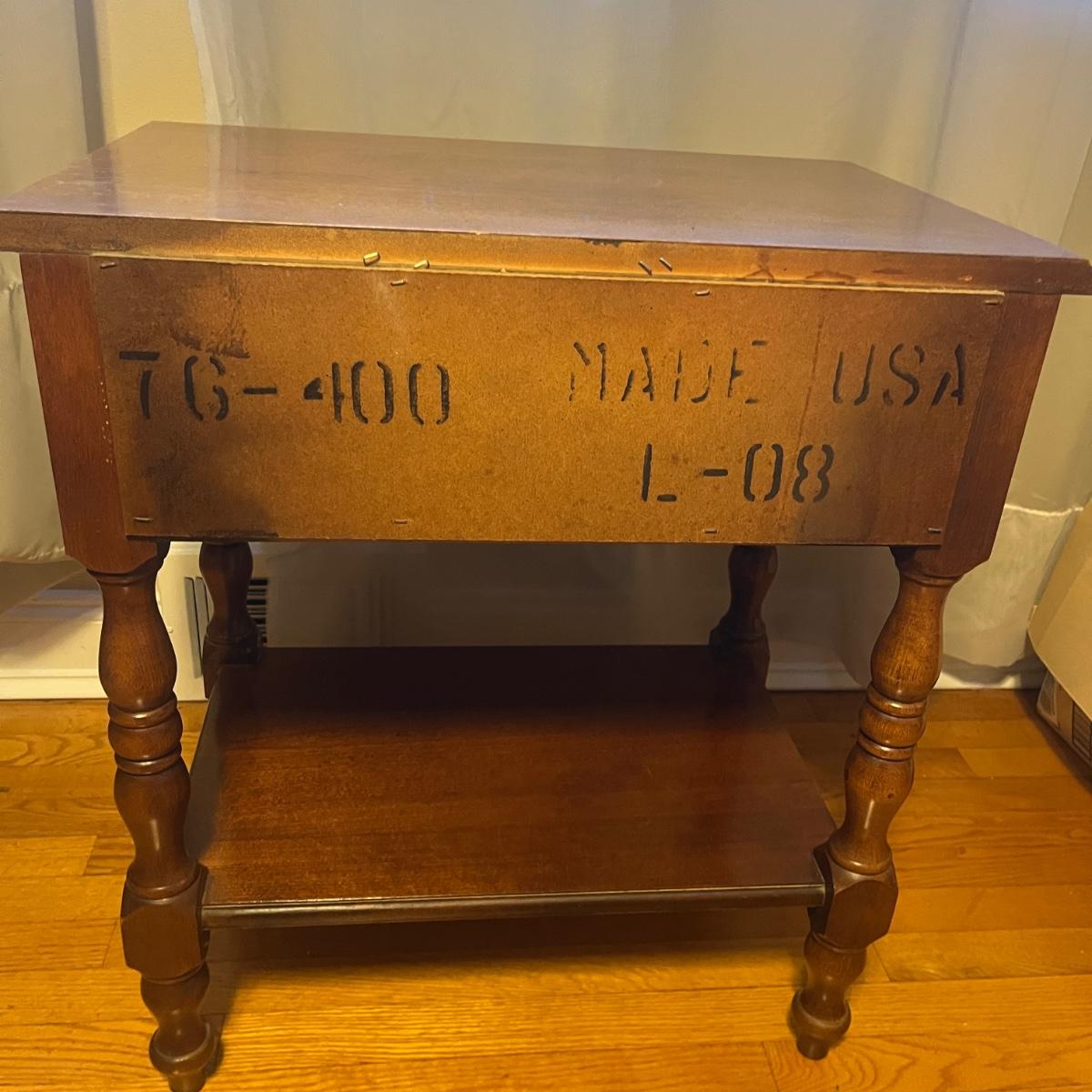 This solid wood American Drew end table has one drawer and a shelf underneath. Table measures 24” x 16” x 26.5”H. Top has finish wearing off in spots, see pictures.