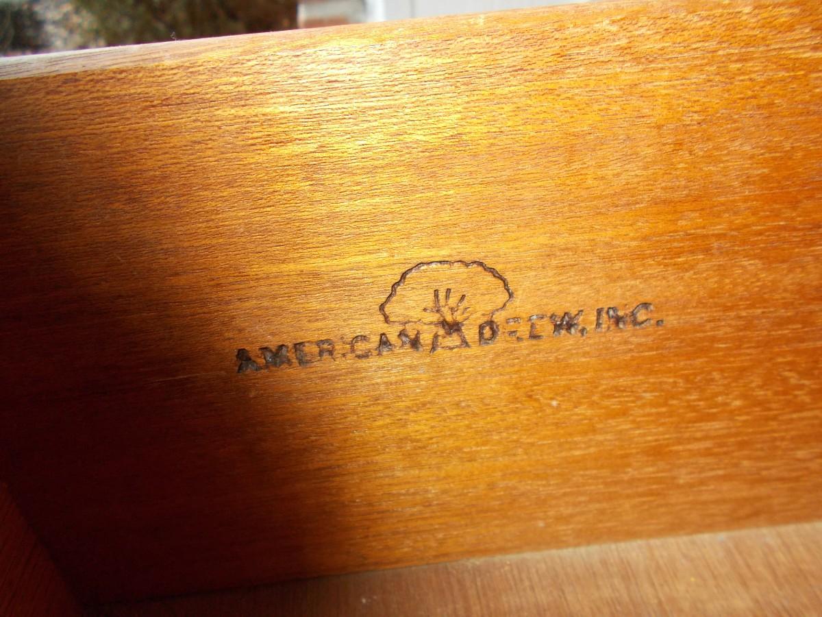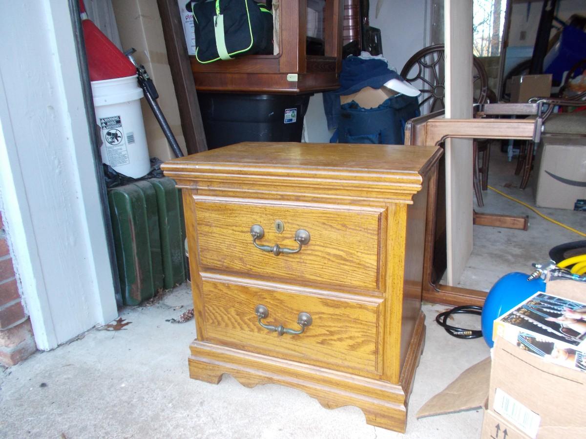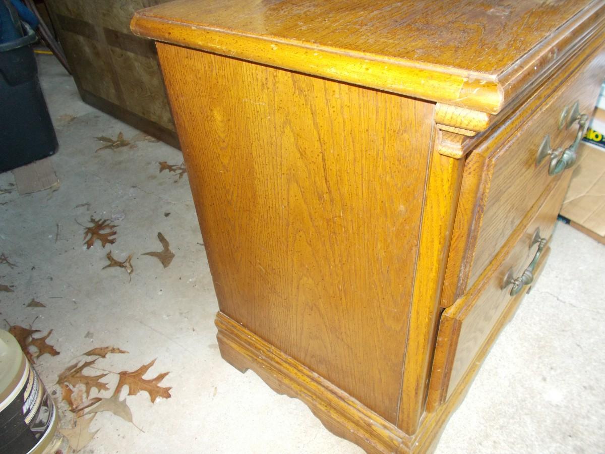 This solid oak nightstand has two drawers and is made by American Drew. It is in great condition but has a few blemishes in the finish on the top.