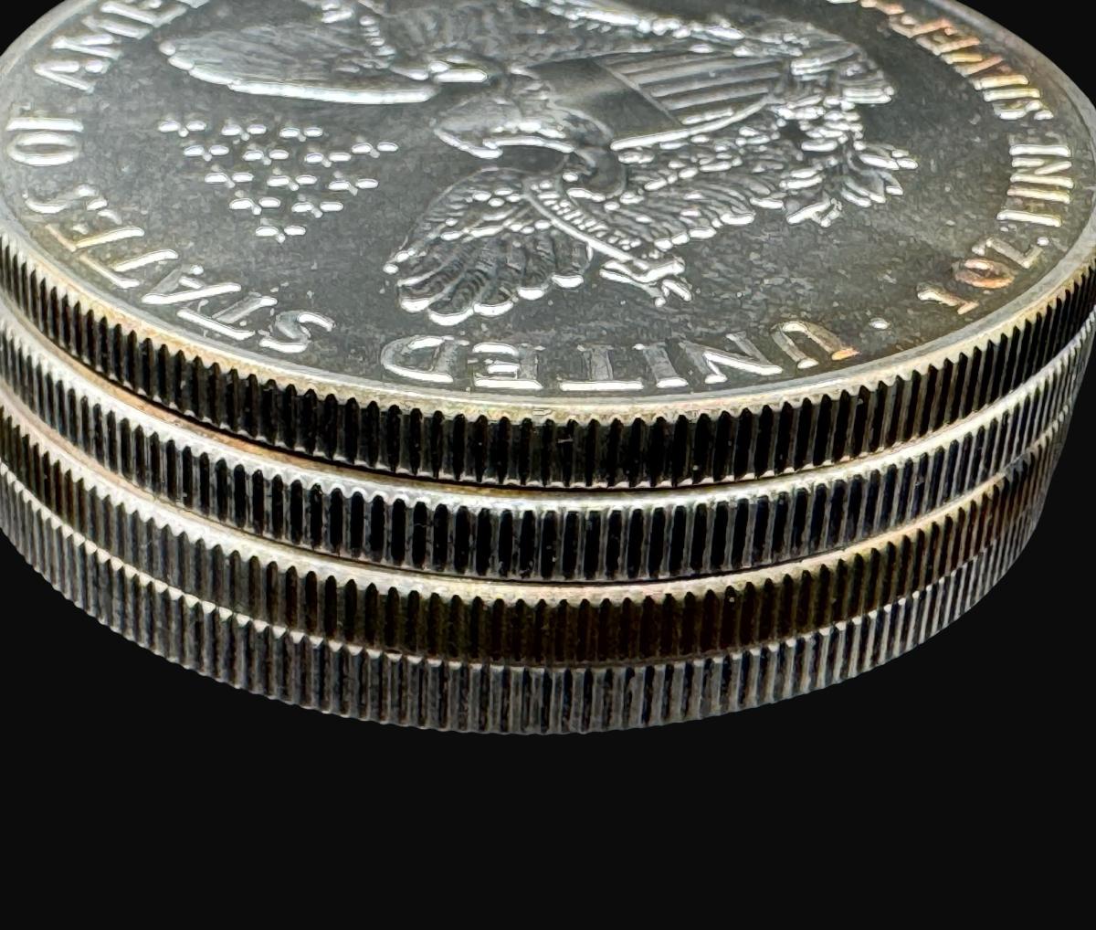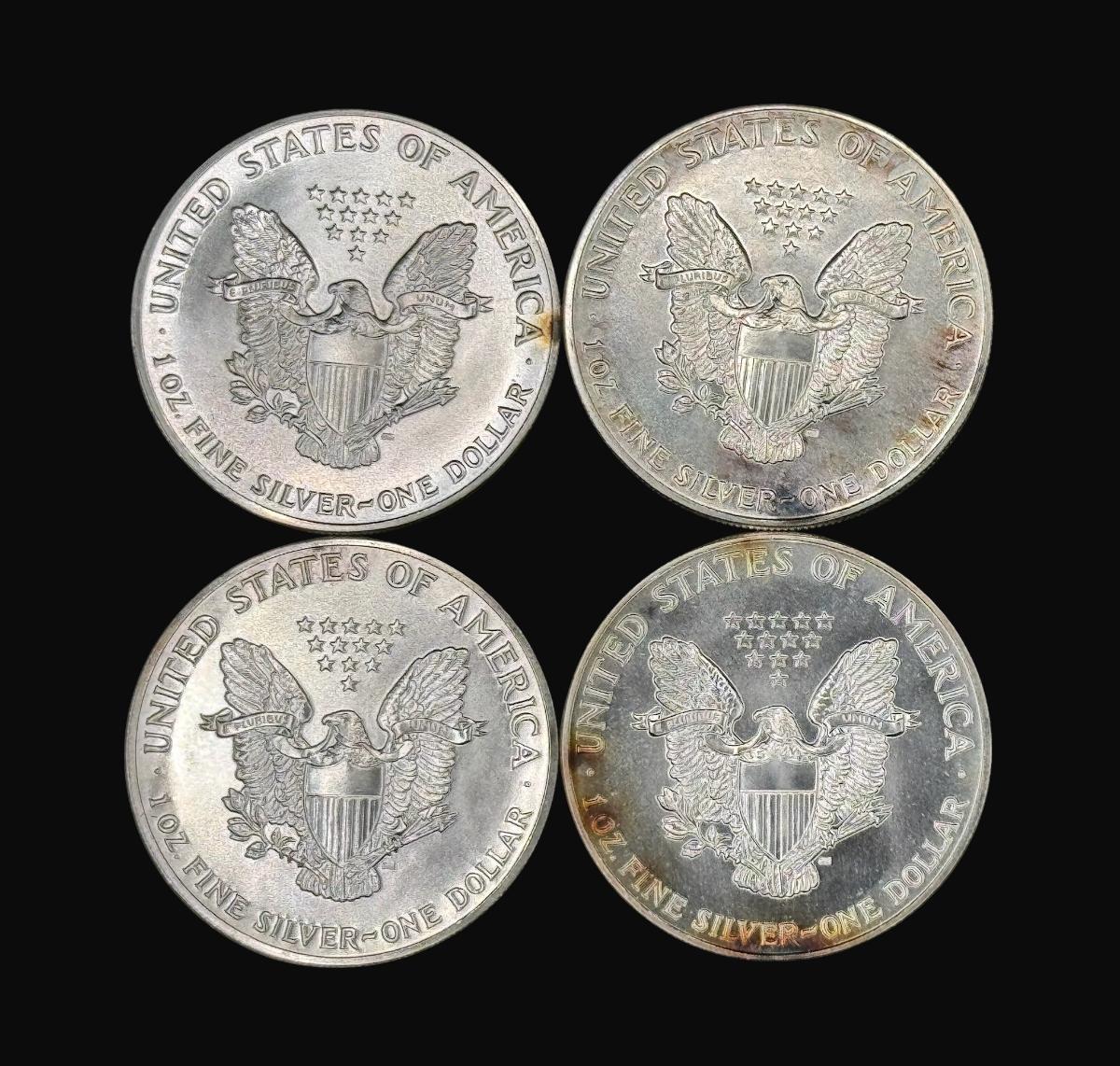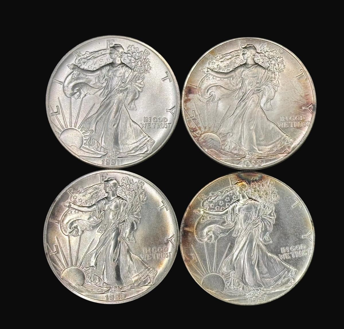 **WIRE TRANSFER IS REQUIRED IF SHIPPED.** Years include 1987, 1988, 1989, and 1991. Total of 4 pieces. All are believed to be uncirculated. Silver content is 90%. **ALL PRECIOUS METALS SALES ARE FINAL. NO REFUNDS WILL BE GIVEN FOR ANY REASON.** [AG]