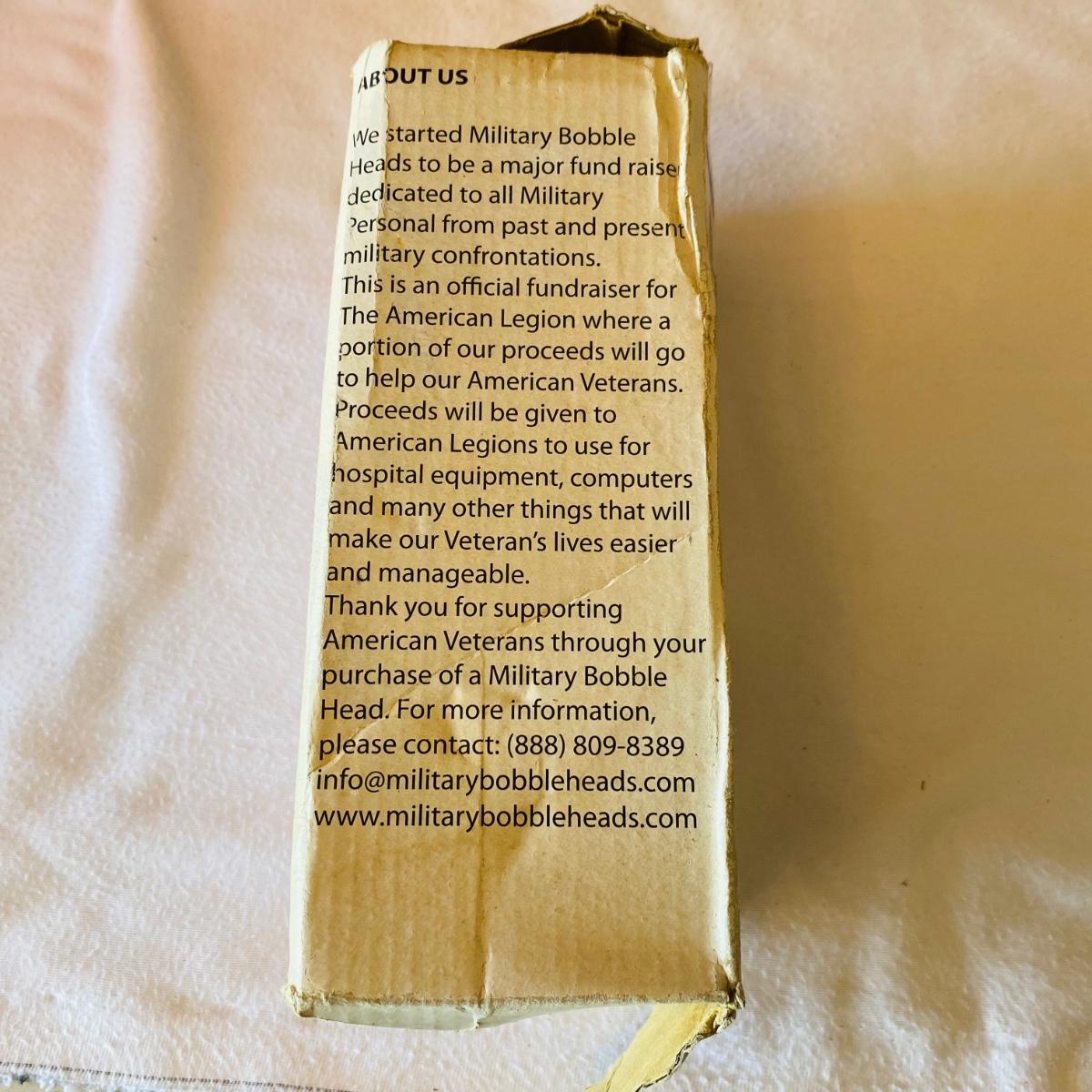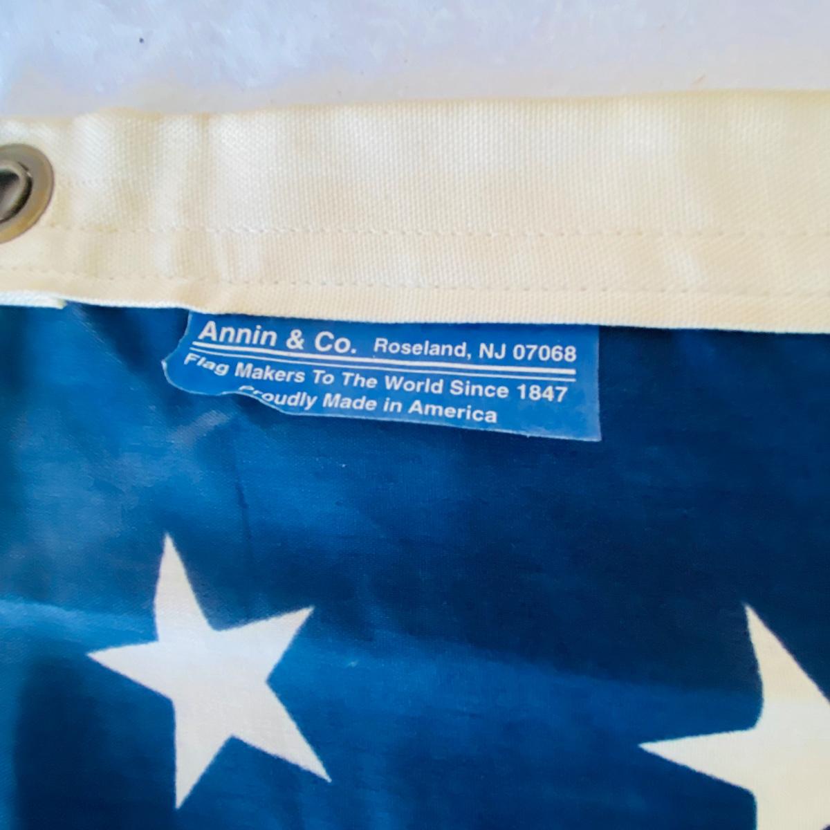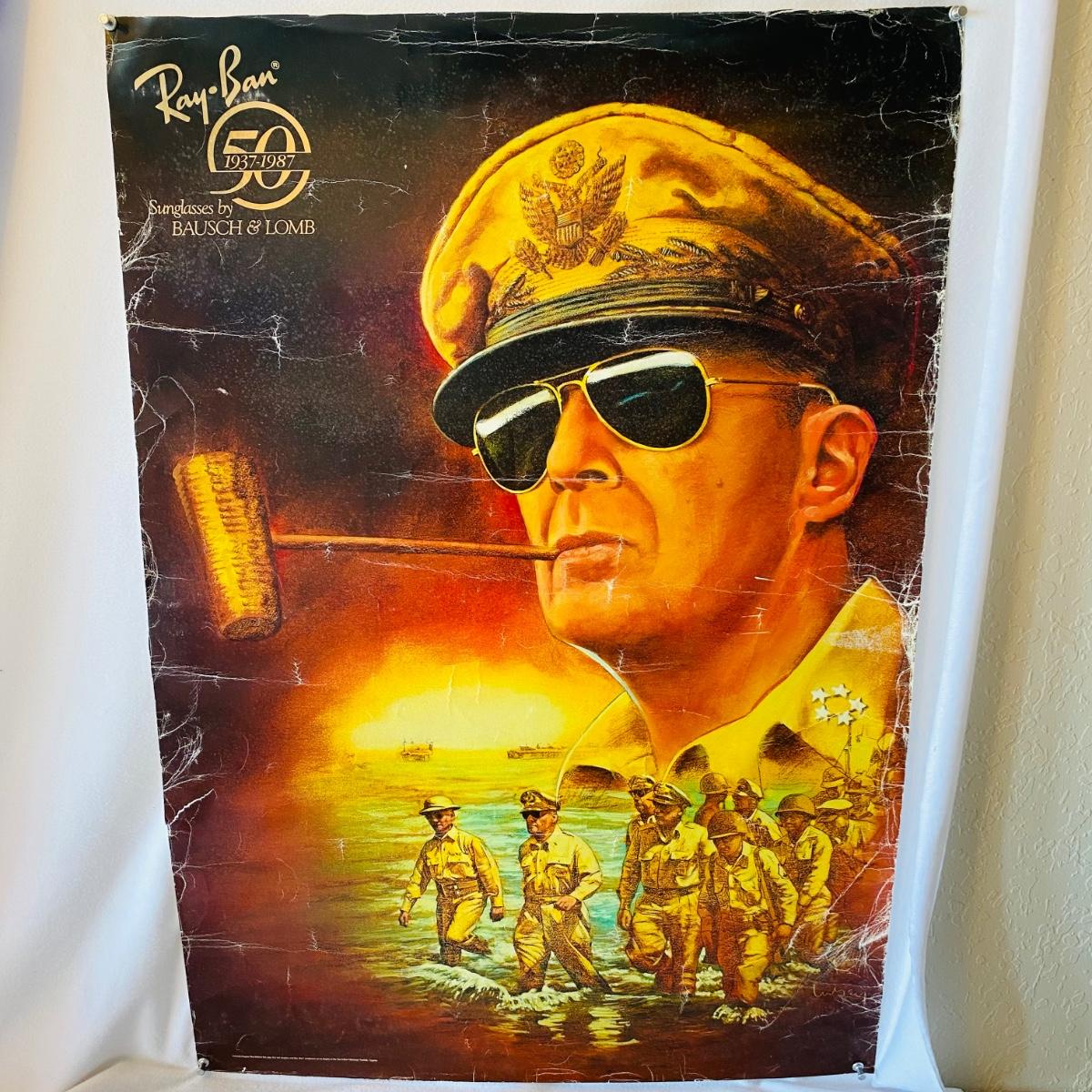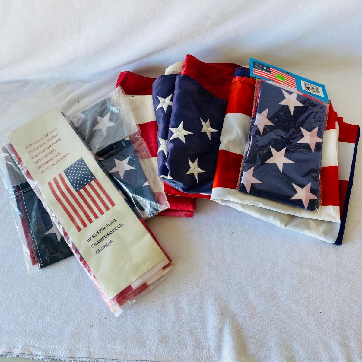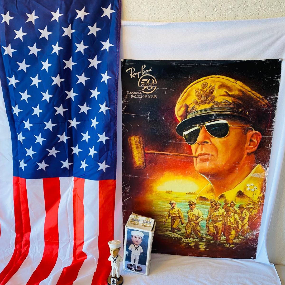 Lot includes six 3’ x 5’ American flags. Two of them are made by Annin Flagmakers. Good condition. Also includes 1987 Ray-Ban sunglasses poster with General MacArthur advertising Bausch and Lomb measures 24” x 34” in worn condition. 7” Limited Edition Navy bobble head by Bobbie Dobbles - Alexander Global Promotions.