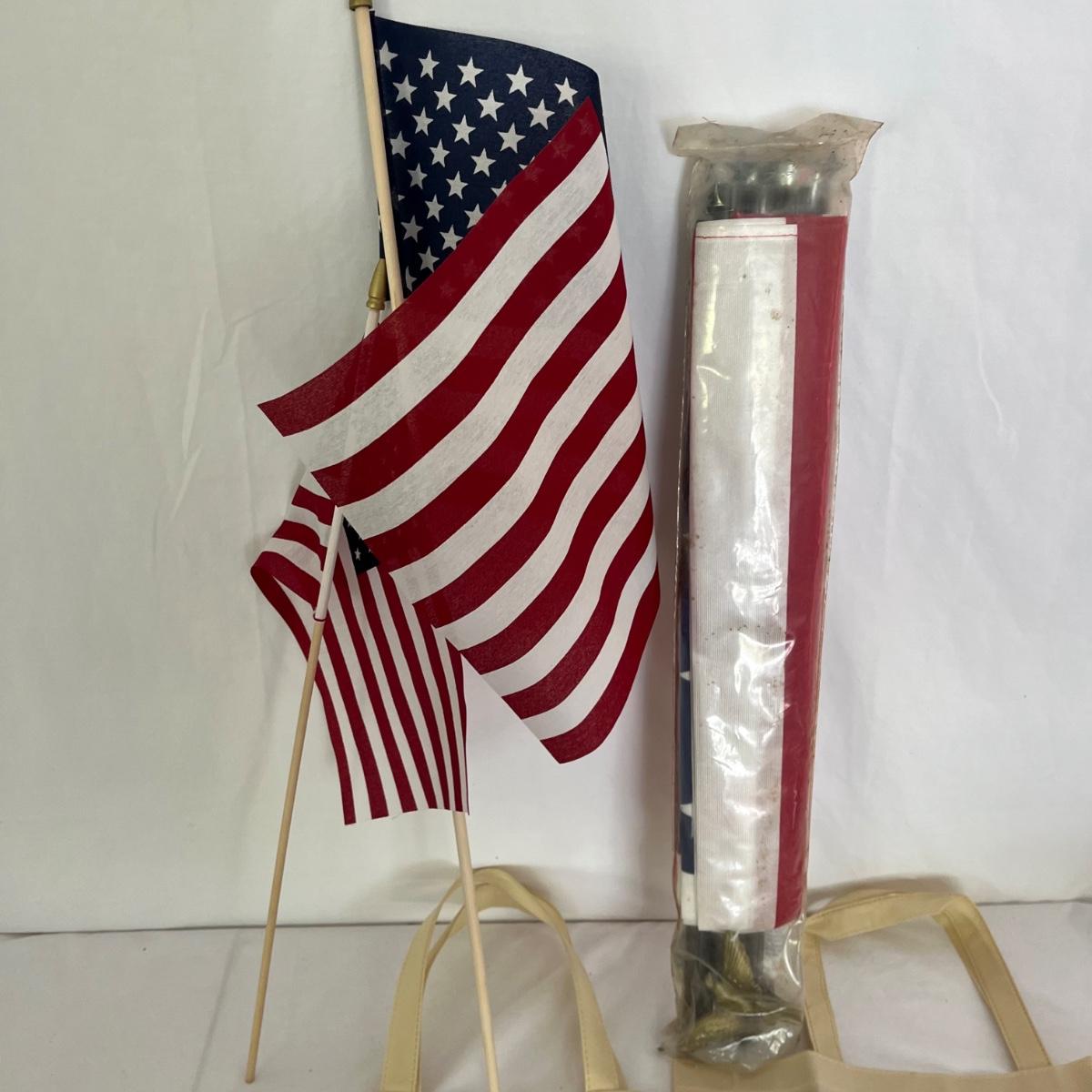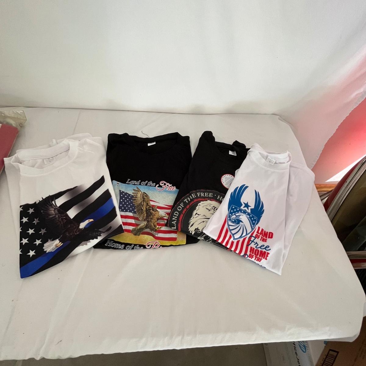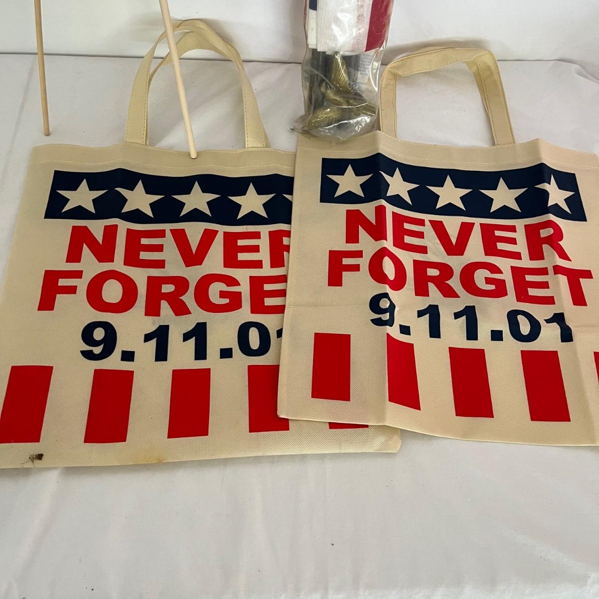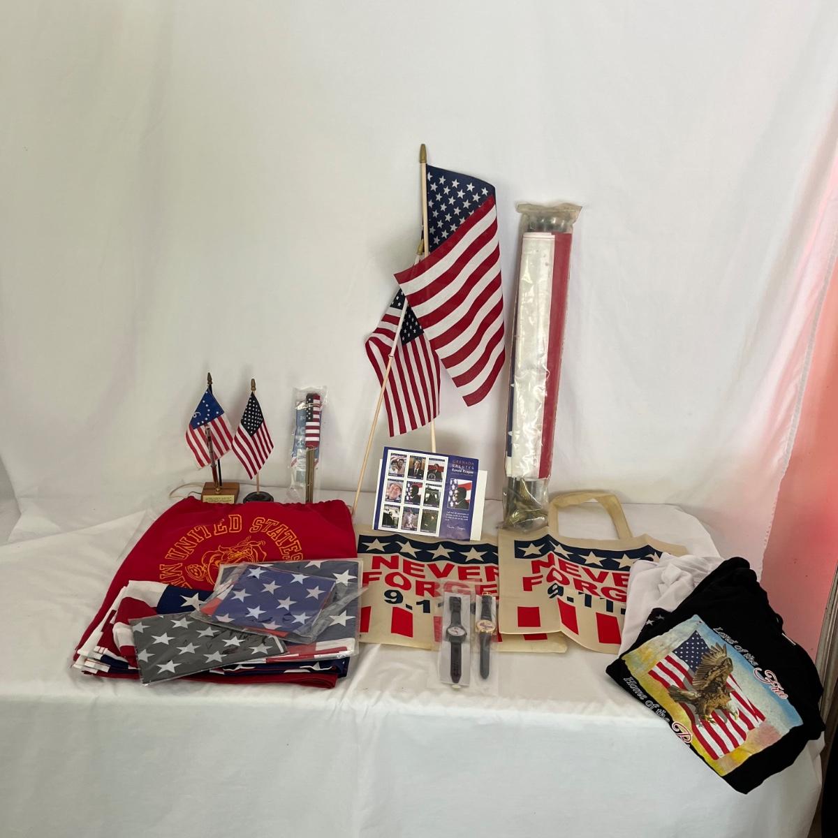 Lot includes American flags, 9-11 bags, four size large T shirts, Bill Clinton & American flag watches that were not tested. Also includes mini American flags.