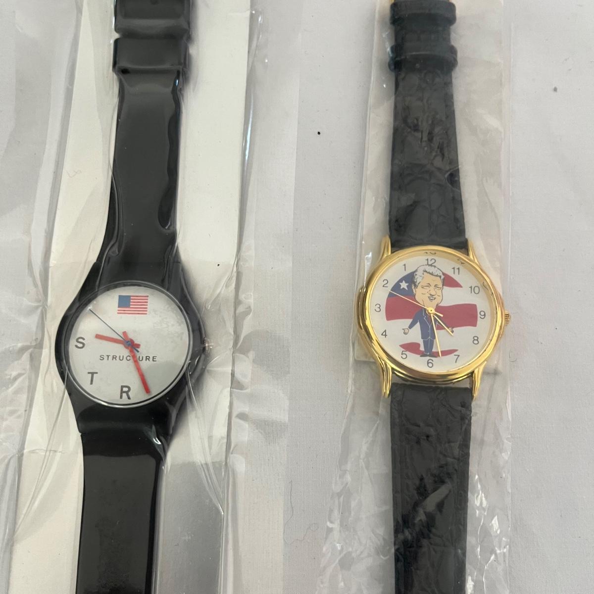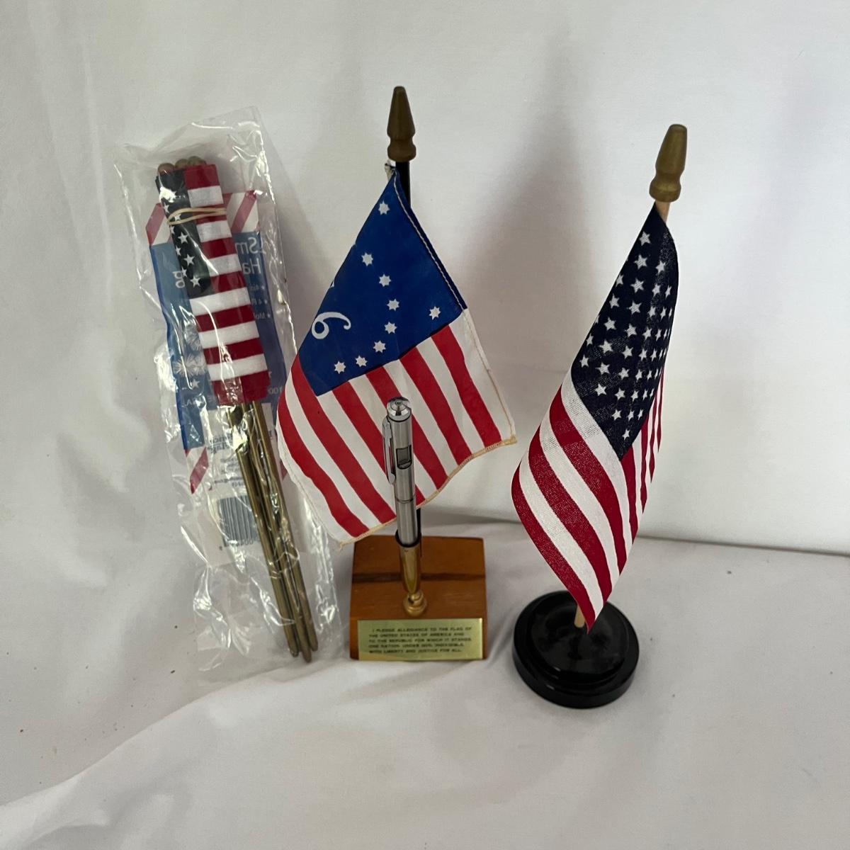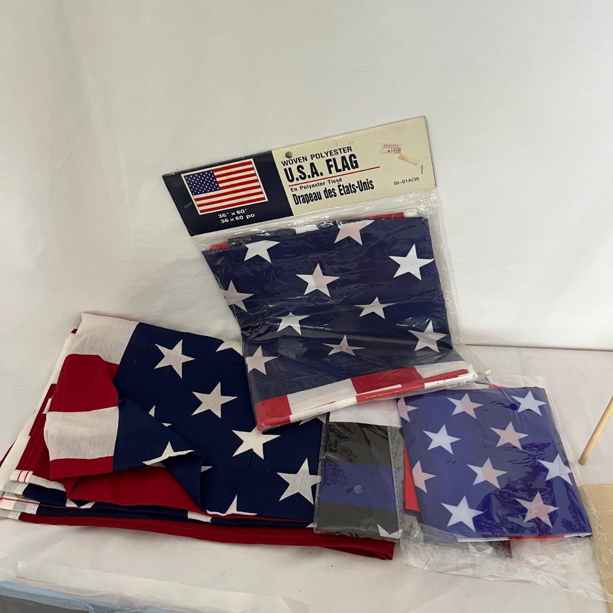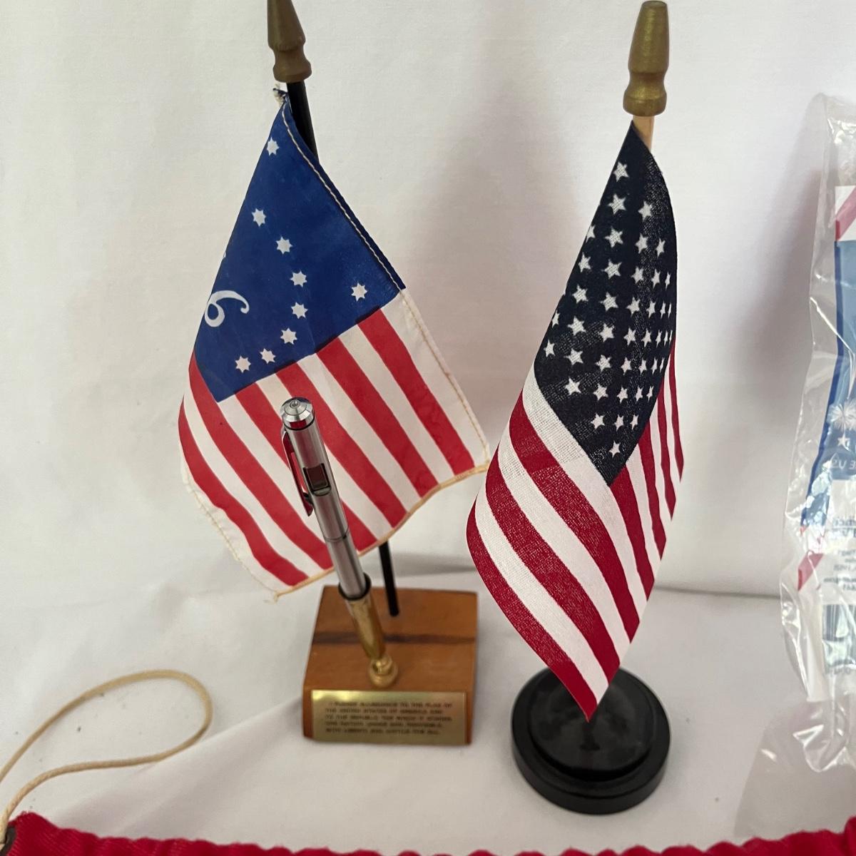 Lot includes American flags, 9-11 bags, four size large T shirts, Bill Clinton & American flag watches that were not tested. Also includes mini American flags.