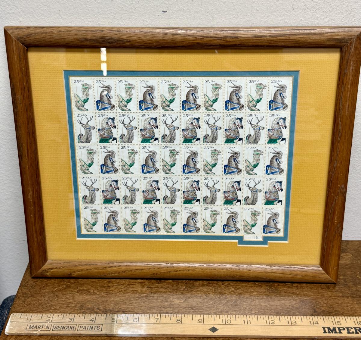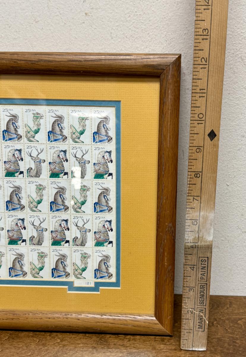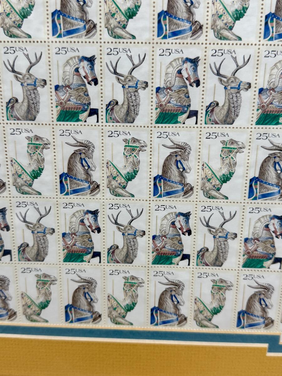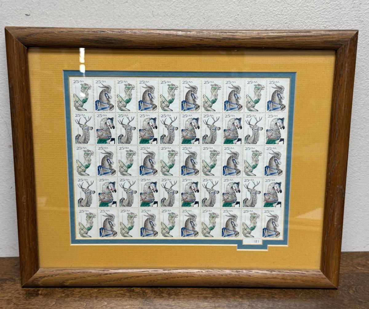 American Folk Art Carousel Animals U.S. Postage 25 cent Stamps full sheet (50 stamps) Framed