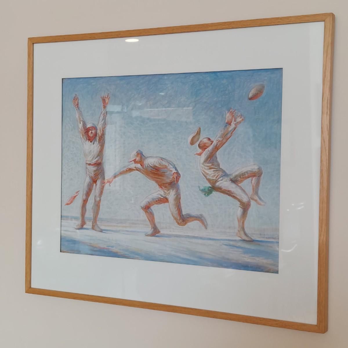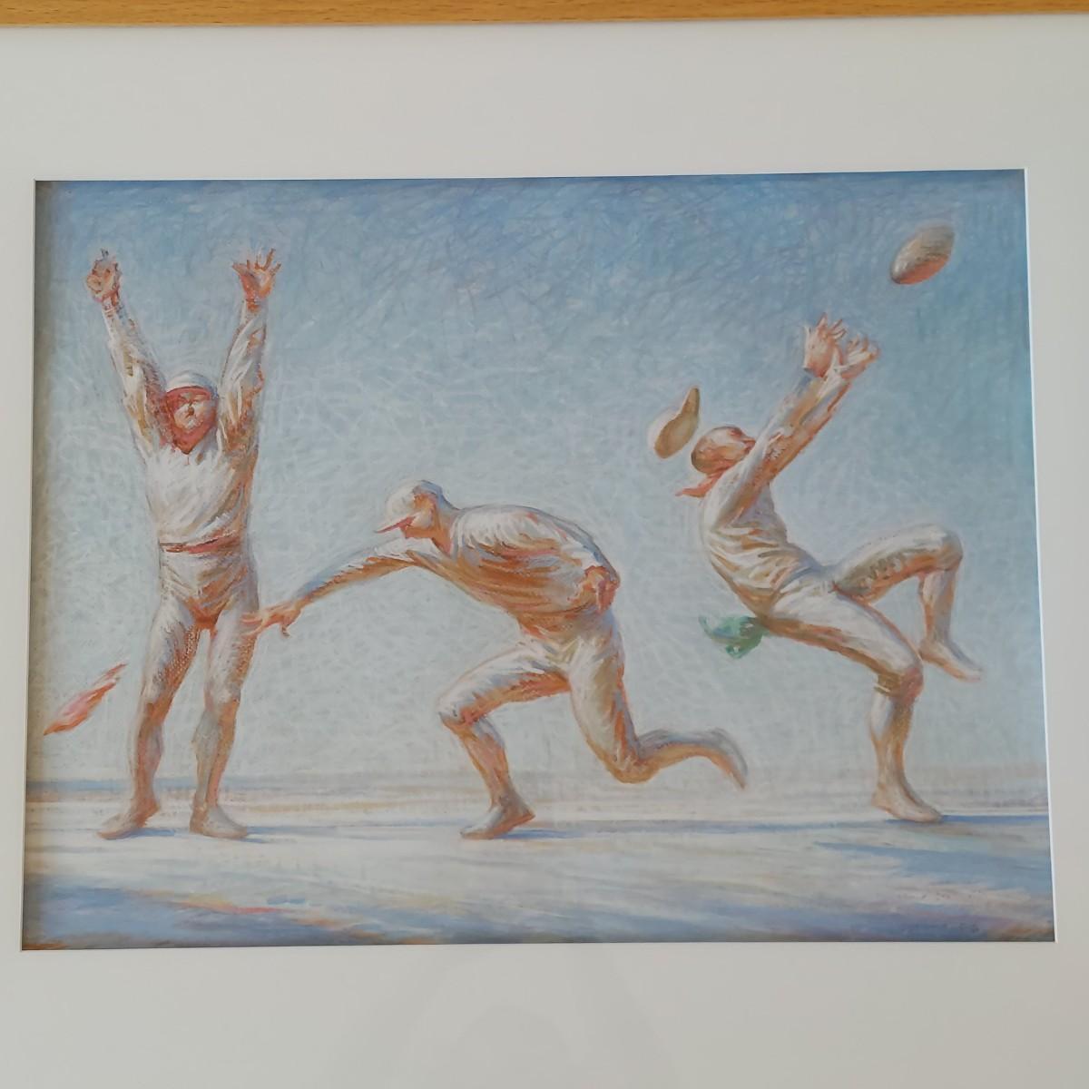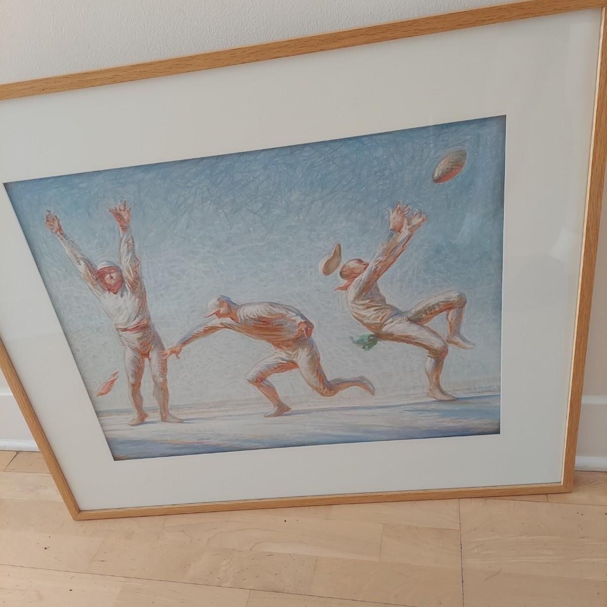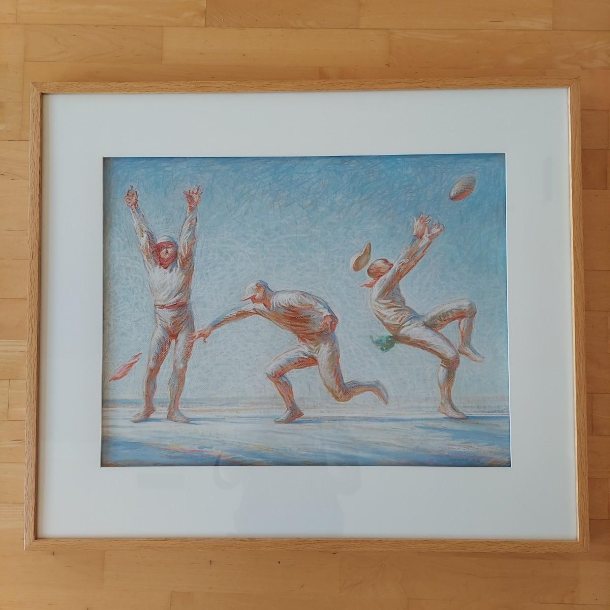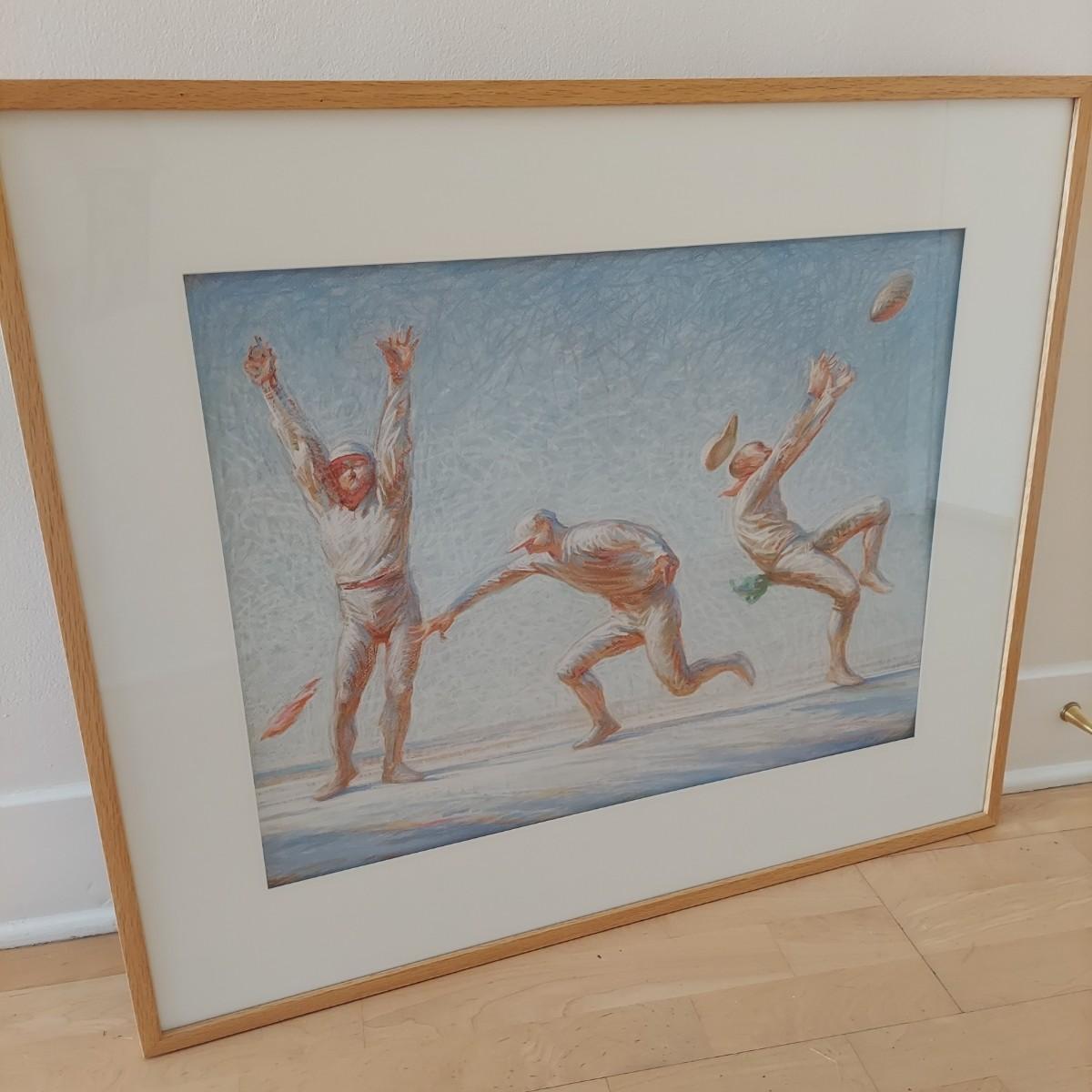 Large print of American football in a classic style scene. Piece is matted and framed under plexiglass. Appears to be pencil signed but the signature is indistinguishable. Wooden frame measures approximately 34” x 29"H. Please see photos for details. Shipping available. Shipping certain items can be costly. We suggest contacting our preferred local shipping provider, Postage Express, with dimensions and getting an estimate before bidding: (828) 255-9250 or shipping@postageexpressnc.com