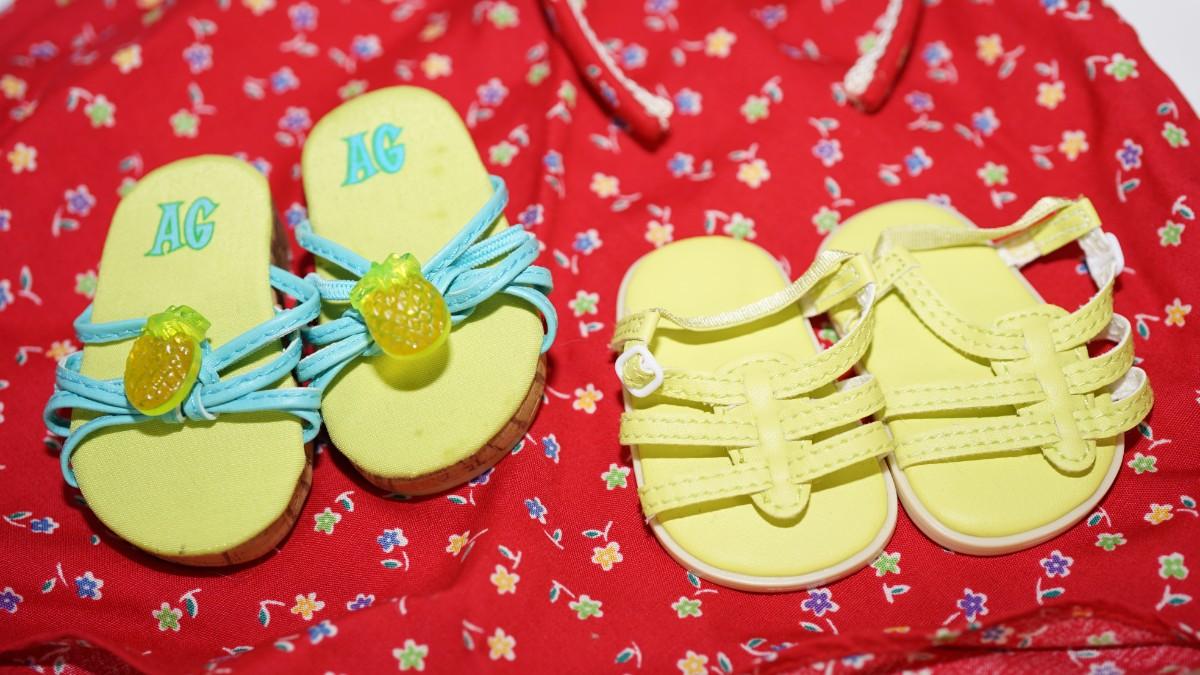 two pairs of sandals with one pair with plastic mini pineapples.