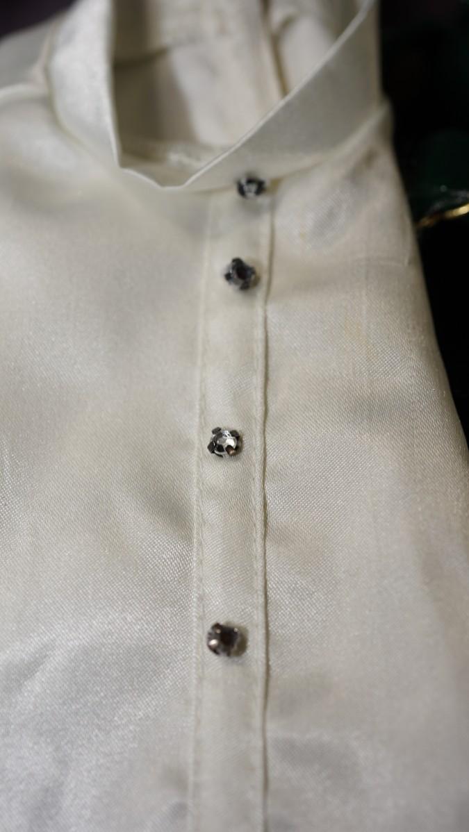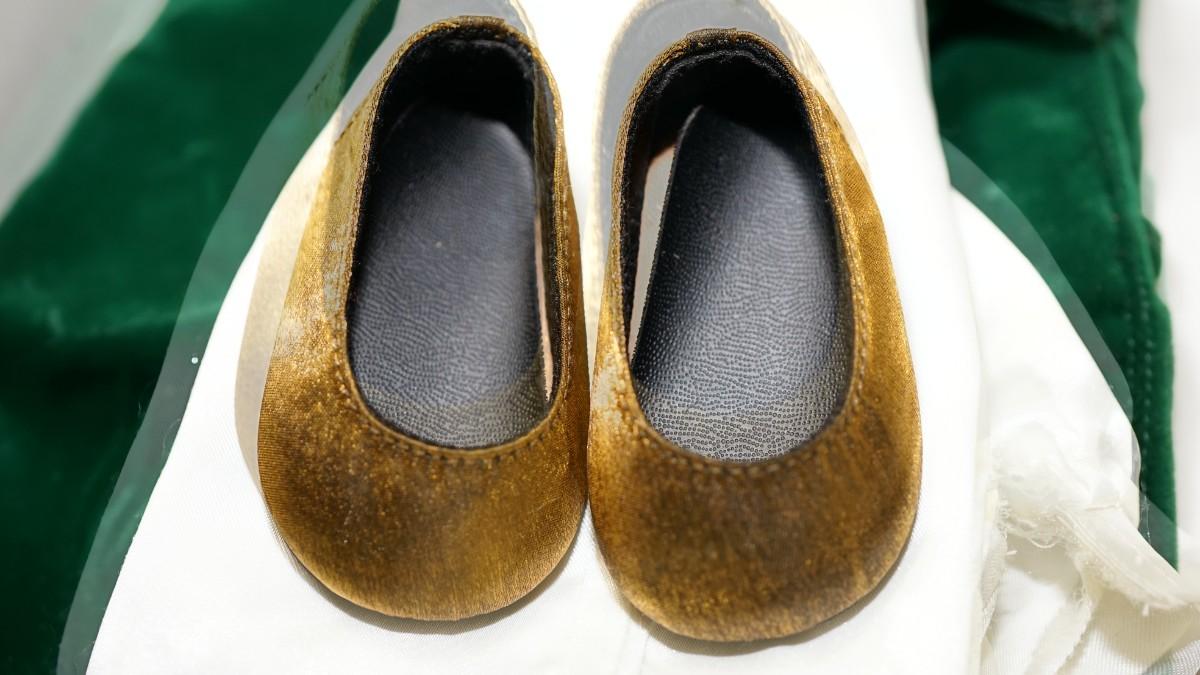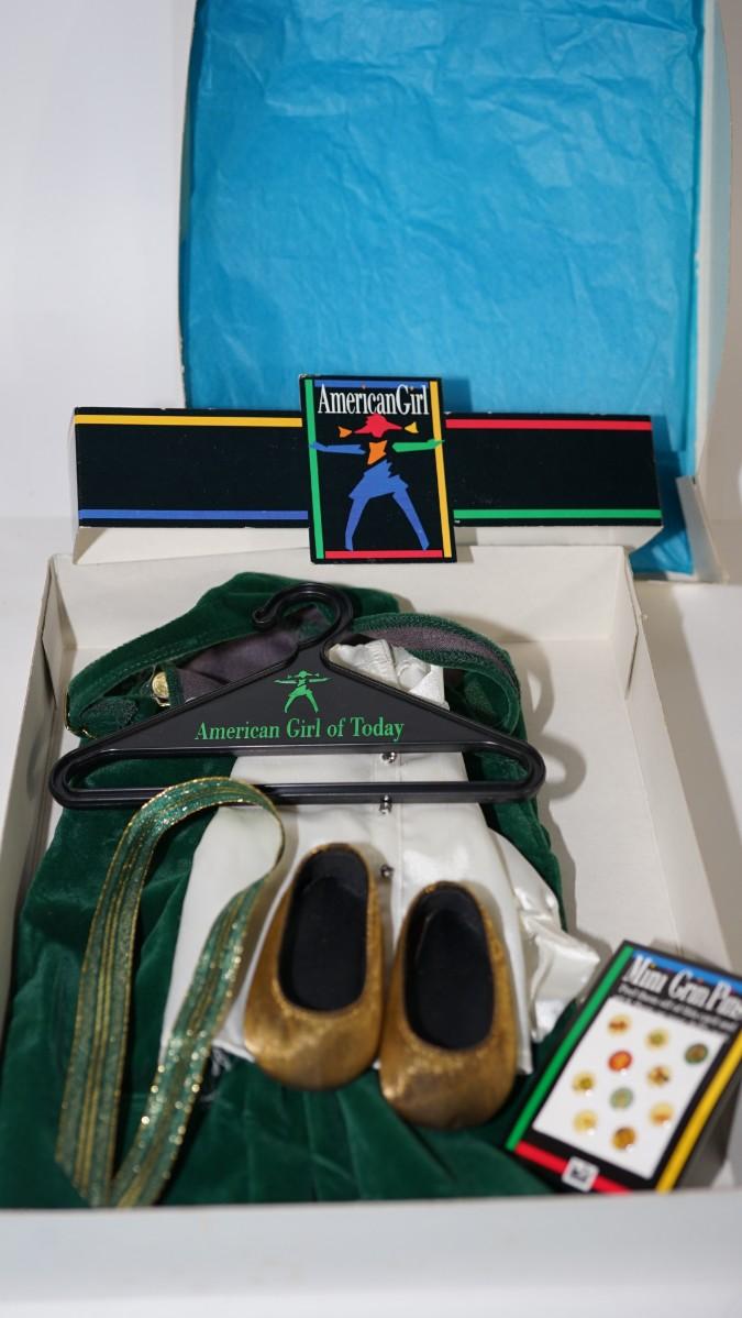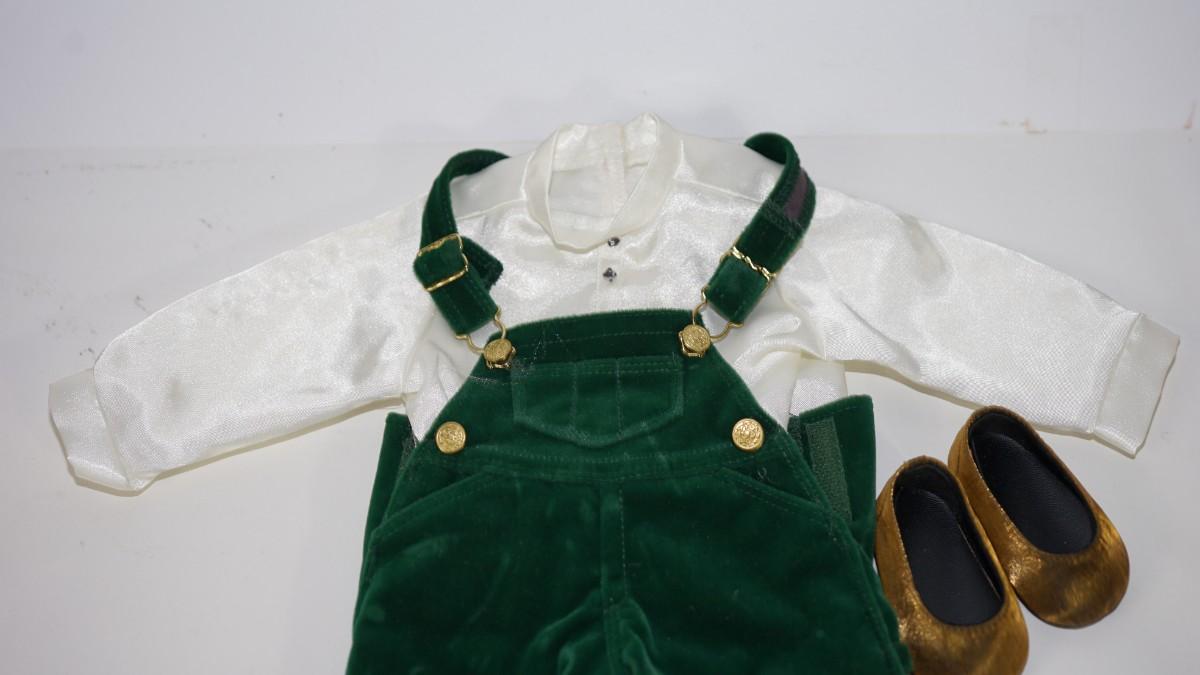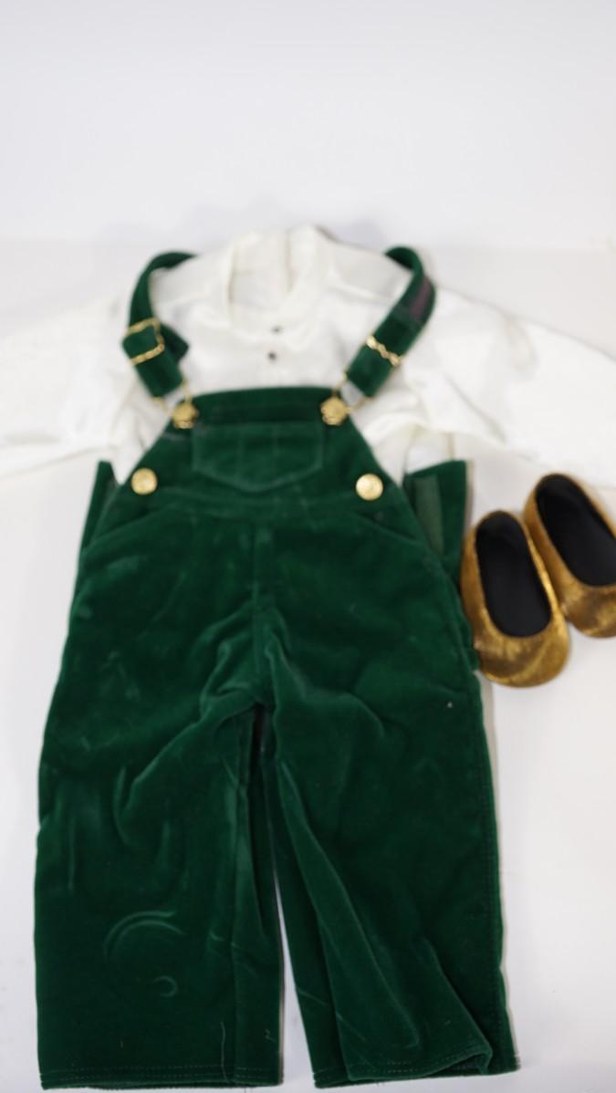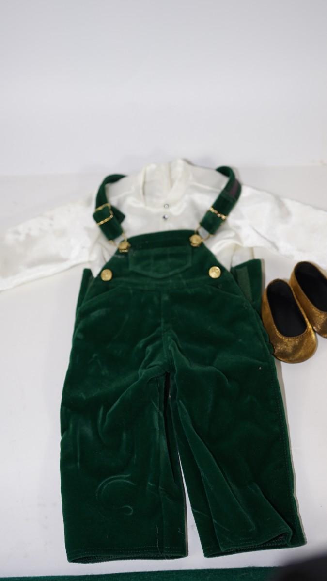 AMERICAN GIRL DOLL OUTFIT OF GREEN VELVET BIBS/ SATIN STYLE LONG SLEEVE SHIRT AND GOLD TONE SHOES