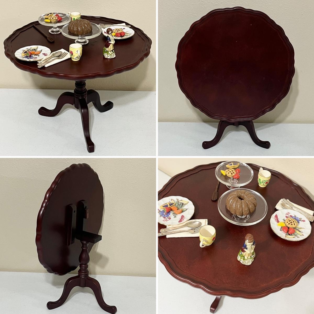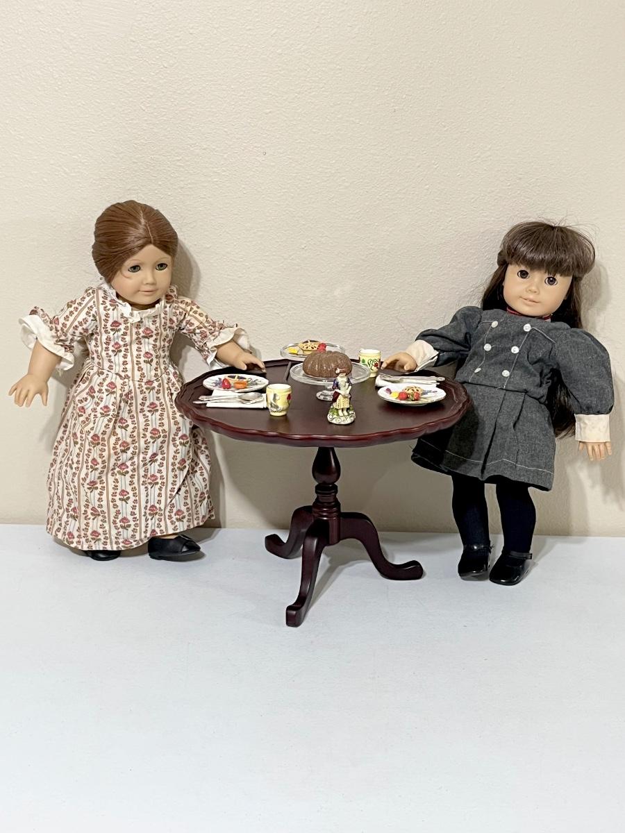 Both dolls are 18” H ~ Table 10” H x 14” Round ~ (27) Plates & food