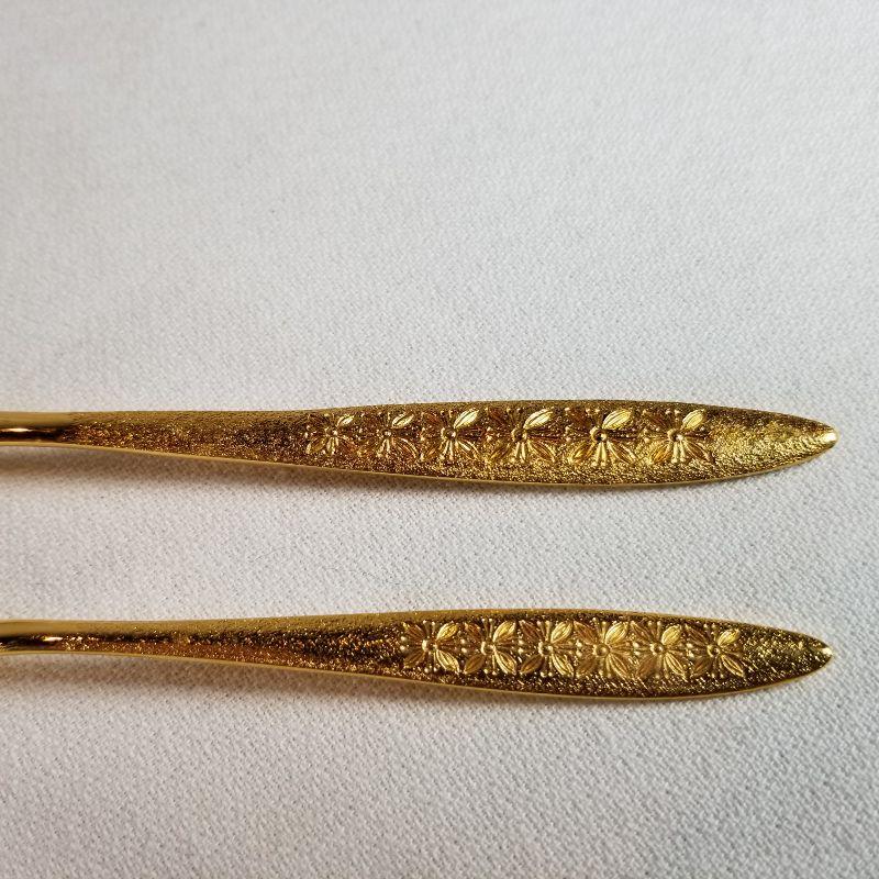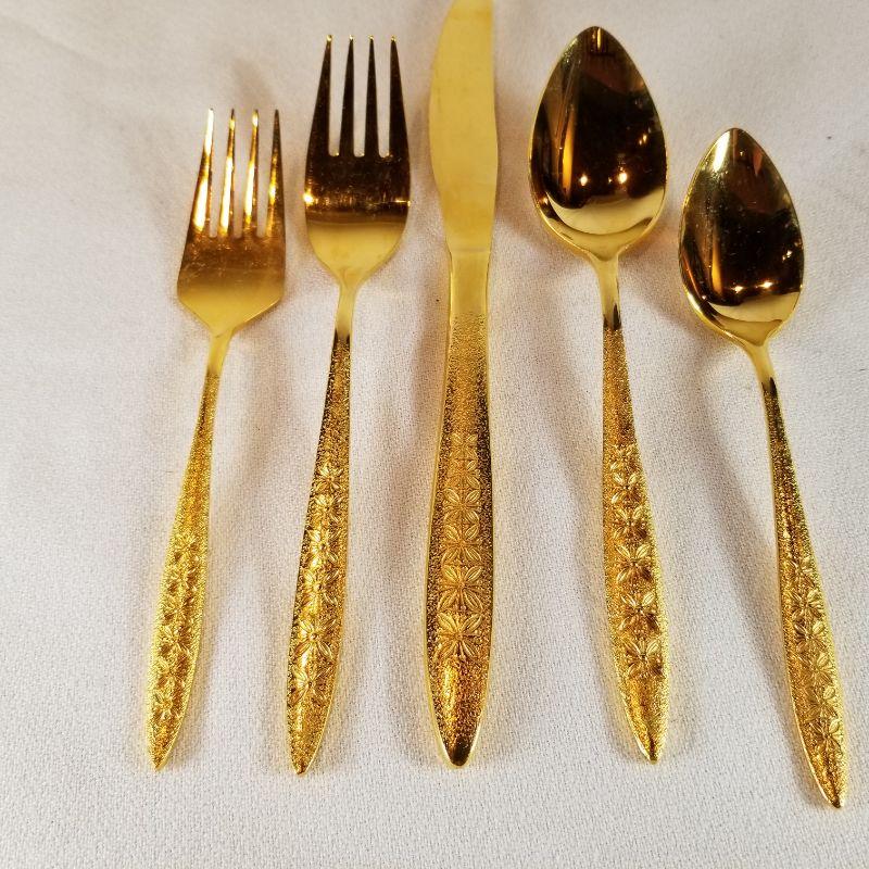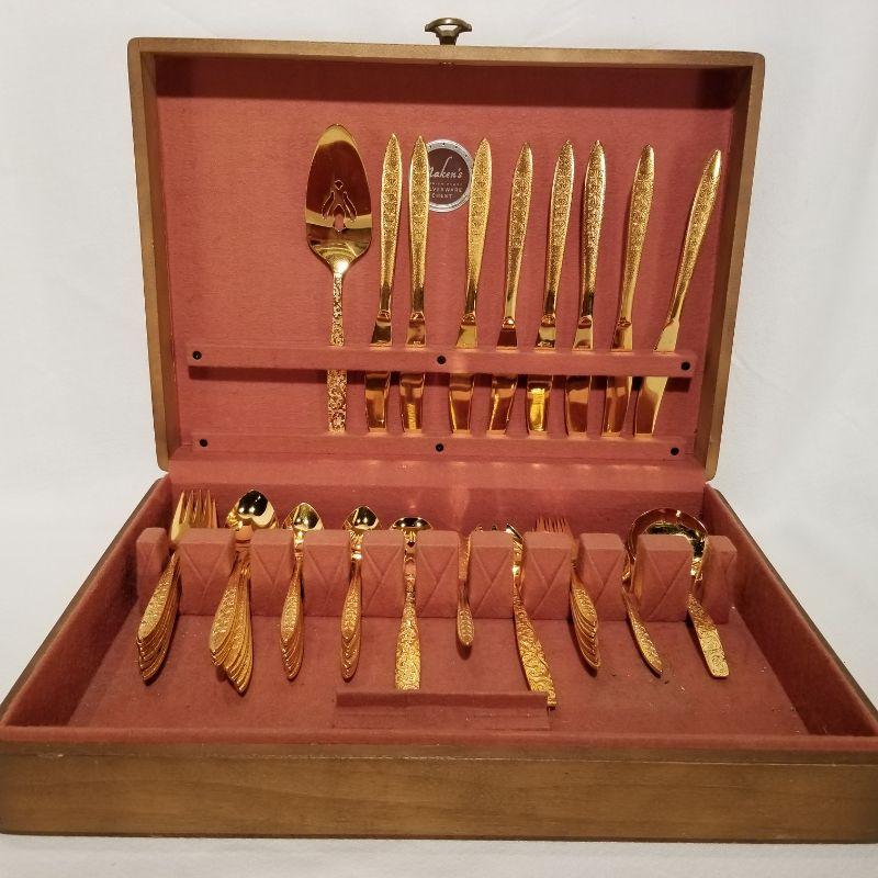 Complete service for Eight - American Golden Heritage. In sturdy, wooden, anti-tarnish silverware box. Marked Japan. The set includes: 8 soup spoons, 16 teaspoons, 8 dinner knives, 8 dinner forks, 8 salad forks, sugar spoon, butter knife, pie server, large serving spoon and fork.